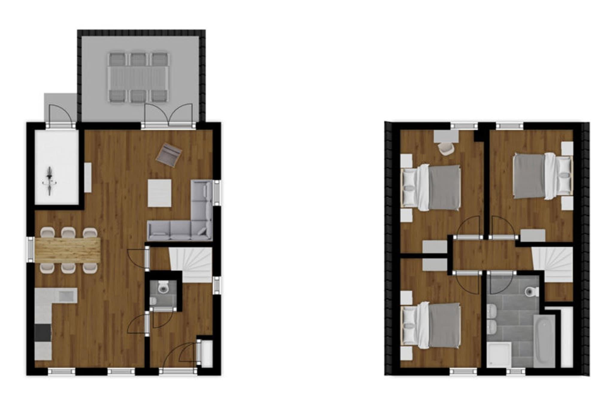 Stueetage: (entre(toilet), Stue(Fjernsyn(digital)), åbent køkken(komfur(gas), kaffemaskine(kopper), combi-mikroovn, opvaskemaskine , køle-fryseskab)) På 1. etage: (soveværelse(dobbeltseng eller 2 enkeltsenge Senge), soveværelse(dobbeltseng eller 2 enkeltsenge Senge), soveværelse(dobbeltseng eller 2 enkeltsenge Senge), badeværelse(badekar, bruser, 2x håndvask, toilet), Repos) terrasse, have, havemøbler