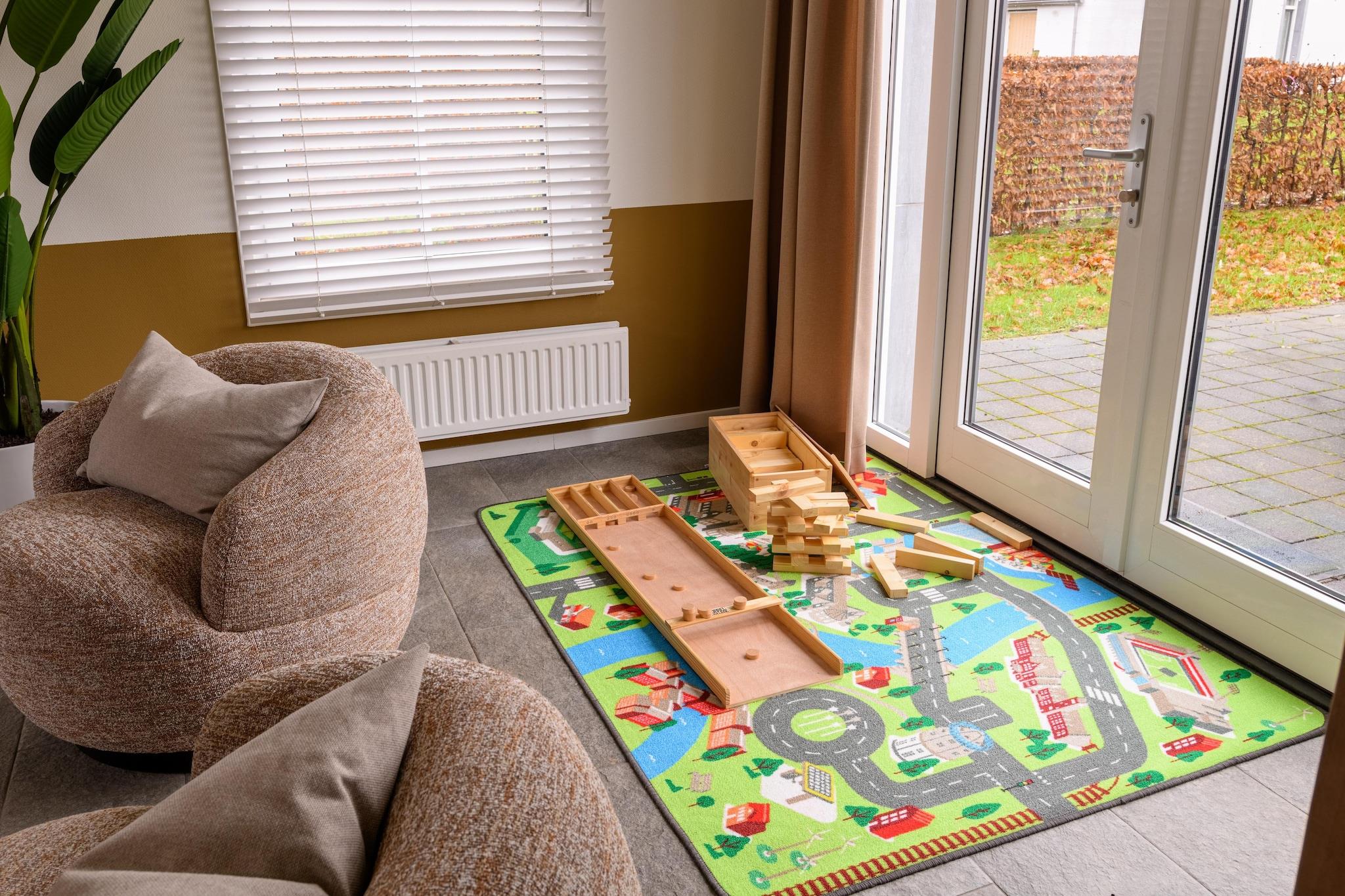 The kids villas that were completed in mid-2018 are on spacious plots, in the Kids Quarter at the large Maastricht Resort. The Kids Quarter has a shared "courtyard" with various playground equipment. The villas are fully equipped for (grand) parents with small children. The interior is comfortable, modern and atmospheric. There is a spacious living room with cosy wood stove. In the modern open kitchen you will find various equipment, including a microwave, dishwasher and Nespresseo coffee maker. On the first floor there are three bedrooms. Two of the bedrooms have single box-spring beds which may or may not be set up as a double bed. The third bedroom is a children's bedroom with a bunk bed. There is one bathroom with a shower, bathtub, double sinks and a toilet. There is also a washing machine. There are two baby gates, child-safe plugs and there is additional child inventory. This consists of toys and a gaming console. Outside you will find a garden enclosed by a low hedge and an entrance gate. In the garden you have a terrace and garden furniture. There is parking space for one car at the villa.