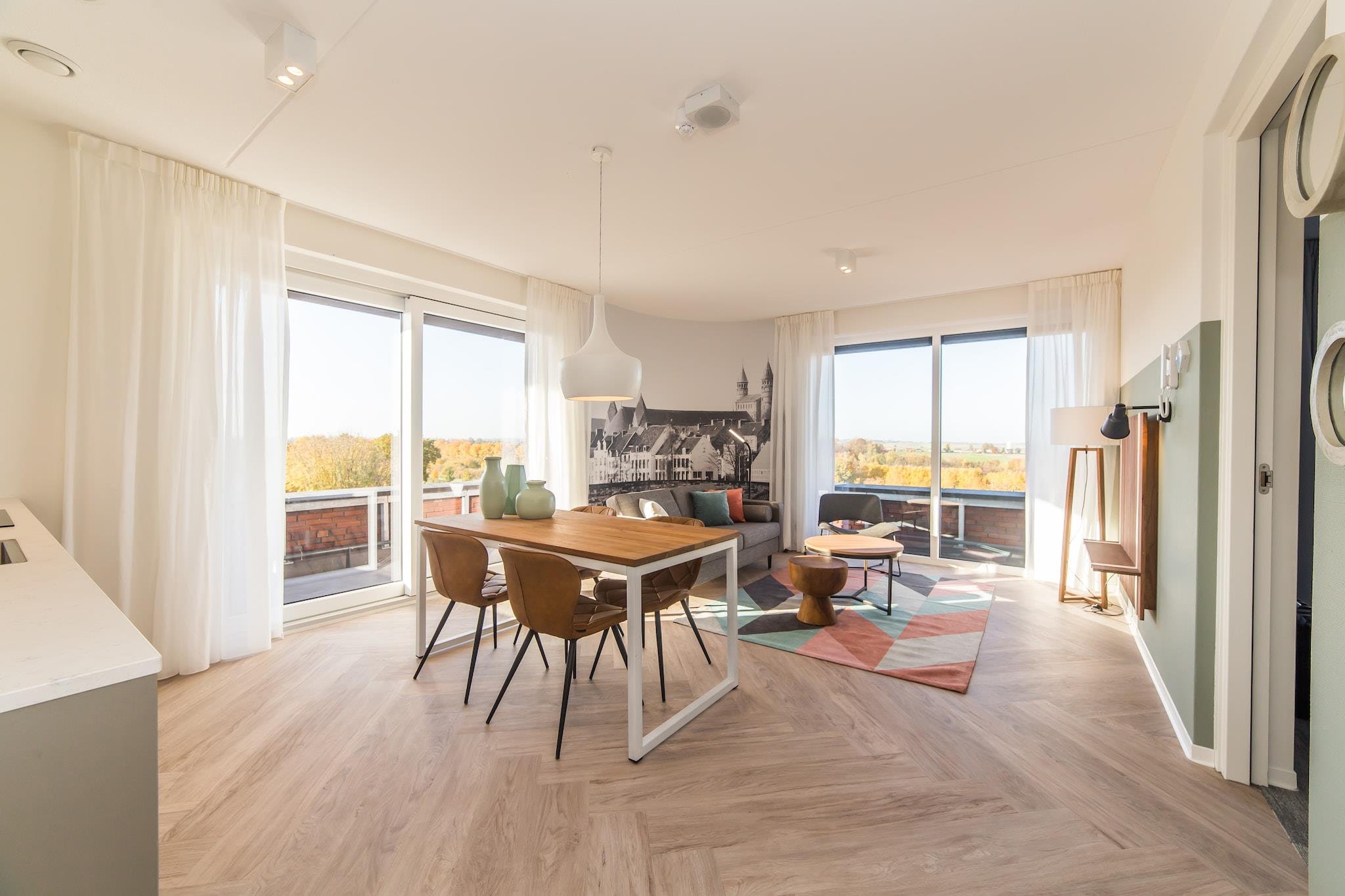 Bo med stil i denne smukt indrettede lejlighed i det 4-stjernede "De Prins van Oranje" hotel, beliggende i det frodige Resort Maastricht. Med panoramaudsigt over de bølgende belgisk-limburgske bakker tilbyder dette rummelige oase en suite forbundet med et andet soveværelse via en privat gang - perfekt til familier eller venner, der rejser sammen. Nyd din morgenkaffe fra balkonen eller terrassen, og oplev ultimativ afslapning med to private badeværelser og et elegant, fuldt udstyret køkken. Du er kun 4 km fra Maastrichts pulserende centrum, hvor charmerende brostensbelagte gader, boutiquebutikker og caféer ved floden venter. Spis middag på hotellets øverste etage på den berømte Rantree restaurant, der tilbyder eksklusivt køkken parret med en flot udsigt over byens skyline. Omkring Wilhelmusplein, kun en kort gåtur væk, finder du lokale bagerier, markeder og kæledyrsvenlige terrasser til en hyggelig frokost udendørs. Tag dit kæledyr med - Maastricht er utrolig hundevenlig! Tag naturskønne vandreture gennem de nærliggende Dousberg-stier eller besøg Stadspark, hvor kæledyr kan strejfe frit. Flere nærliggende caféer tilbyder vandskåle og godbidder, hvilket får din pelsede ledsager til at føle sig lige så forkælet. Med to elevatorer, nem adgang og grønne åbne områder sikrer denne lejlighed komfort for både dig og din firbenede rejsekammerat.