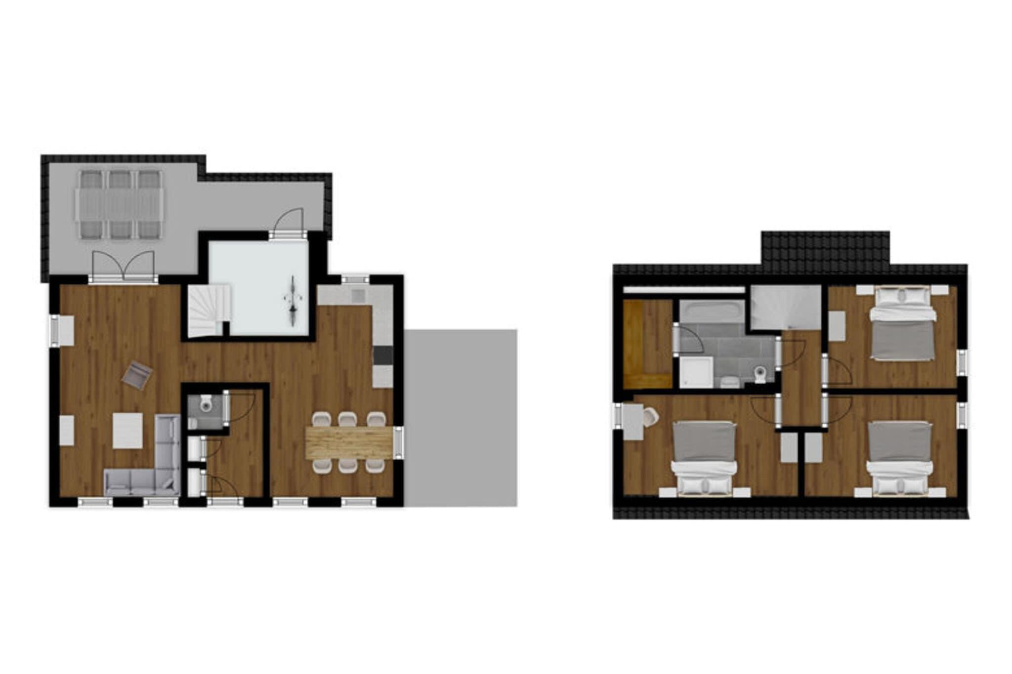 Stueetage: (entre(toilet), Stue(Fjernsyn(fladskærm, digital), spisebord, kakkelovn(træ), sofahjørne), åbent køkken(kogeplade(induktion), elkedel, brødrister, kaffemaskine(kopper), combi-mikroovn, opvaskemaskine , køle-fryseskab)) På 1. etage: (soveværelse(dobbeltseng eller 2 enkeltsenge Senge, Fjernsyn), soveværelse(dobbeltseng eller 2 enkeltsenge Senge), soveværelse(enkeltseng, enkeltseng), badeværelse(Bubble bath, bruser, sauna, håndvask, toilet), Repos) pulterkammer, terrasse(overdækket), have, havemøbler, grill, parkering, loungemøbler