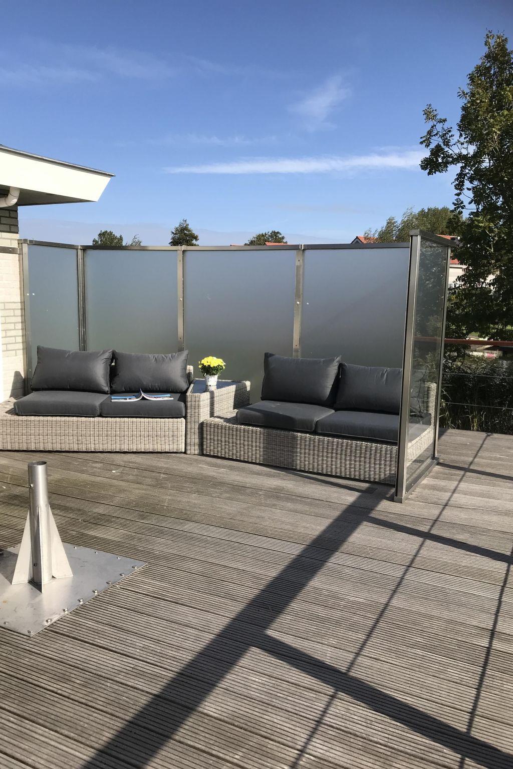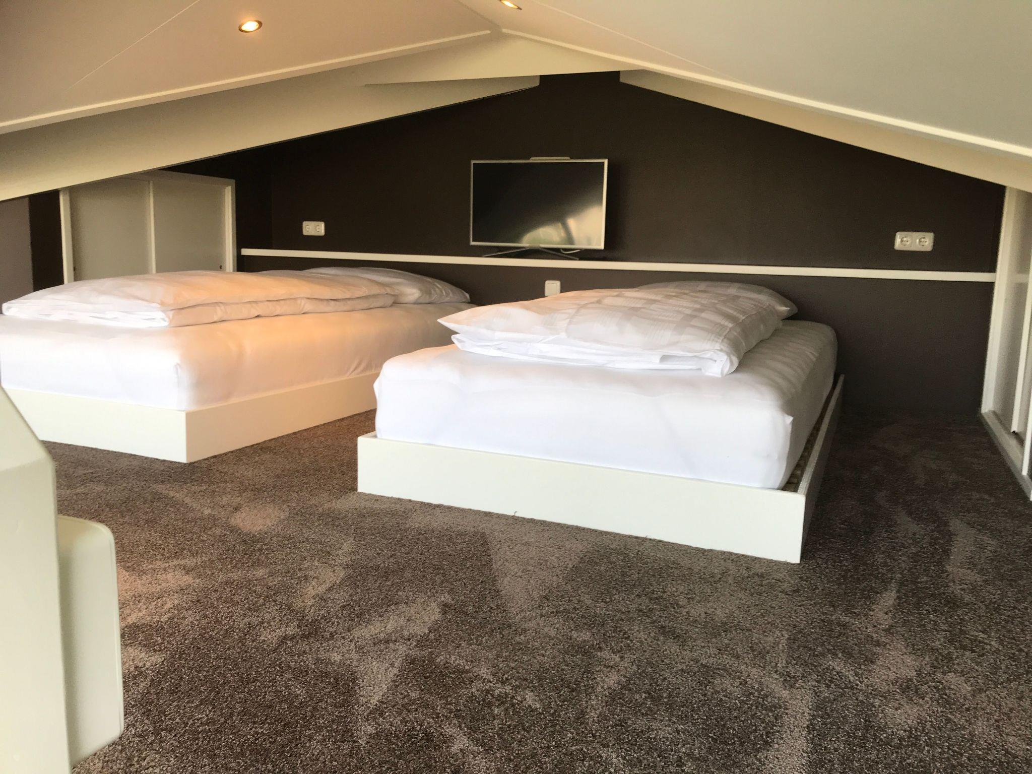 The holiday home has 4 bedrooms and a converted floor without standing height (highest point approx. 1.60 metres), where you will find 2 sleeping places for 1 person each. 3 bedrooms are equipped with a double bed 1.80 x 2.00 metres. The 4th bedroom has a single bed. It is possible to create another sleeping accommodation by pulling out another mattress under the single bed. However, this bedroom is very small. One bathroom is equipped with a whirlpool and a washbasin. The WC is located directly next to the bathroom. A 2nd bathroom is equipped with a shower/sun shower, a washbasin, a toilet and a washing machine/dryer combination. The living room and the kitchen and dining area are approximately 50 square metres in size. The view here is very nice. You can also access the terrace with an outdoor jacuzzi directly from here.