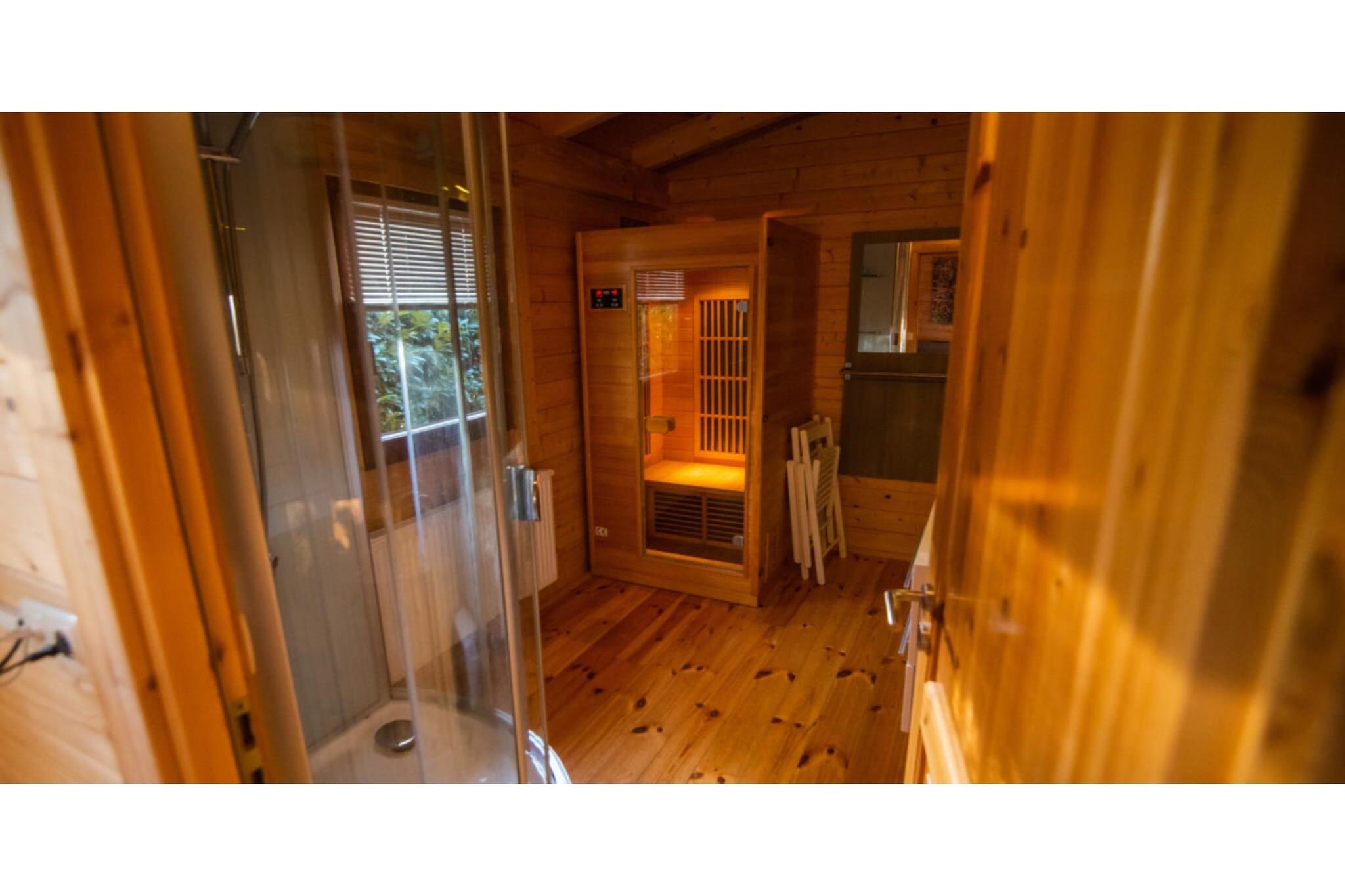 Flygt til roen i denne luksuriøse wellness-lodge, designet eksklusivt til to gæster, der søger komfort og afslapning. Beliggende i det fredfyldte Ferienpark Buitencentrum Hessenheem tilbyder dette fritliggende feriehus en perfekt blanding af moderne bekvemmeligheder og naturlige omgivelser. Lodgen har et rummeligt soveværelse med en komfortabel dobbeltseng og et luksuriøst badeværelse udstyret med dampbruser, infrarød sauna og elegant håndvask - ideelt til afslapning efter en dag med udforskning. Det åbne opholdsområde er både stilfuldt og funktionelt med en hyggelig siddeplads og et fuldt udstyret moderne køkken. Uanset om du brygger en frisk kop Nespresso eller tilbereder et måltid med gaskomfuret og den kombinerede mikrobølgeovn, har du alt, hvad du behøver, lige ved hånden. Køkkenet indeholder også en filterkaffemaskine, elkedel, køleskab med fryser og et komplet sæt køkkenredskaber og pander. Gå udenfor på den private veranda, hvor havemøbler inviterer dig til at nyde fredelige morgener eller romantiske aftener omgivet af natur. Lodgen har en bekvem beliggenhed, kun en kort gåtur fra parkrestauranten og tæt på lokale attraktioner såsom swimmingpoolen Zwembad De Vijf Heuvels (400 m), ridning (600 m) og den charmerende by Markelo (2,4 km). Med nem adgang til offentlig transport, nærliggende restauranter og naturskønne stier er denne wellness-lodge det perfekte tilflugtssted for en foryngende weekend eller en længere ferie i komfort og stil.