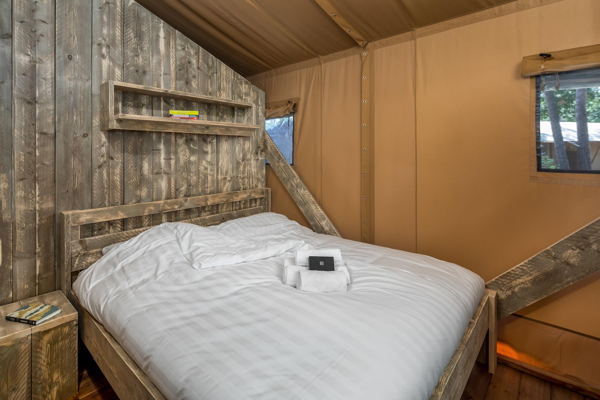 Nyd det bedste fra begge verdener med dette stilfulde, fritstående safaritelte i Bospark 't Wolfsven i Mierlo. Beliggende i en frodig, grøn feriepark kun 12 km fra det livlige Eindhoven, tilbyder denne safarilodge en unik glamping-oplevelse med ekstra komfort. Indenfor finder du en hyggelig stue med tv, et åbent køkken med køleskab og fryser samt to hyggelige soveværelser – det ene med en dobbeltseng og det andet med to køjesenge. Et privat badeværelse med brusebad og toilet sikrer moderne bekvemmeligheder i rustikke omgivelser. Safariteltet ligger i udkanten af en malerisk skov og tilbyder ro og frisk luft, samtidig med at du er tæt på alt, hvad du har brug for. Træd ud på din overdækkede veranda med picnicbord, der er perfekt til en afslappet morgenmad eller en drink om aftenen under træerne. Den åbne have giver en følelse af rummelighed, og der er gratis parkering i nærheden for din bekvemmelighed. Bemærk: Denne lodge er et kæledyrsfrit overnatningssted, der sikrer et rent, allergivenligt ophold for alle gæster. I gåafstand finder du uformelle restauranter, der serverer solide hollandske måltider, og hyggelige caféer, der er perfekte til kaffepauser. Mierlos charmerende bycentrum ligger kun få minutter væk, og hvis du er mere til en urban atmosfære, ligger Eindhoven kun 15 minutters kørsel derfra. Efter en dag med udforskning kan du tage en forfriskende dukkert i den fælles swimmingpool og slappe af i din rolige, stilfulde lodge, hvor naturen møder komfort.