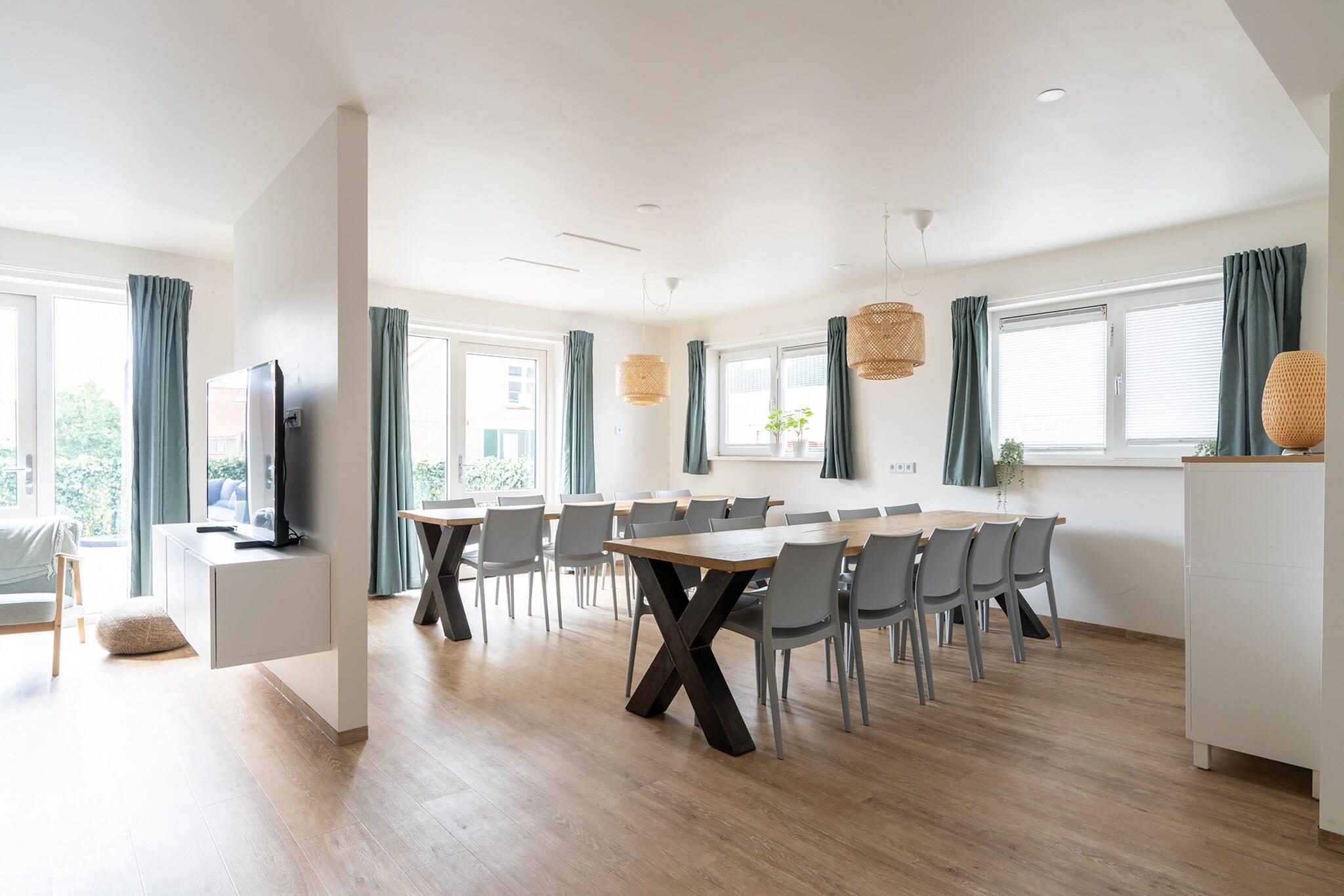 Stueetage: (Stue(Fjernsyn(fladskærm), sofahjørne), Stue(Fjernsyn(fladskærm), sofahjørne), køkken-alrum(spisebord(20 personer), kaffemaskine(kaffetragt, kaffepude), ovn, combi-mikroovn, opvaskemaskine , køle-fryseskab, barnestol), køkken-alrum(spisebord, kaffemaskine, ovn, combi-mikroovn, opvaskemaskine , køle-fryseskab, barnestol), Soveværelse med badeværelse(dobbeltseng, køjeseng, bruser, håndvask), Soveværelse med badeværelse(dobbeltseng, køjeseng, bruser, håndvask), toilet(toilet), toilet(toilet), toilet(toilet)) På 1. etage: (Soveværelse med badeværelse(enkeltseng, enkeltseng, bruser, håndvask), Soveværelse med badeværelse(enkeltseng, enkeltseng, køjeseng, bruser, håndvask), Soveværelse med badeværelse(enkeltseng, enkeltseng, køjeseng, bruser, håndvask), Soveværelse med badeværelse(enkeltseng, enkeltseng, køjeseng, bruser, håndvask), Soveværelse med badeværelse(enkeltseng, enkeltseng, køjeseng, bruser, håndvask), Soveværelse med badeværelse(enkeltseng, enkeltseng, bruser, håndvask), Soveværelse med badeværelse(enkeltseng, enkeltseng, køjeseng, bruser, håndvask), Soveværelse med badeværelse(enkeltseng, enkeltseng, køjeseng, bruser, håndvask), Soveværelse med badeværelse(enkeltseng, enkeltseng, bruser, håndvask), toilet(toilet), toilet(toilet), toilet(toilet)) På 2. etage: (soveværelse(enkeltseng, enkeltseng, håndvask), soveværelse(enkeltseng, enkeltseng, håndvask), soveværelse(enkeltseng, enkeltseng, håndvask), badeværelse(bruser), toilet(toilet), barneseng) tørretumbler, vaskemaskine, terrasse, have, havemøbler, legeredskaber, barneseng, trappegitter, Volleyballbane