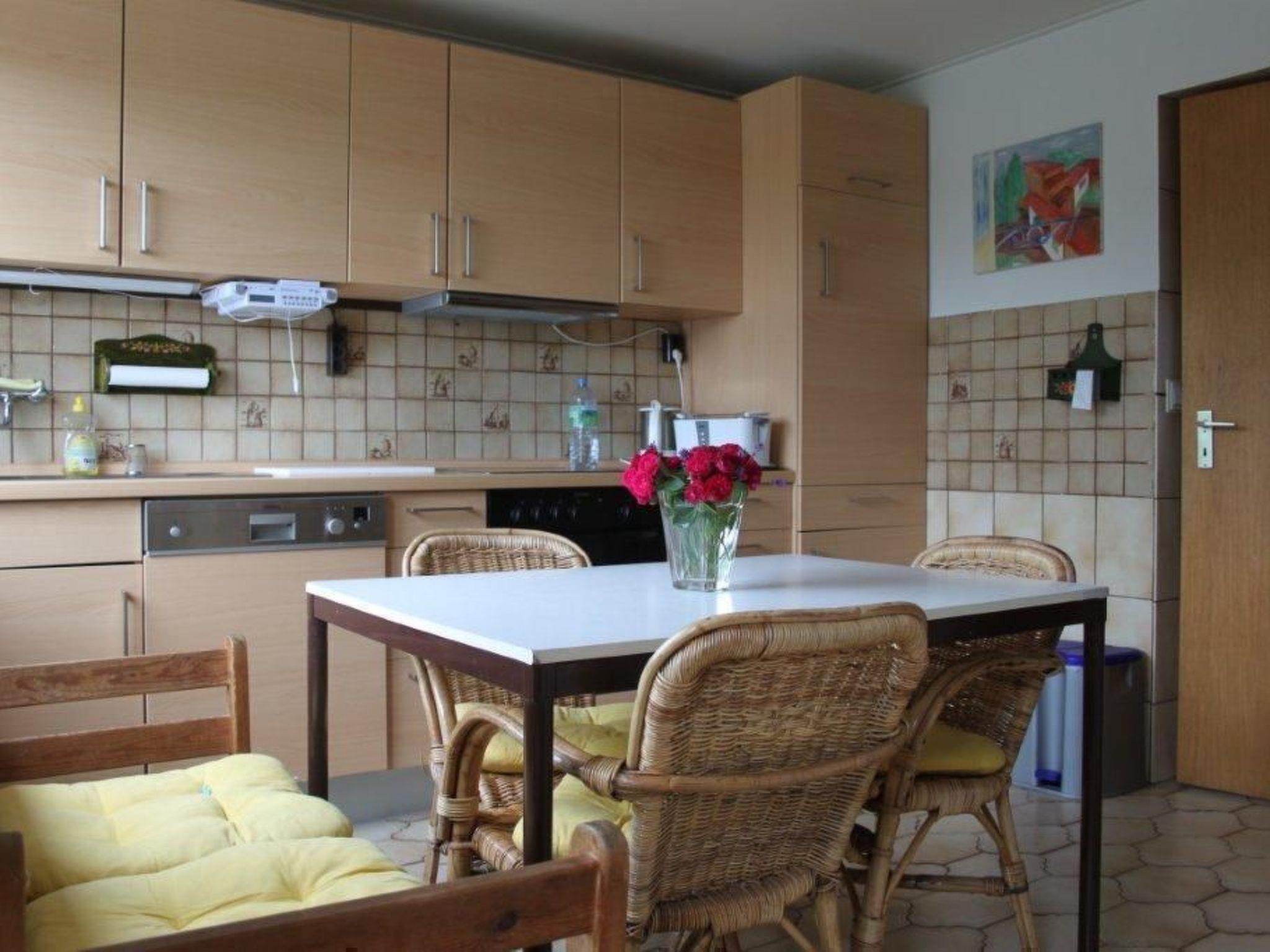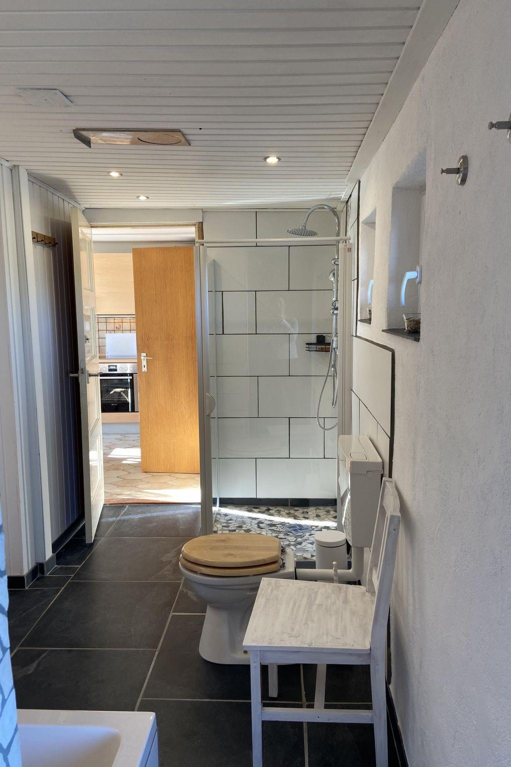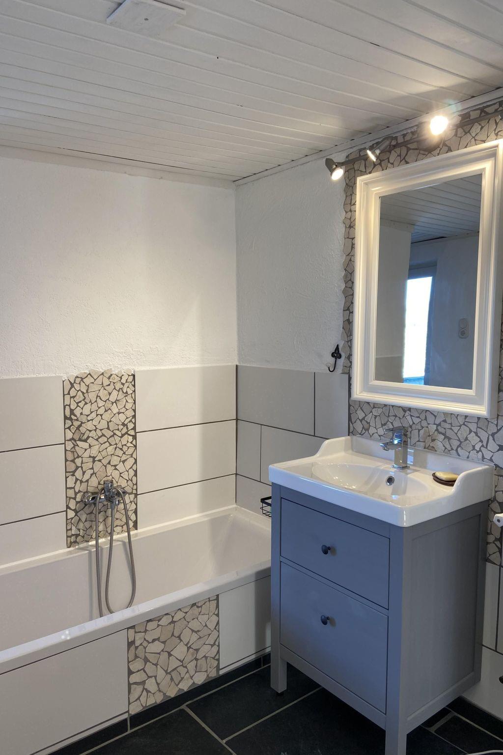 The four guest rooms offer seven beds. Downstairs on the ground floor there is a single bedroom with a 90 cm wide bed, a desk and a wardrobe. There is also a double bedroom with a 1.80 cm wide double bed and wardrobe. Both rooms lead off the living room. Two further bedrooms are located in the attic with sloping ceilings. In one bedroom there is a double bed measuring 2x2 metres and in the other bedroom there are two single beds, each 90 cm wide, and a desk. Both bedrooms have shelves integrated into the sloping ceilings. There is also a guest WC in the attic. THE ROOF FLOOR CAN ONLY BE ACCESSED BY A NARROW STAIRCASE (not a wide staircase - not suitable for older people). On the ground floor there are the two bedrooms, the living room, a bathroom and the eat-in kitchen. There is a dining table in the living room as well as in the eat-in kitchen. In the living room there is a cosy seating area with a cable TV and a DVD player. In addition to the seating area, the kitchen contains a modern kitchenette with oven, hob, fridge, dishwasher. Coffee machine, toaster. There is also a radio with CD player. In addition to the guest WC, the house has two bathrooms. One bathroom with shower, bath, washbasin, sauna and WC is on the ground floor. There is also an outdoor bathroom with shower, washbasin and WC (also on the ground floor, but accessible from the terrace), the indoor bathroom has just been completely renovated (January 2021) and now has direct through/access to the sauna. Modern tiles and bathroom furniture now round off our little wellness oasis. Don't forget your bathrobes! The outdoor bathroom has also been given a new look. Photos to follow.