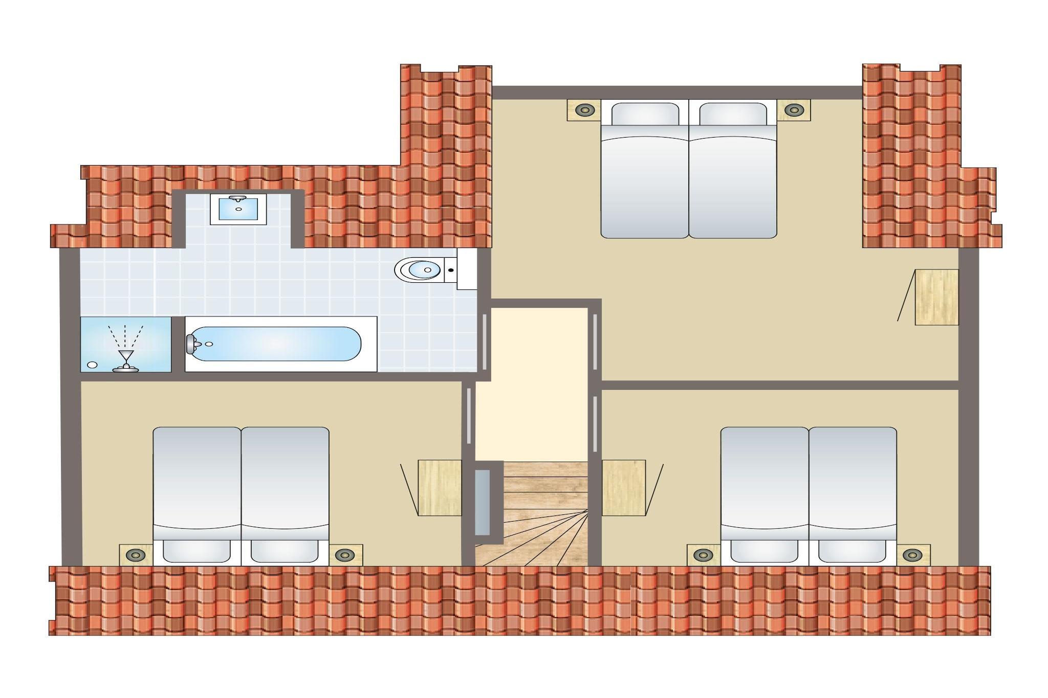 Stueetage: (entre, Stue, køkken-alrum(elkedel, komfur(gas), kaffemaskine(kaffetragt, kaffepude), ovn, mikrobølgeovn, opvaskemaskine , køle-fryseskab), Soveværelse med badeværelse(dobbeltseng eller 2 enkeltsenge Senge, Fjernsyn, bruser, håndvask), pulterkammer) På 1. etage: (soveværelse(dobbeltseng eller 2 enkeltsenge Senge), soveværelse(dobbeltseng eller 2 enkeltsenge Senge), soveværelse(dobbeltseng eller 2 enkeltsenge Senge), badeværelse(badekar, bruser, håndvask, toilet), toilet(toilet), Repos) terrasse, have, havemøbler, swimmingpool(deles med andre gæster, overdækket), barneseng, barnestol