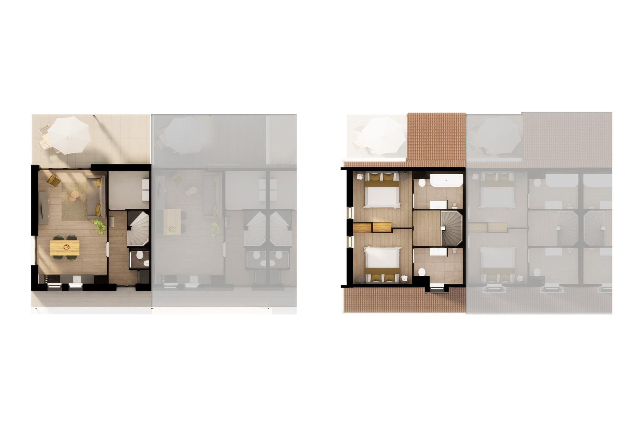 Stueetage: (entre(toilet), Stue(Fjernsyn(Smart-TV), sofahjørne), åbent køkken(kogeplade(Komfur med fire kogeplader, induktion), kaffemaskine(kopper), combi-mikroovn, opvaskemaskine , køle-fryseskab)) På 1. etage: (Soveværelse med badeværelse(dobbeltseng eller 2 enkeltsenge Senge, Fjernsyn(Smart-TV), badekar, bruser(Walk-in-bruser), håndvask, toilet), Soveværelse med badeværelse(dobbeltseng eller 2 enkeltsenge Senge, bruser(Walk-in-bruser), håndvask, toilet), Repos) terrasse, have(delvist indhegnet), havemøbler, parkering, swimmingpool(deles med andre gæster, udendørs, indendørs), Ladestation til el-biler