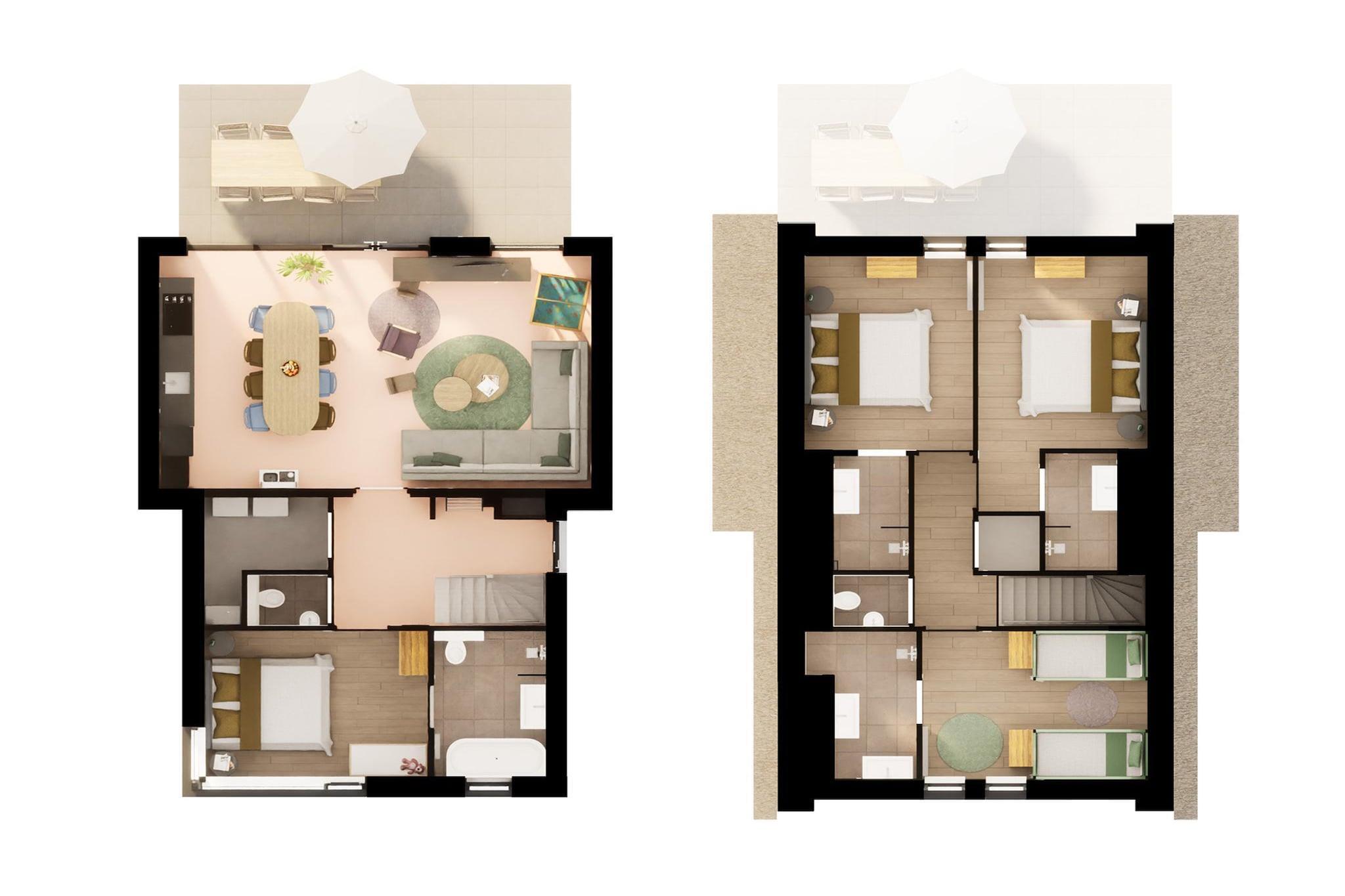 Stueetage: (entre(toilet), Stue(Fjernsyn(Smart-TV), sofahjørne, legeredskaber), åbent køkken(kogeplade(Komfur med fire kogeplader, induktion), kaffemaskine(kopper), combi-mikroovn, opvaskemaskine , køle-fryseskab), Soveværelse med badeværelse(dobbeltseng eller 2 enkeltsenge Senge, badekar, bruser, håndvask, toilet)) På 1. etage: (Soveværelse med badeværelse(dobbeltseng eller 2 enkeltsenge Senge, Fjernsyn(Smart-TV), bruser, håndvask), Soveværelse med badeværelse(dobbeltseng eller 2 enkeltsenge Senge, bruser, håndvask), Børneværelse(enkeltalkove, enkeltalkove, bruser, håndvask), Repos(toilet, trappegitter)) terrasse, have(delvist indhegnet), havemøbler, parkering, swimmingpool(deles med andre gæster, udendørs, indendørs), Ladestation til el-biler