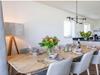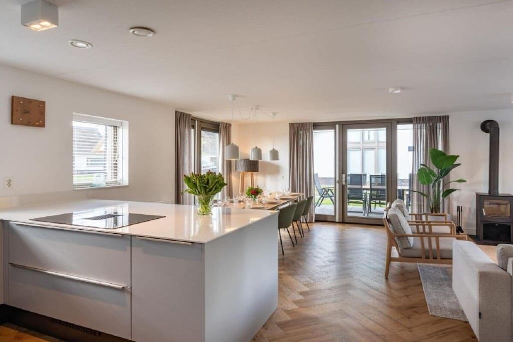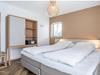 Du har udsigt til den rummelige terrasse, som er tilgængelig gennem de store glasdøre. Spiseområdet er forbundet med det rummelige åbne køkken med kogeø og moderne apparater. Soveværelset har en vask.