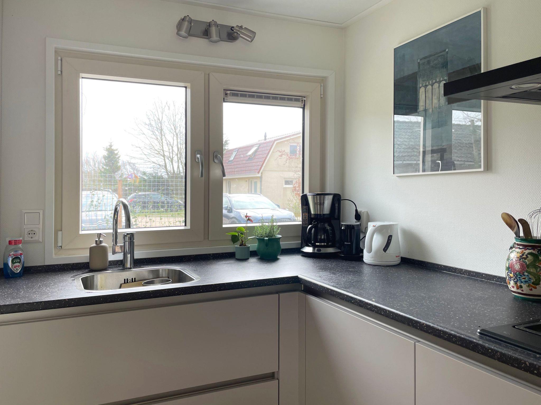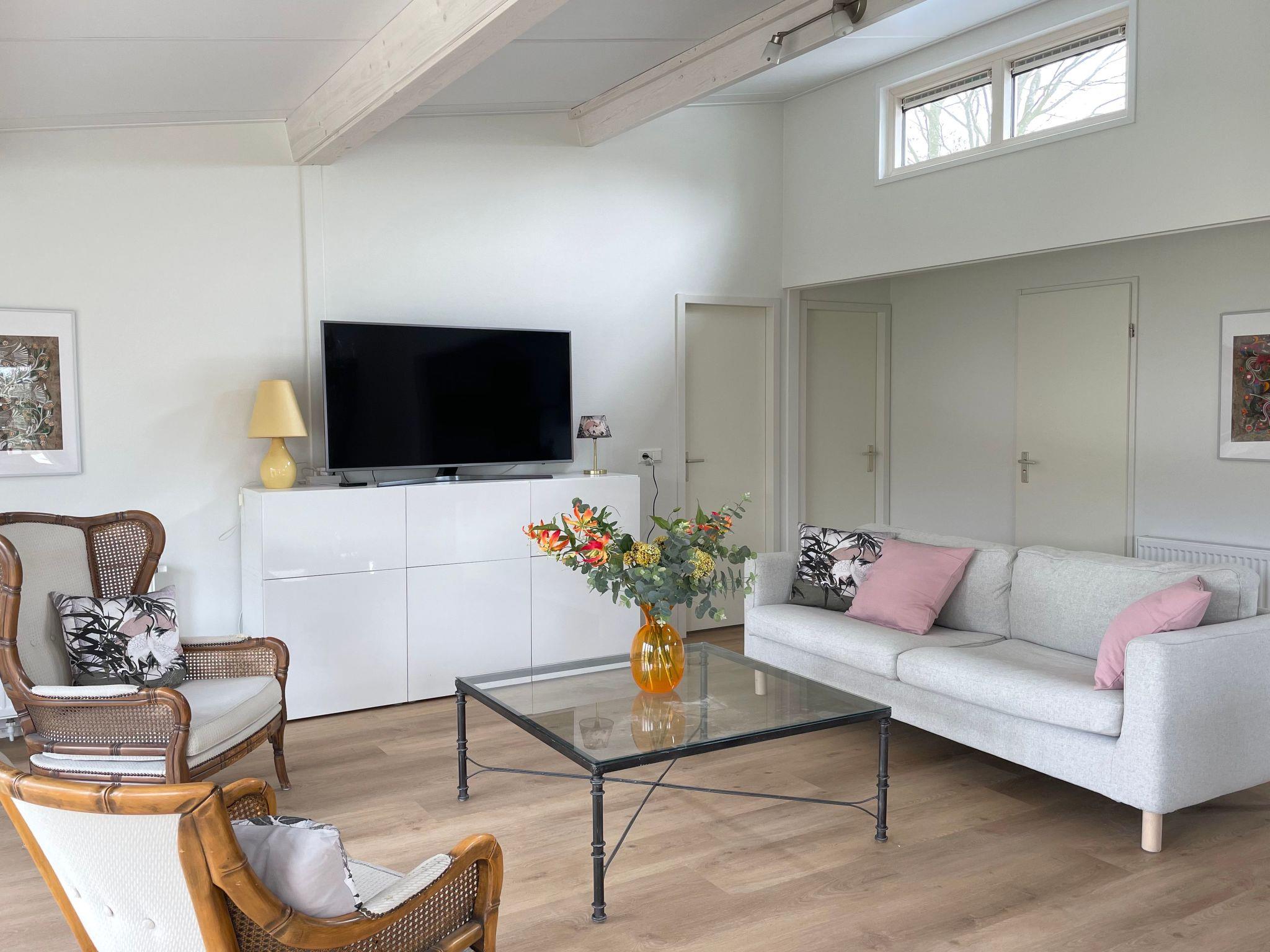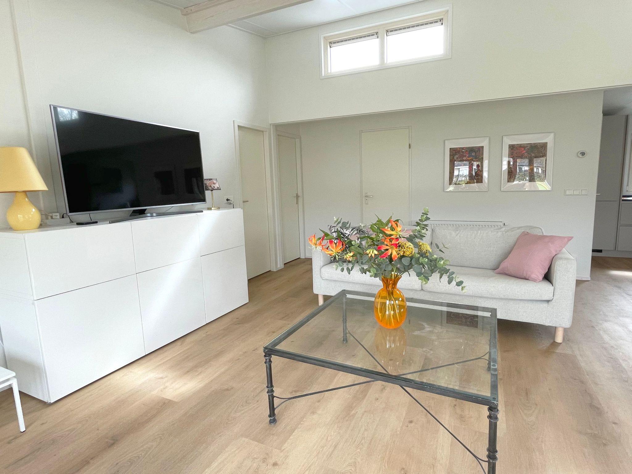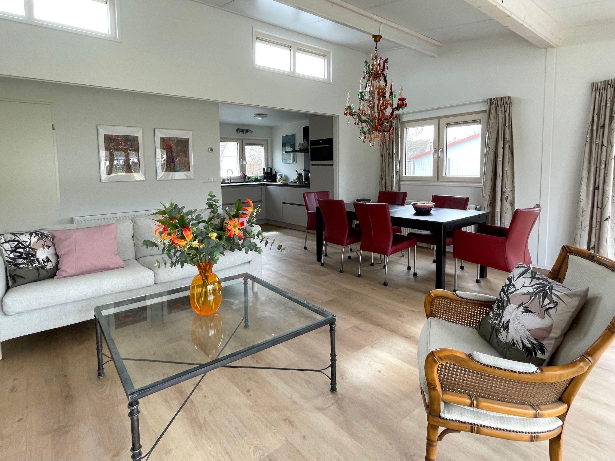 You enter a spacious living room, where a lot of comfort awaits you with great attention to detail and colour. A colourful chandelier hangs above the spacious dining table for 6 people. The sloping roof in the living room has windows and with the French doors and windows on the side, the room has plenty of natural light and transitions seamlessly from inside to outside. The kitchen is modern and includes a dishwasher and oven.