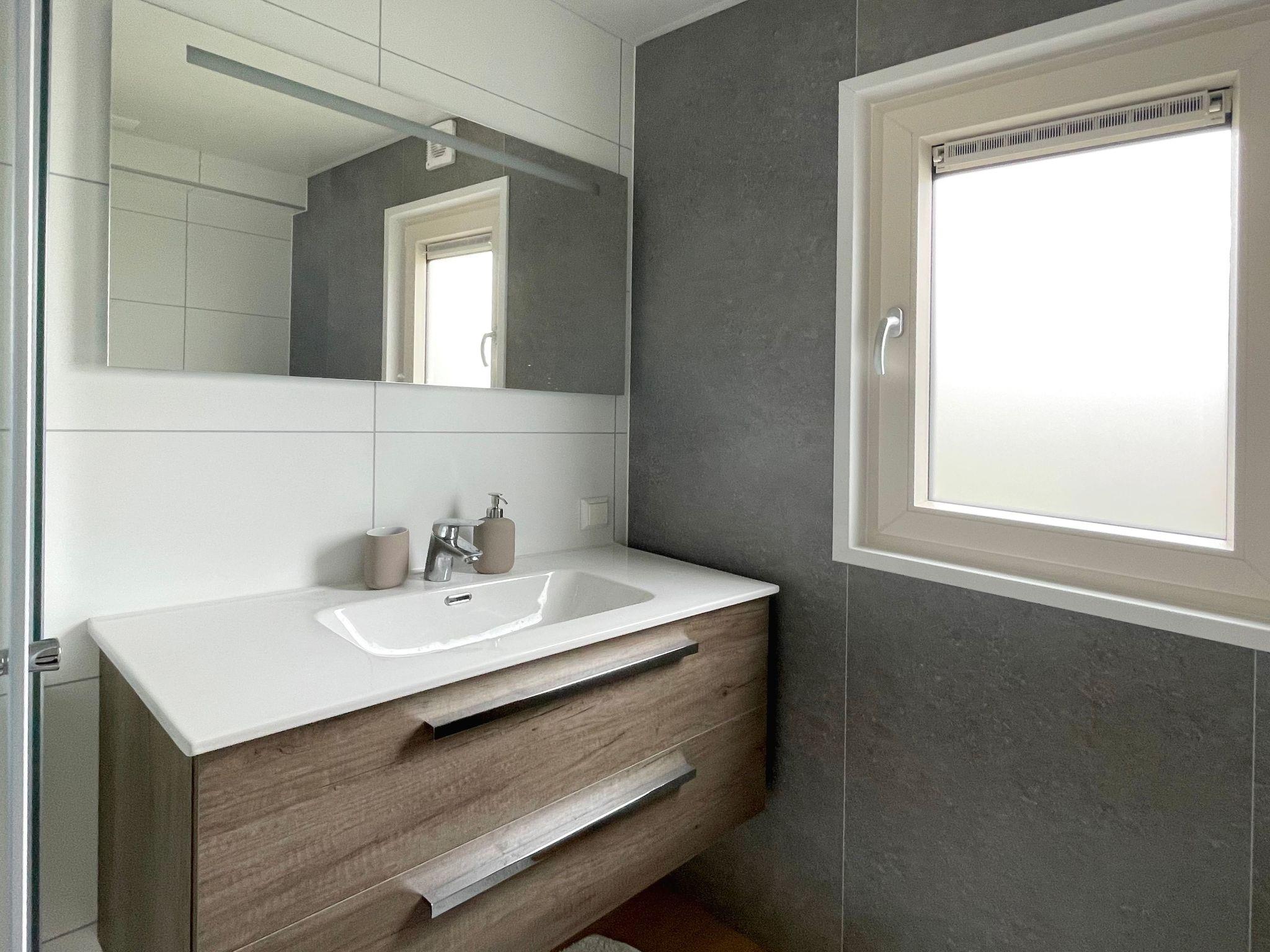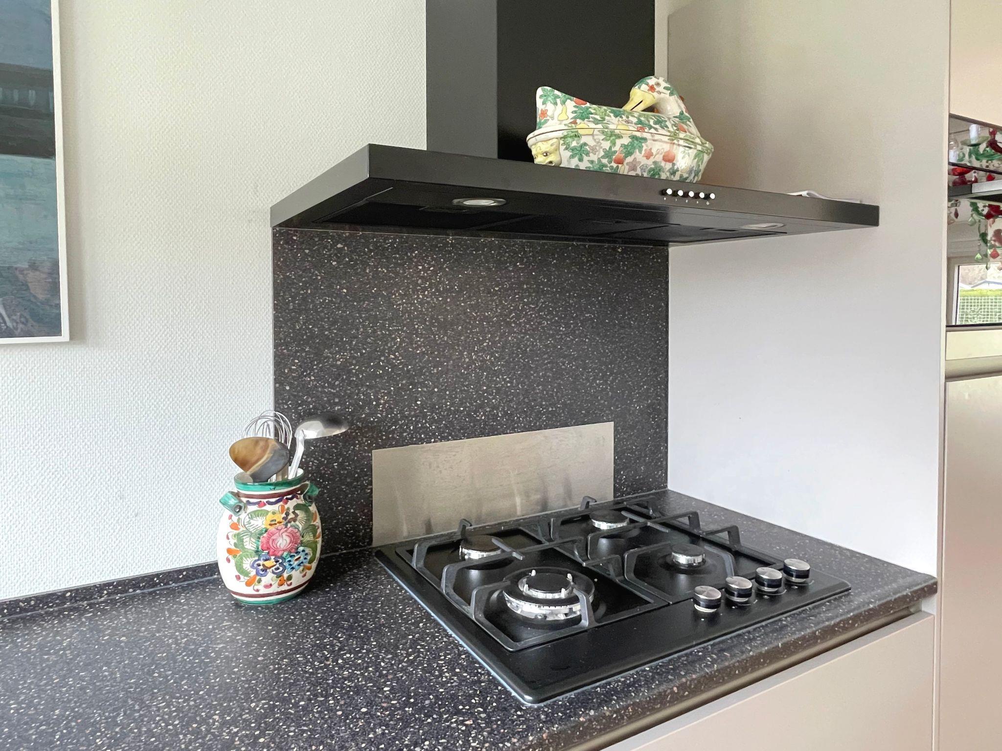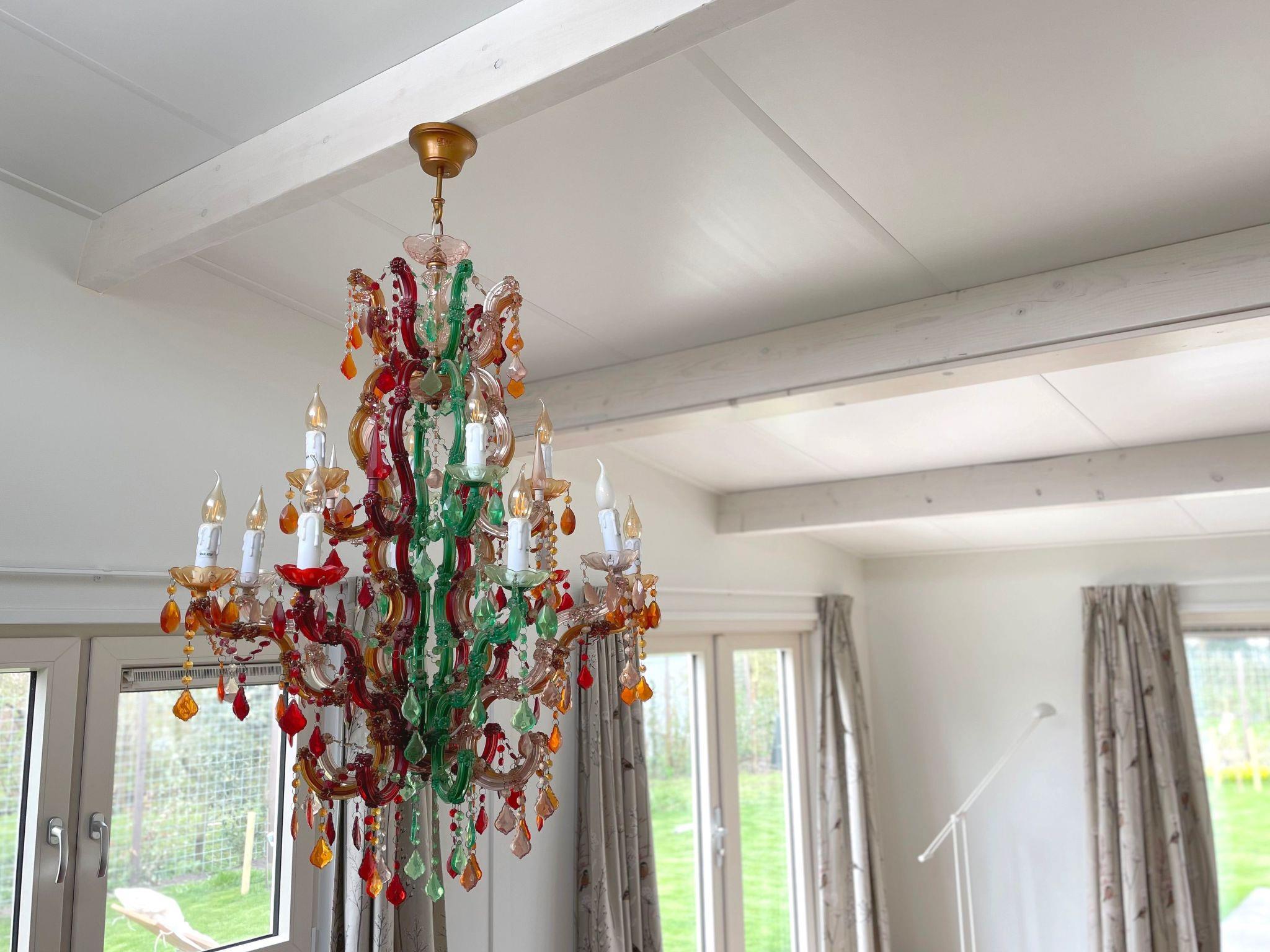 You enter a spacious living room, where a lot of comfort awaits you with great attention to detail and colour. A colourful chandelier hangs above the spacious dining table for 6 people. The sloping roof in the living room has windows and with the French doors and windows on the side, the room has plenty of natural light and transitions seamlessly from inside to outside. The kitchen is modern and includes a dishwasher and oven.