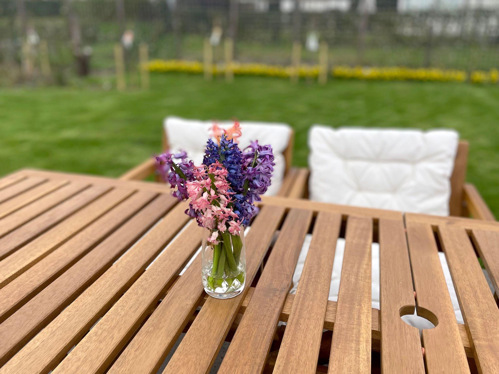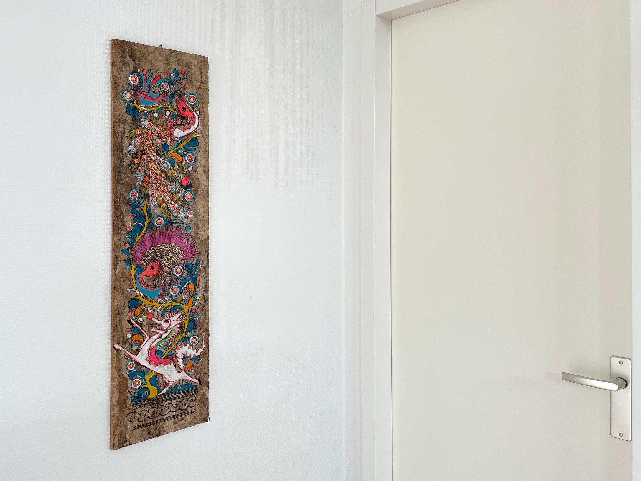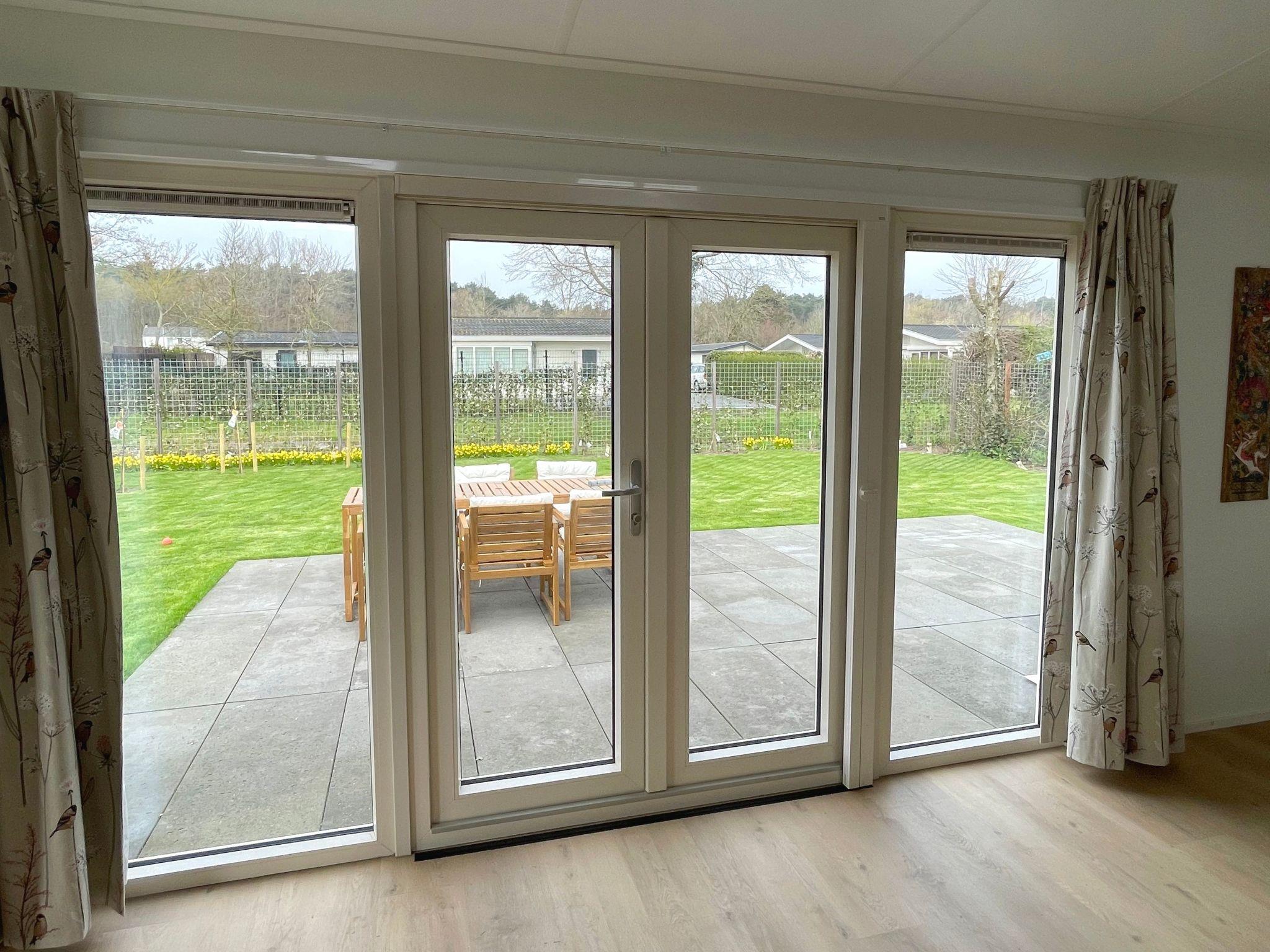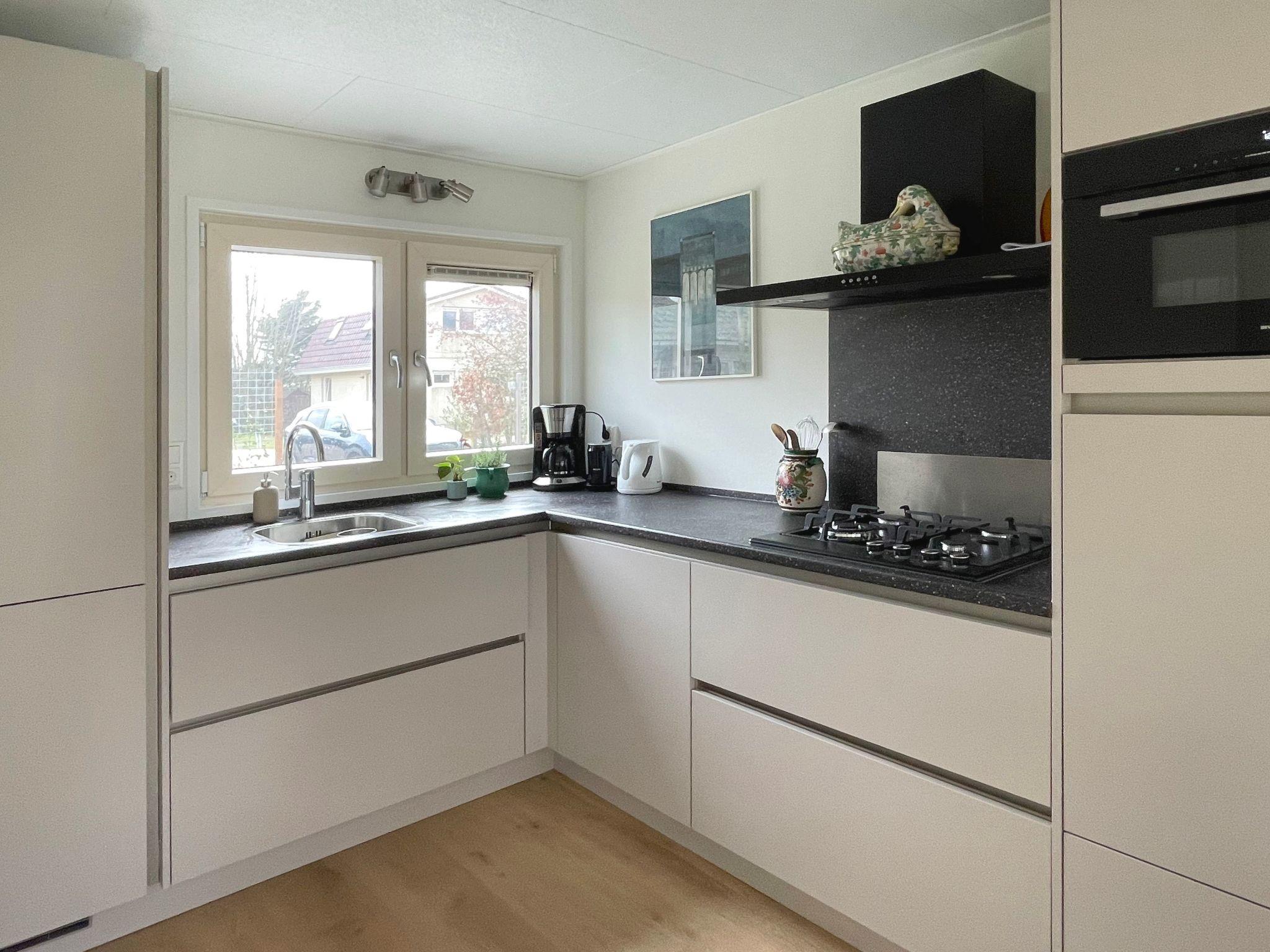 You enter a spacious living room, where a lot of comfort awaits you with great attention to detail and colour. A colourful chandelier hangs above the spacious dining table for 6 people. The sloping roof in the living room has windows and with the French doors and windows on the side, the room has plenty of natural light and transitions seamlessly from inside to outside. The kitchen is modern and includes a dishwasher and oven.