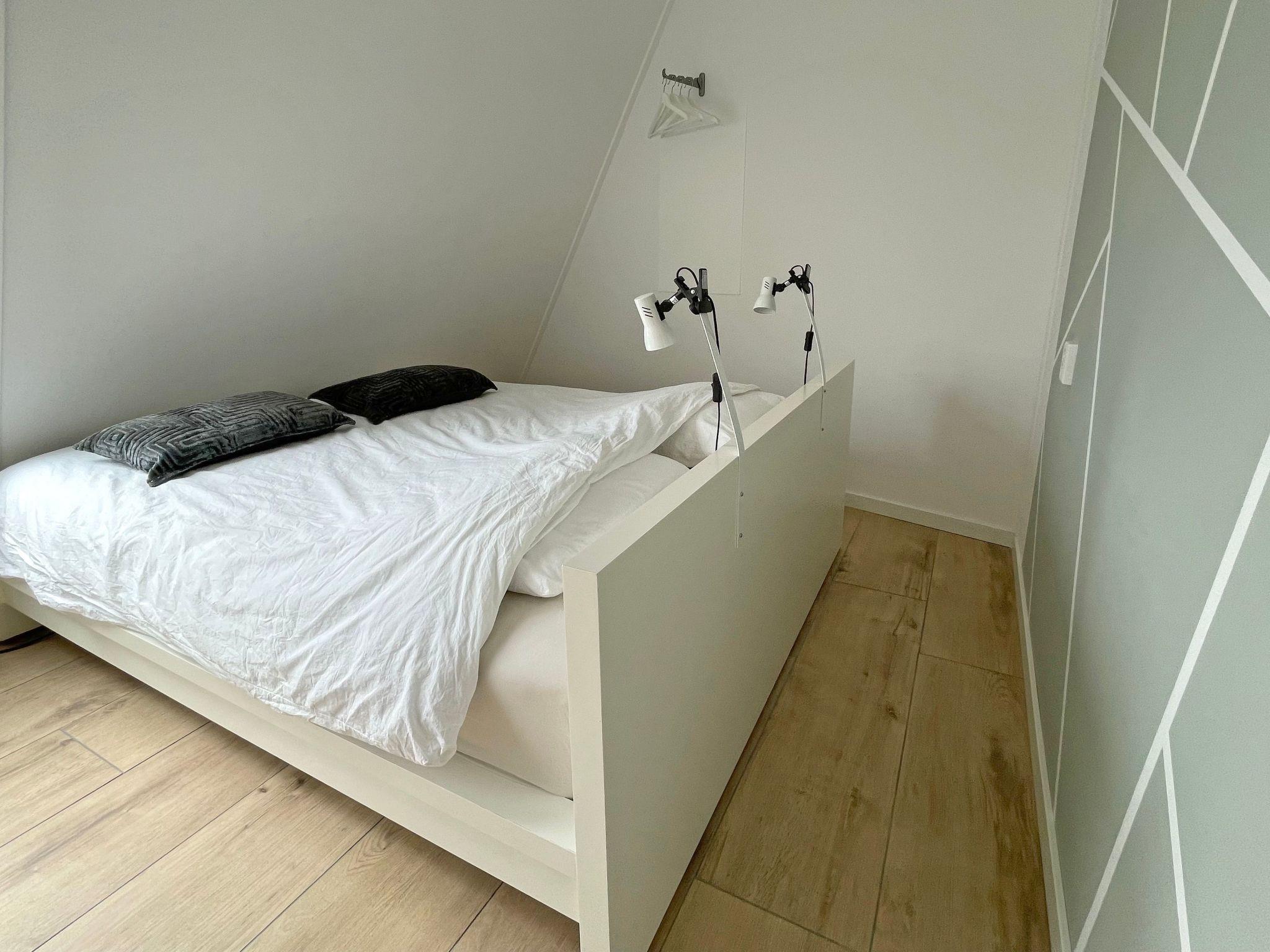 The staircase leads to the upper floor, where there are two bedrooms, both with tasteful walls. The first bedroom is furnished with a double bed and the second bedroom with two single beds. The bathroom has a washbasin, a shower and a toilet.
