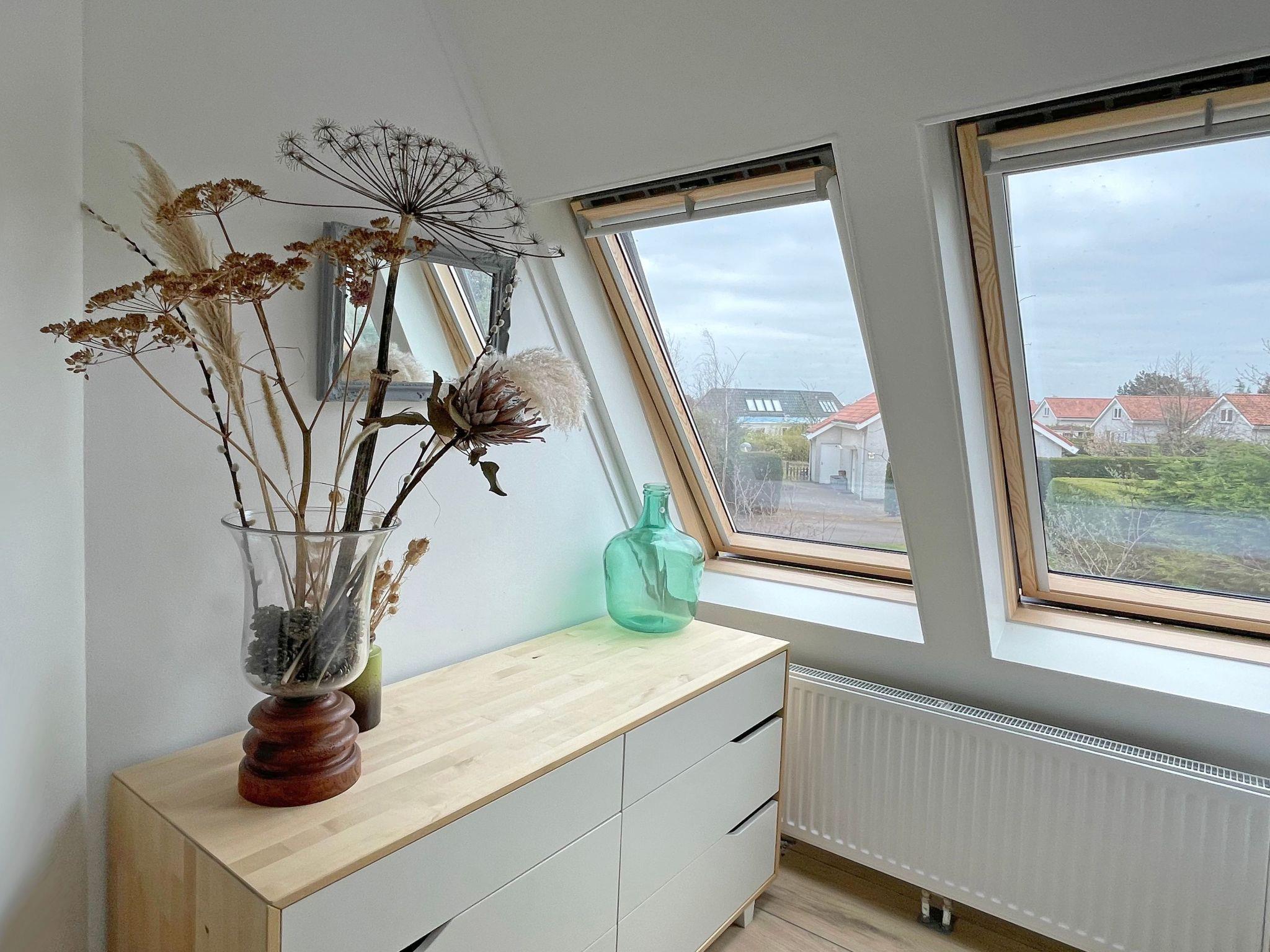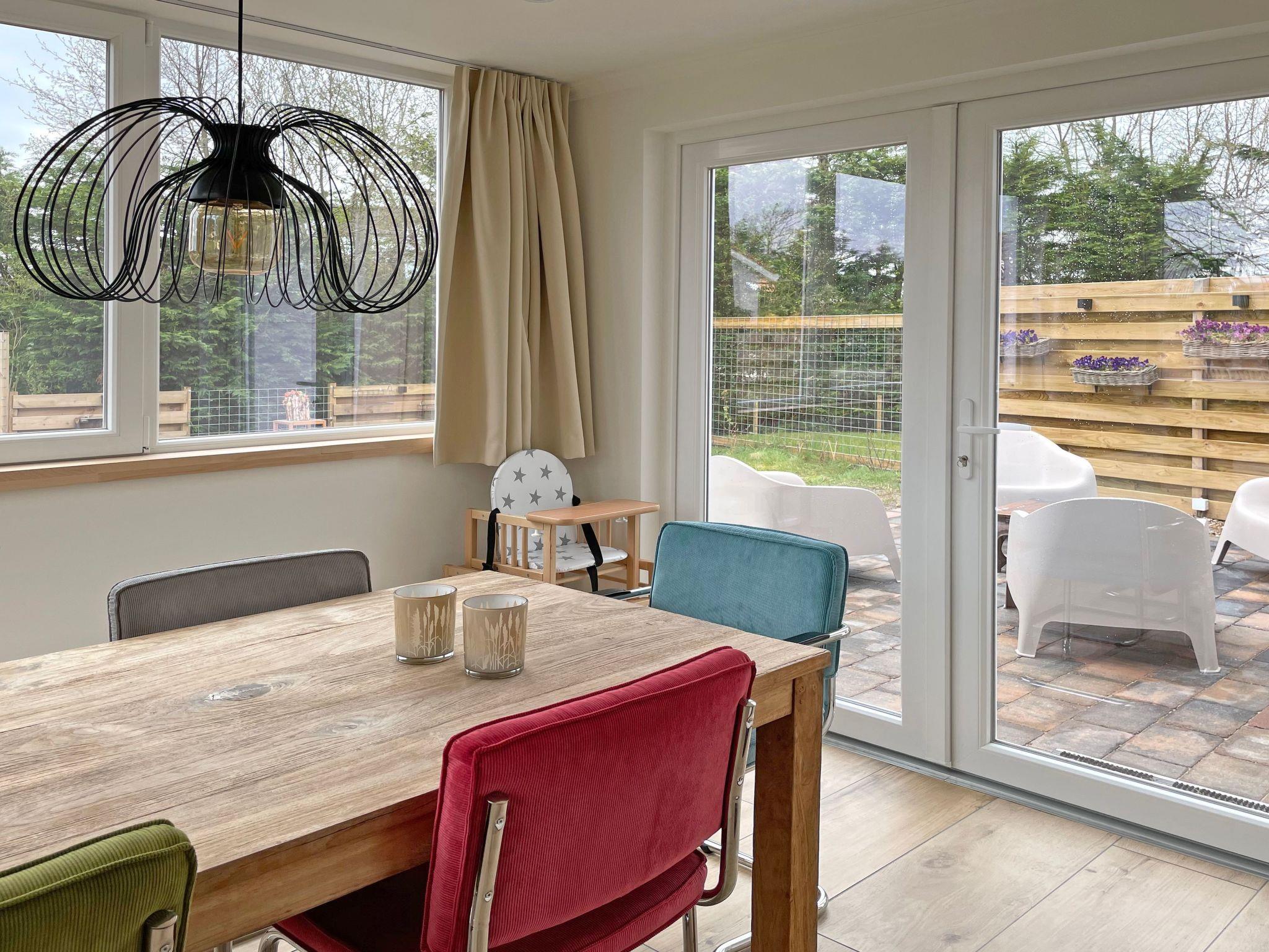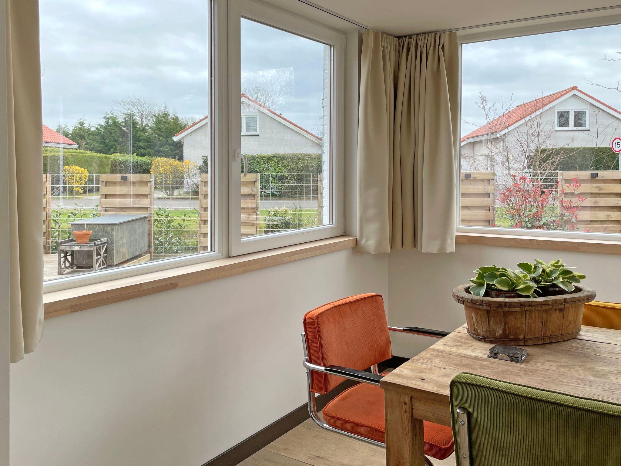 The holiday home is flooded with natural light through the many large windows and brings the feeling of being outdoors. The living room is comfortably furnished with a sofa and two armchairs. The dining table is located in the extension built in 2022 with windows all around and the best view outside.