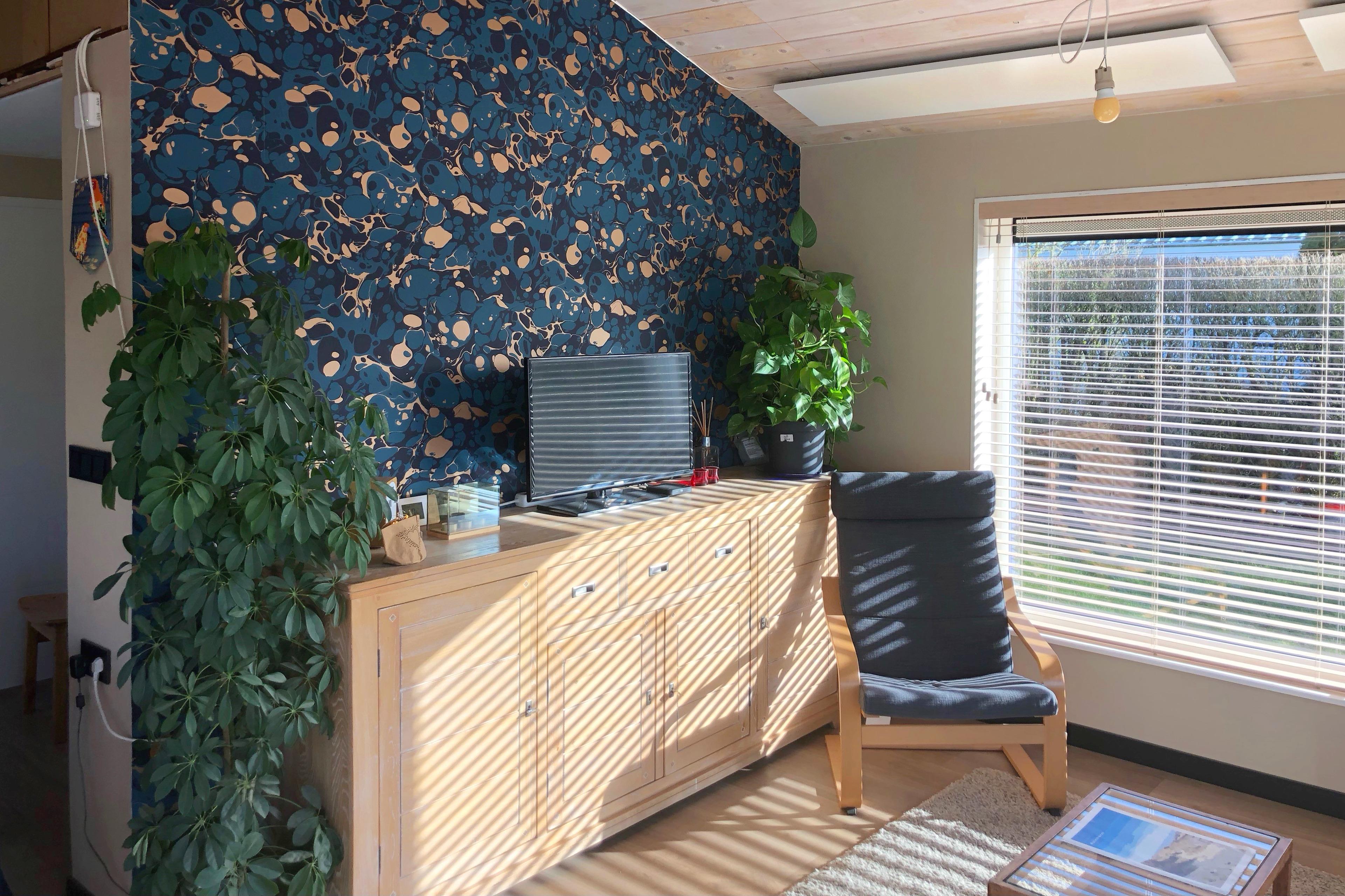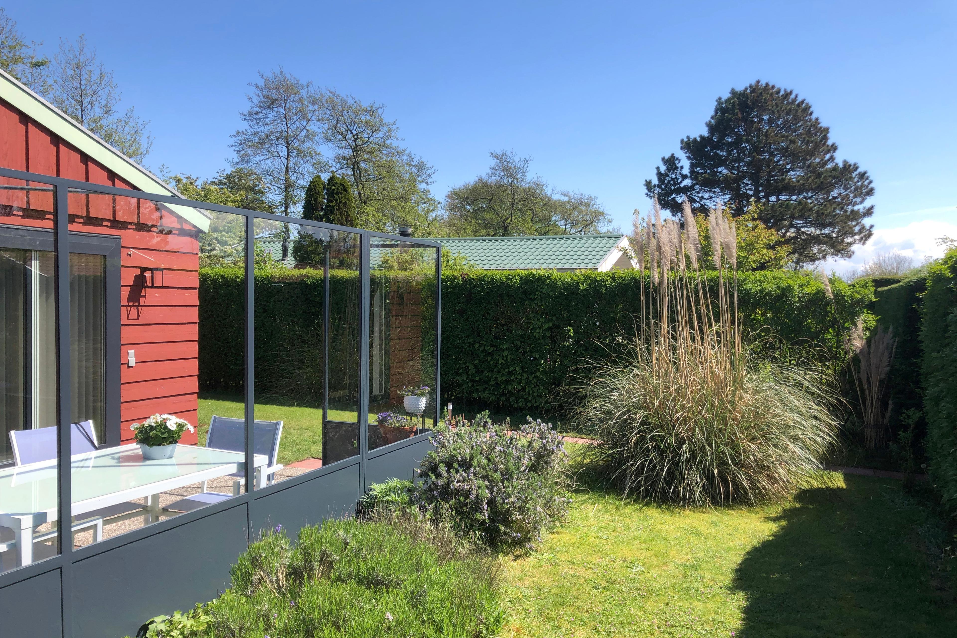 Das Ferienhaus SunGarden bietet mit seiner guten Ausstattung viel Komfort. Die Küche verfügt über eine Kombi-Mikrowelle und einen Geschirrspüler. Im Wohnzimmer steht ein Smart-TV, und die großen Fenster lassen viel Tageslicht herein.