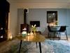 Heller, offener Wohn- und Essbereich mit Sofaecke, Kaminofen und Smart-TV mit internationalen Kanälen