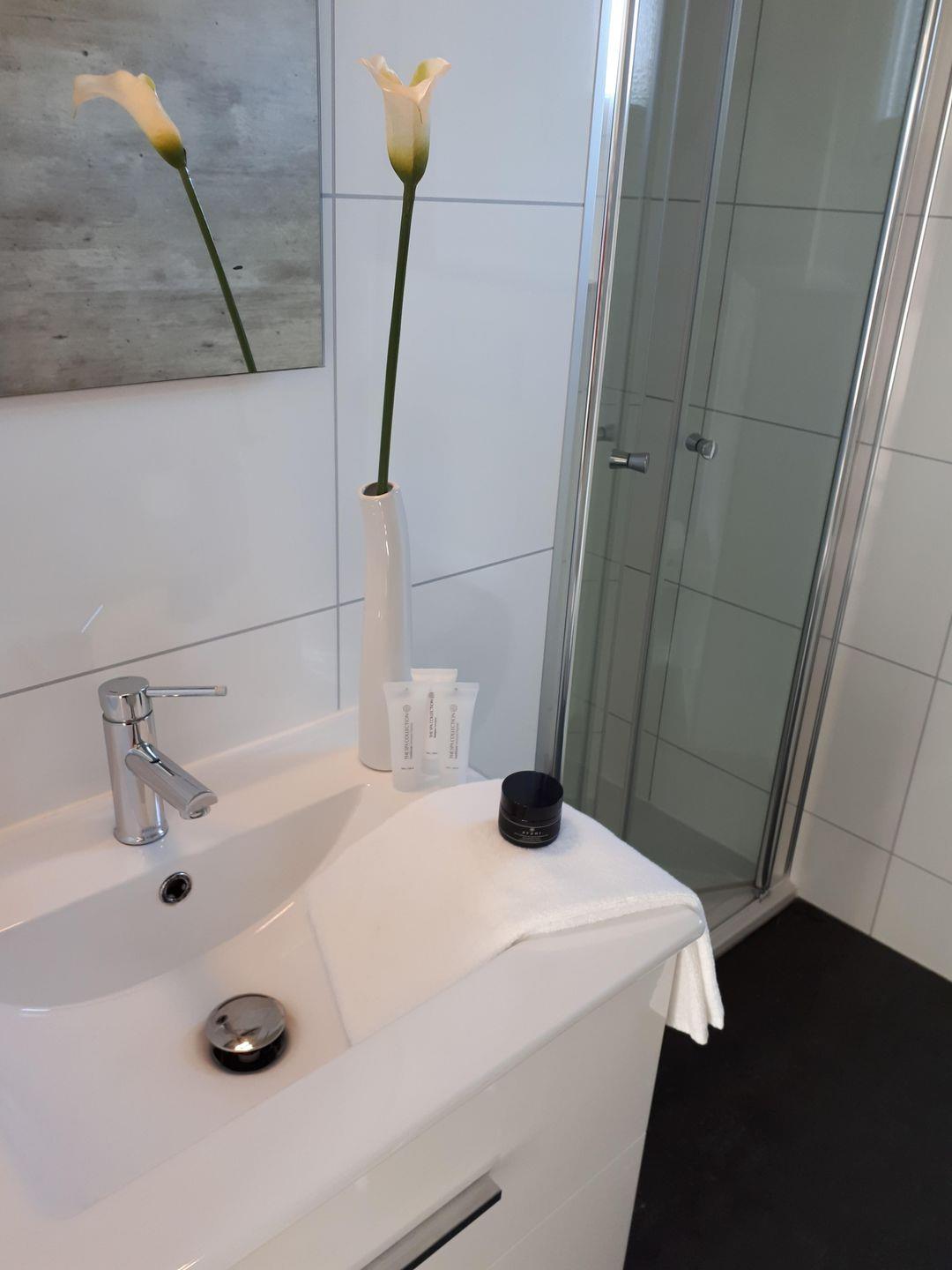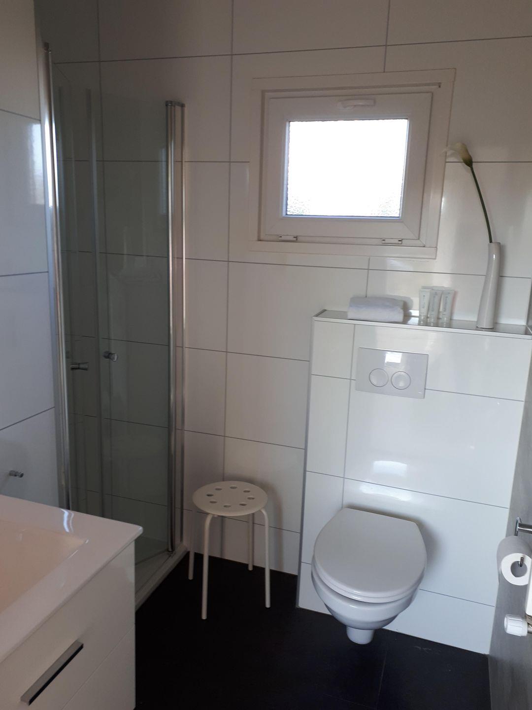Im Badezimmer erwartet Sie eine bodengleiche Dusche (1 Dusche), WC, Waschbecken, Spiegel sowie ein Fenster und warmes Wasser. Zusätzlich gibt es zwei Gäste-WCs. Für längere Aufenthalte oder sportliche Tage am See sind Waschmaschine und Trockner gemeinschaftlich nutzbar; außerdem stehen Wäscheständer und Abfalleimer bereit.