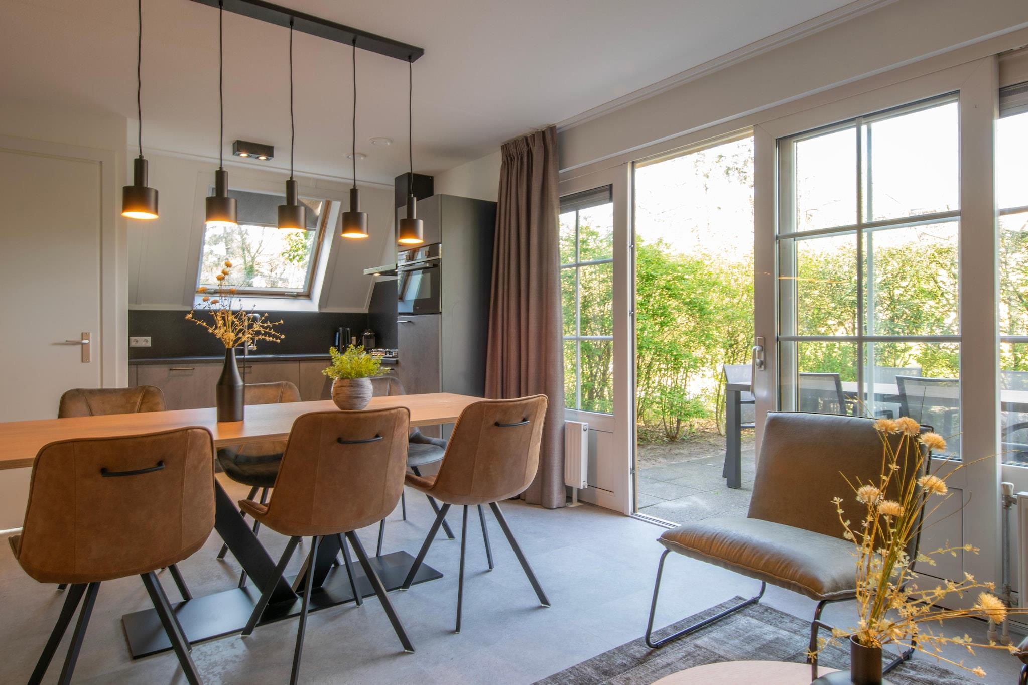 Hyggeligt skovophold for familier Dette smukt renoverede feriehus til 6 personer ligger i det fredelige grønne område De Katjeskelder Holiday Park og tilbyder komfort og varme til en afslappende ferie. Den stilfulde stue har Smart TV og gulvvarme, mens det åbne køkken er fuldt udstyret med opvaskemaskine, køleskab med fryser og kombineret mikroovn – perfekt til hyggelige aftener. Stueetagen har et soveværelse med dobbeltseng, eget badeværelse med brusebad og separat toilet i gangen for ekstra bekvemmelighed. Komfort med eget badeværelse og charme udendørs På første sal finder du yderligere to rummelige soveværelser med dobbeltsenge, hver med eget badeværelse – det ene med et luksuriøst badekar og det andet med en moderne bruser. Træd udenfor og nyd den private terrasse og den uindhegnede have, der er ideel til morgenkaffe eller aften drinks under stjernerne. En kort gåtur fra din bungalow bringer dig til parkens fælles indendørs og udendørs swimmingpools, der er perfekte til sjov og afslapning i alle årstider. Natur og spisesteder kun få minutter væk Kun 10 km væk ligger den livlige by Breda, hvor du kan slentre gennem charmerende gader, udforske historiske seværdigheder eller nyde lokale caféer, bagerier og bistroer. Den nærliggende nationalpark De Biesbosch er et must for naturelskere – ideel til vandreture, cykling eller en fredelig bådtur. Uanset om du er her for udendørs eventyr eller kvalitetstid med familien, er dette hjem en perfekt base for begge dele.