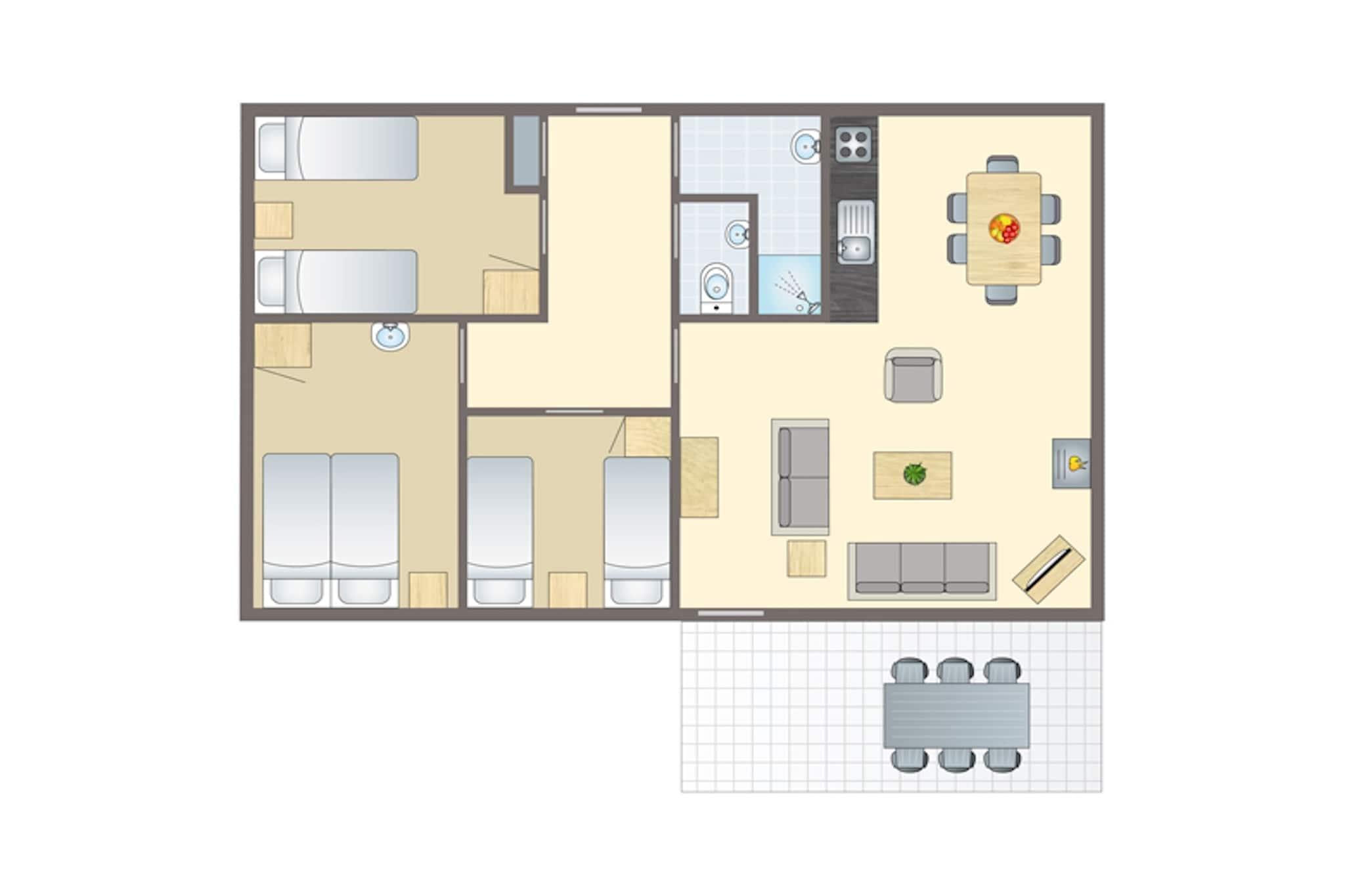 Stueetage: (entre(toilet), Stue(Fjernsyn, pejs), åbent køkken(elkedel, komfur(gas), kaffemaskine(kaffetragt, kaffepude), mikrobølgeovn, opvaskemaskine , køle-fryseskab), soveværelse(dobbeltseng eller 2 enkeltsenge Senge, håndvask), soveværelse(enkeltseng, enkeltseng), soveværelse(enkeltseng, enkeltseng), badeværelse(bruser, håndvask)) terrasse, have, havemøbler, parkering, swimmingpool(deles med andre gæster, overdækket)