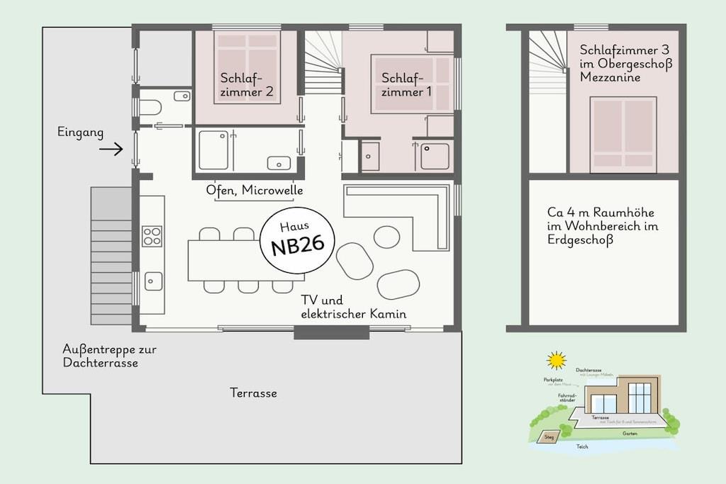 Stueetage: (Stue(, enkeltsovesofa, Fjernsyn, pejs), Køkken(kogeplade, ovn, opvaskemaskine , køleskab), soveværelse(, , dobbeltseng, bruser, håndvask, føntørrer, insektnet), soveværelse(, dobbeltseng, insektnet), badeværelse(, bruser, håndvask), badeværelse(, bruser, håndvask), guest toilet(, toilet, håndvask, insektnet)) Mellemetage: (soveværelse(dobbeltseng, insektnet)) , , Internetadgang, terrasse(, havemøbler), parkering, liggestole(, havemøbler), tørreskab