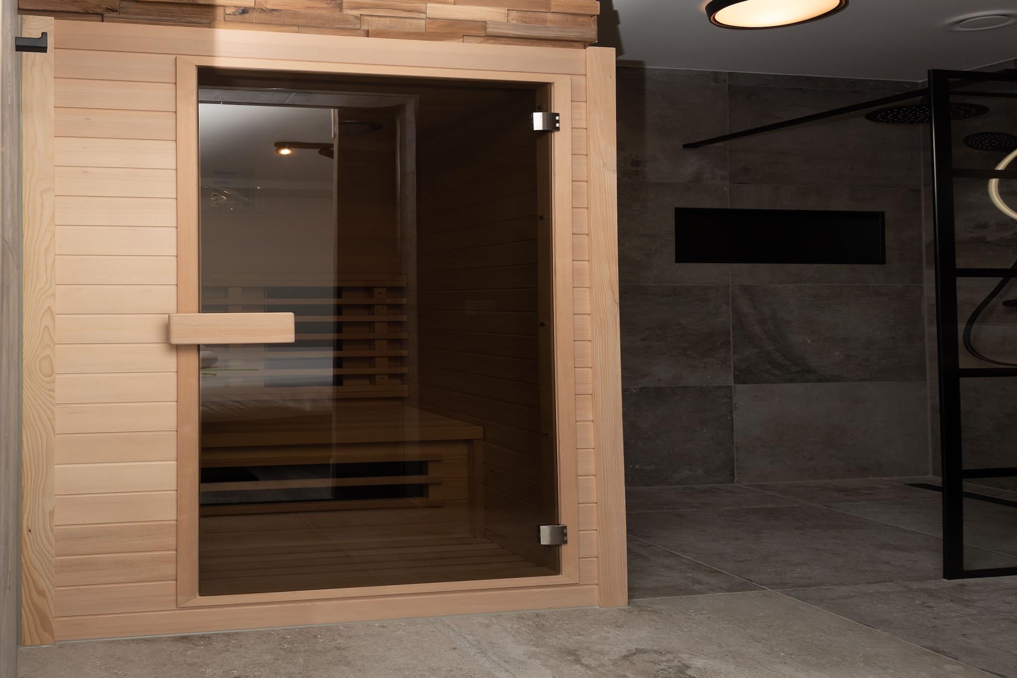 På 1. etage: (Køkken(elkedel, komfur(Komfur med to kogeplader, elektrisk), kaffemaskine, combi-mikroovn, opvaskemaskine , køleskab), stue / spisestue(Fjernsyn(parabol, Internationale TV-kanaler), sofahjørne), soveværelse(dobbeltseng), badeværelse(bruser), toilet) infrarød sauna, balkon, havemøbler, parkering