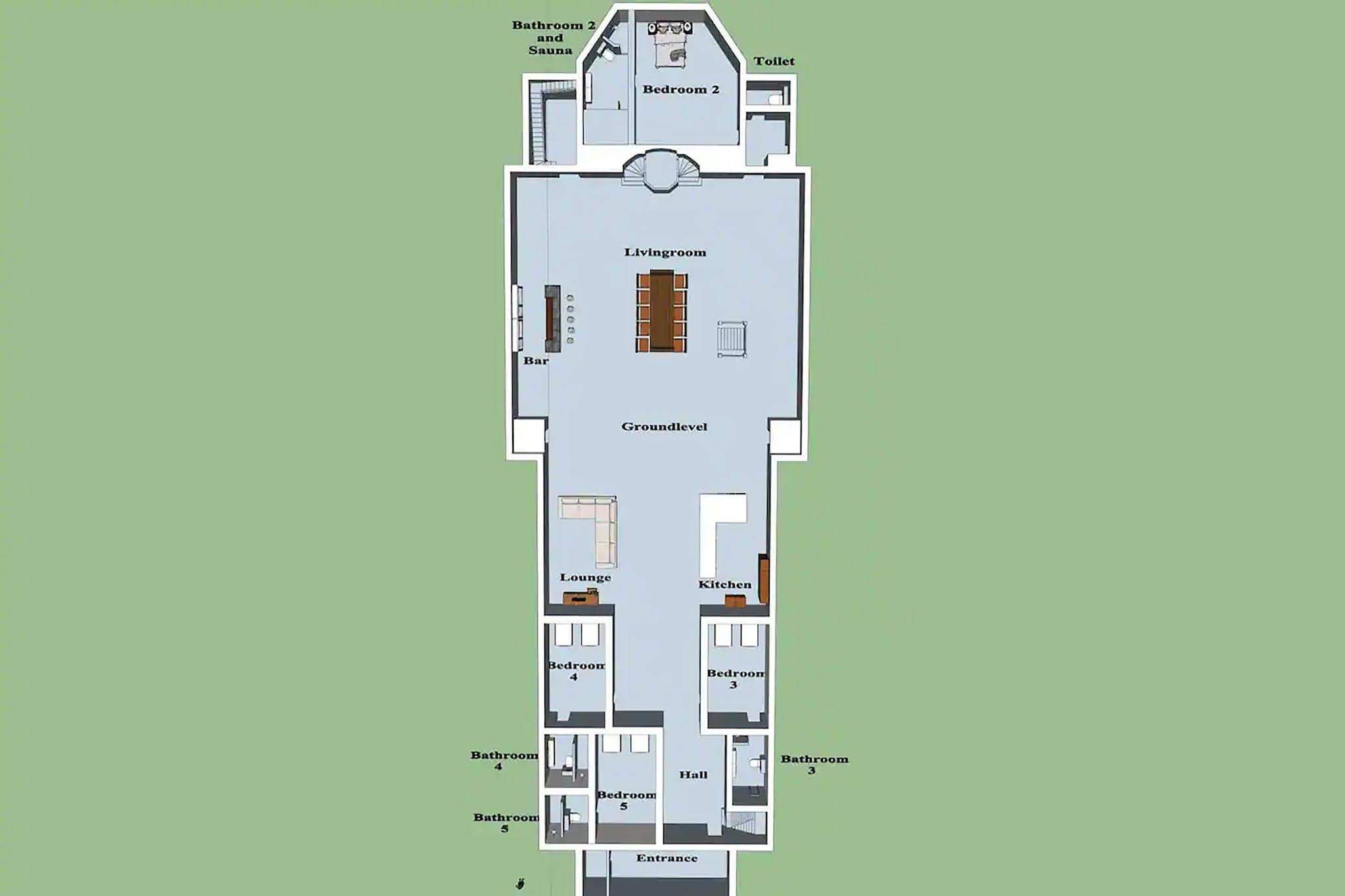 Stueetage: (entre(toilet), åbent køkken(kogeplade(Komfur med seks kogeplader, gas), kaffemaskine(kaffetragt), kaffemaskine(kaffetragt), ovn, ovn, opvaskemaskine , opvaskemaskine , køleskab, fryser), stue / spisestue(Fjernsyn, spisebord, kakkelovn, sofahjørne, bar), Soveværelse med badeværelse(dobbeltseng(180 x 200 cm), Fjernsyn, bruser, sauna, håndvask, toilet), Soveværelse med badeværelse(enkeltseng, enkeltseng, Fjernsyn, bruser, håndvask, toilet), Soveværelse med badeværelse(enkeltseng, enkeltseng, Fjernsyn, bruser, håndvask, toilet), Soveværelse med badeværelse(enkeltseng, enkeltseng, Fjernsyn, bruser, håndvask, toilet)) På 1. etage: (Soveværelse med badeværelse(dobbeltseng(180 x 200 cm), Fjernsyn, Bubble bath, bruser, toilet, balkon), åbent rum) tørretumbler, vaskemaskine, whiteboard, klimaanlæg, terrasse, have, havemøbler, parkering