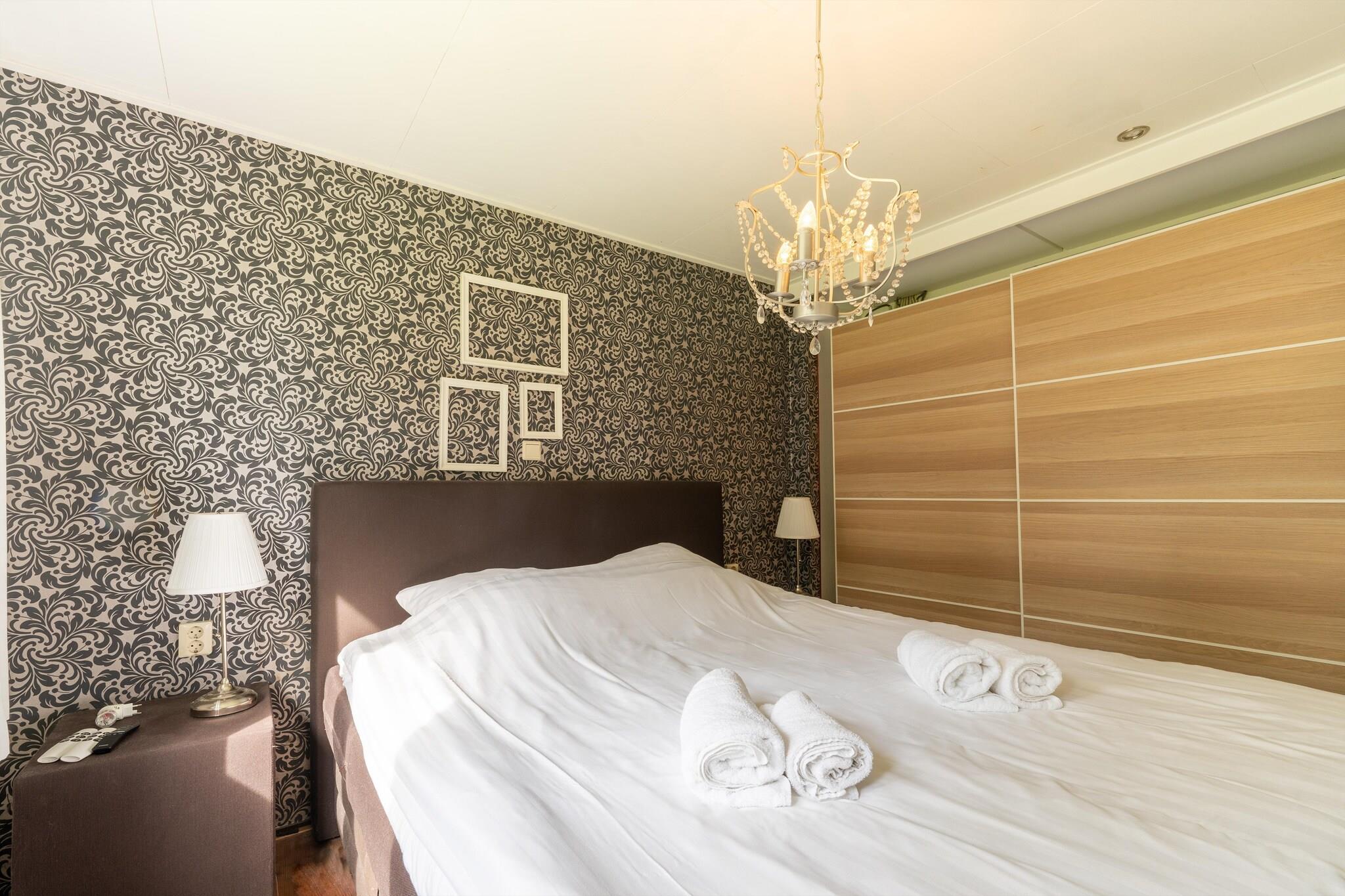 Tilbring en afslappende ferie i det vandrige Friesland. Denne hytte er ideel til familier og ligger på en rummelig grund på 400 m2. Man kan fortøje en båd ved kajen, og der er anløbsbro. Du kan blive længere mod et gebyr. Betal til parkchefen. Det brændefyrede spabad er i forhaven med udsigt over græsplænen. Hytten ligger i en blind vej og er det sidste hus på gaden. Så du kan nyde fred og ro her. Du er kun 10 minutter med båd fra IJselmeer. Det nærmeste supermarked ligger 5 km væk i nabolandsbyen Lemmer. Her finder du også skønne strande og hyggelige terrasser. I forhaven, der er adskilt af et plankeværk, er der et grusareal, hvor spabadet også er placeret. Så der er ingen færdselsåre med trafik eller fodgængere. Du kan finde kombinationslåsen til spabadet i den tilgængelige mappe i hytten, eller du kan også spørge den tilstedeværende leder/kontaktperson. Det luksuriøse køkken er fuldt udstyret til at tilberede lækre måltider. Huset er opvarmet overalt, og det er nemt at bo her selv på koldere dage.