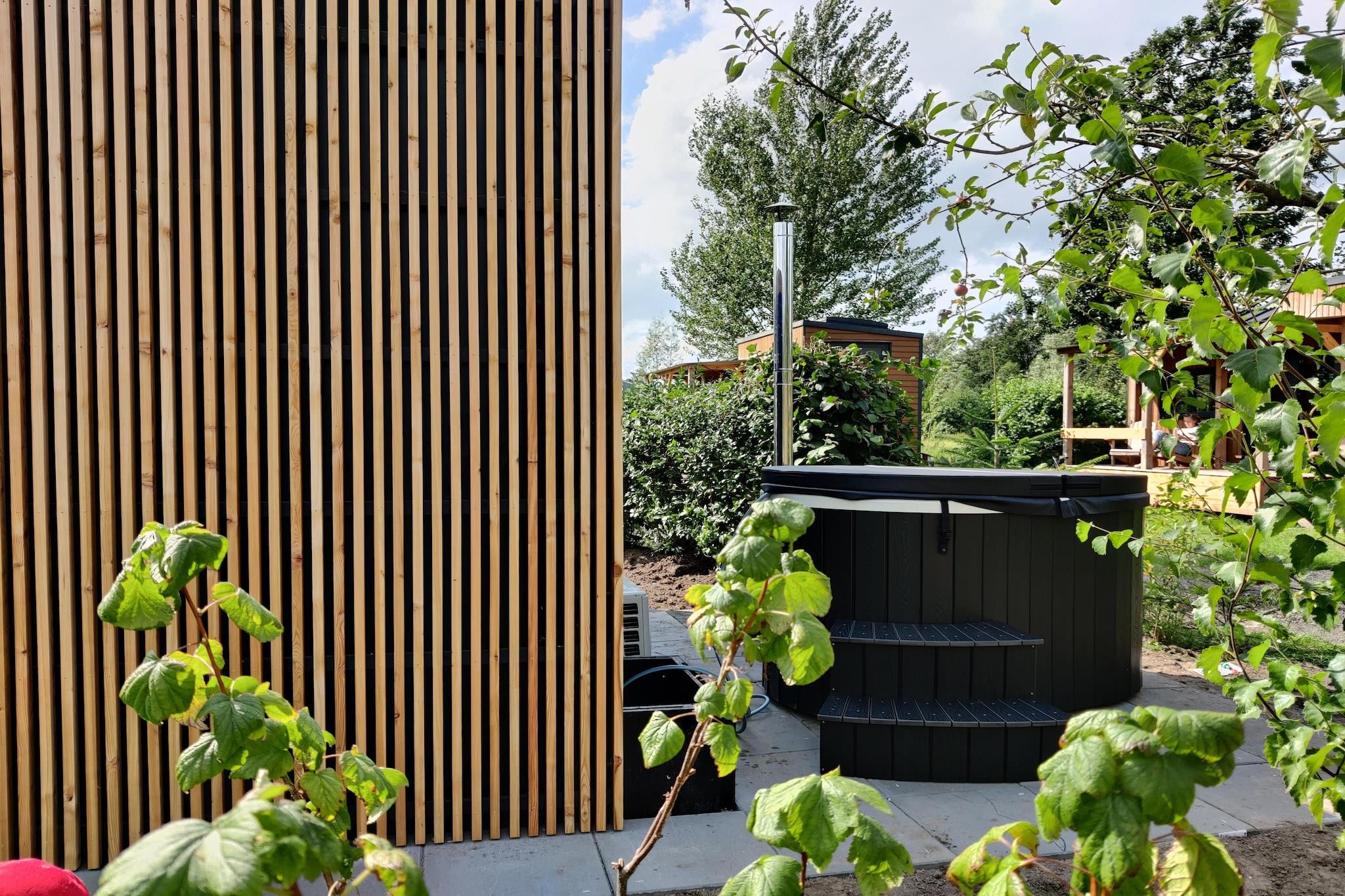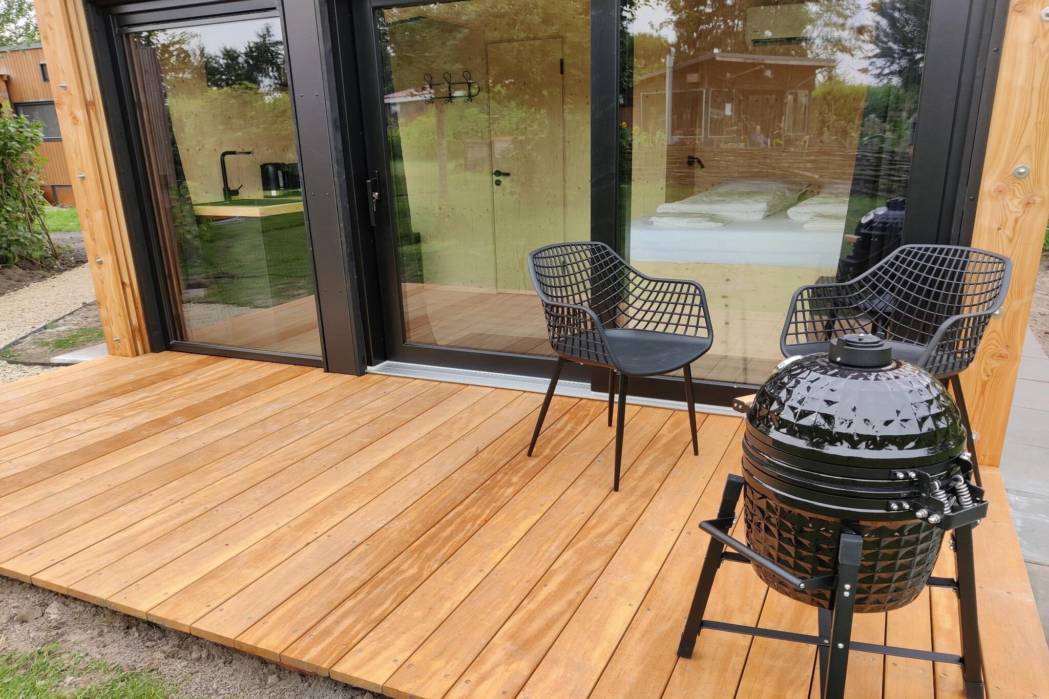 Stueetage: (Køkken(kogeplade(induktion), elkedel), soveværelse(dobbeltseng), badeværelse(bruser, toilet)) sofahjørne, hottub, patio, grill