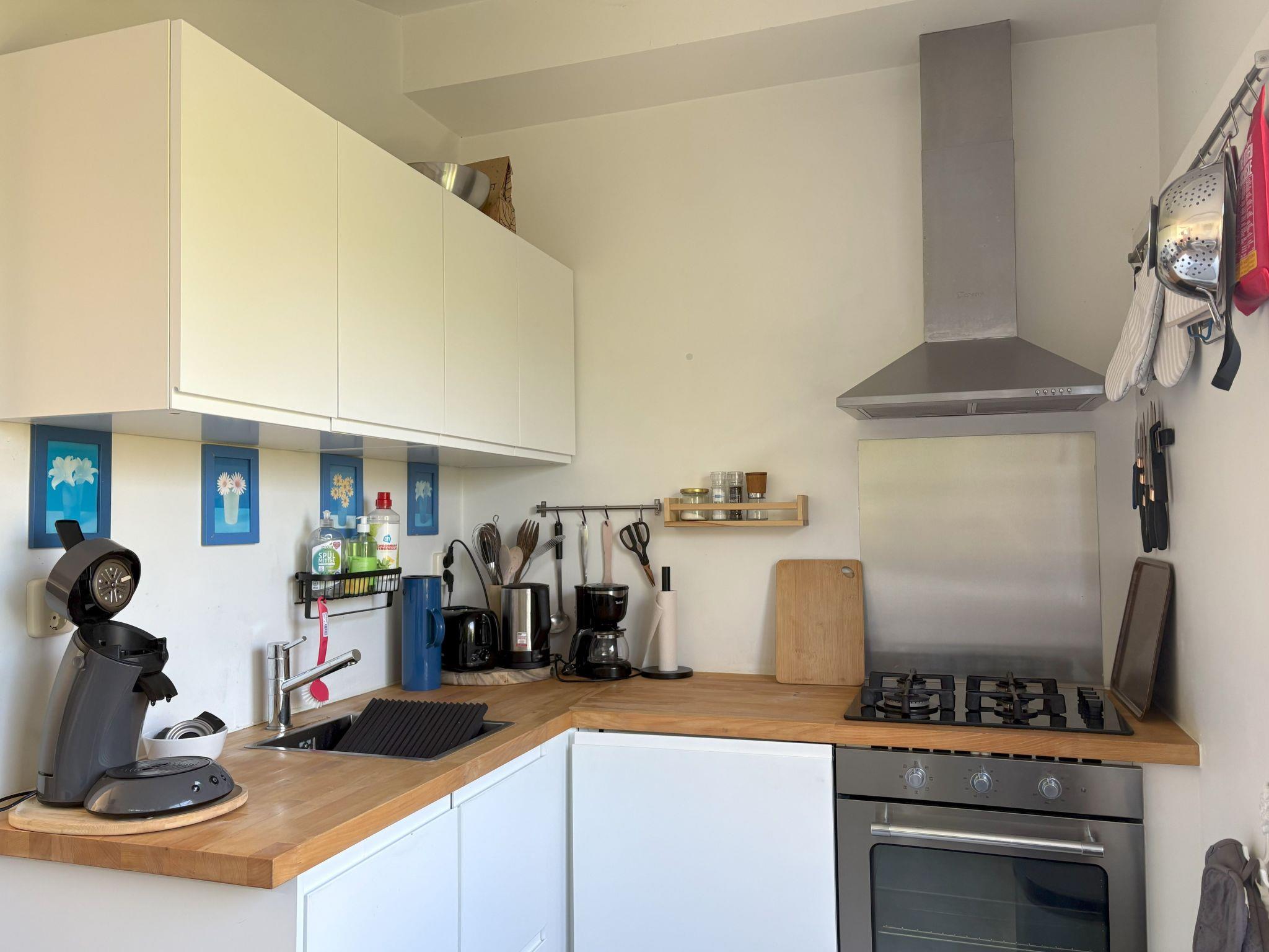 The kitchen is equipped with a gas hob and electric oven, as well as a filter coffee machine and a Senseo machine for coffee pods. A dishwasher, kettle and toaster complete the facilities.