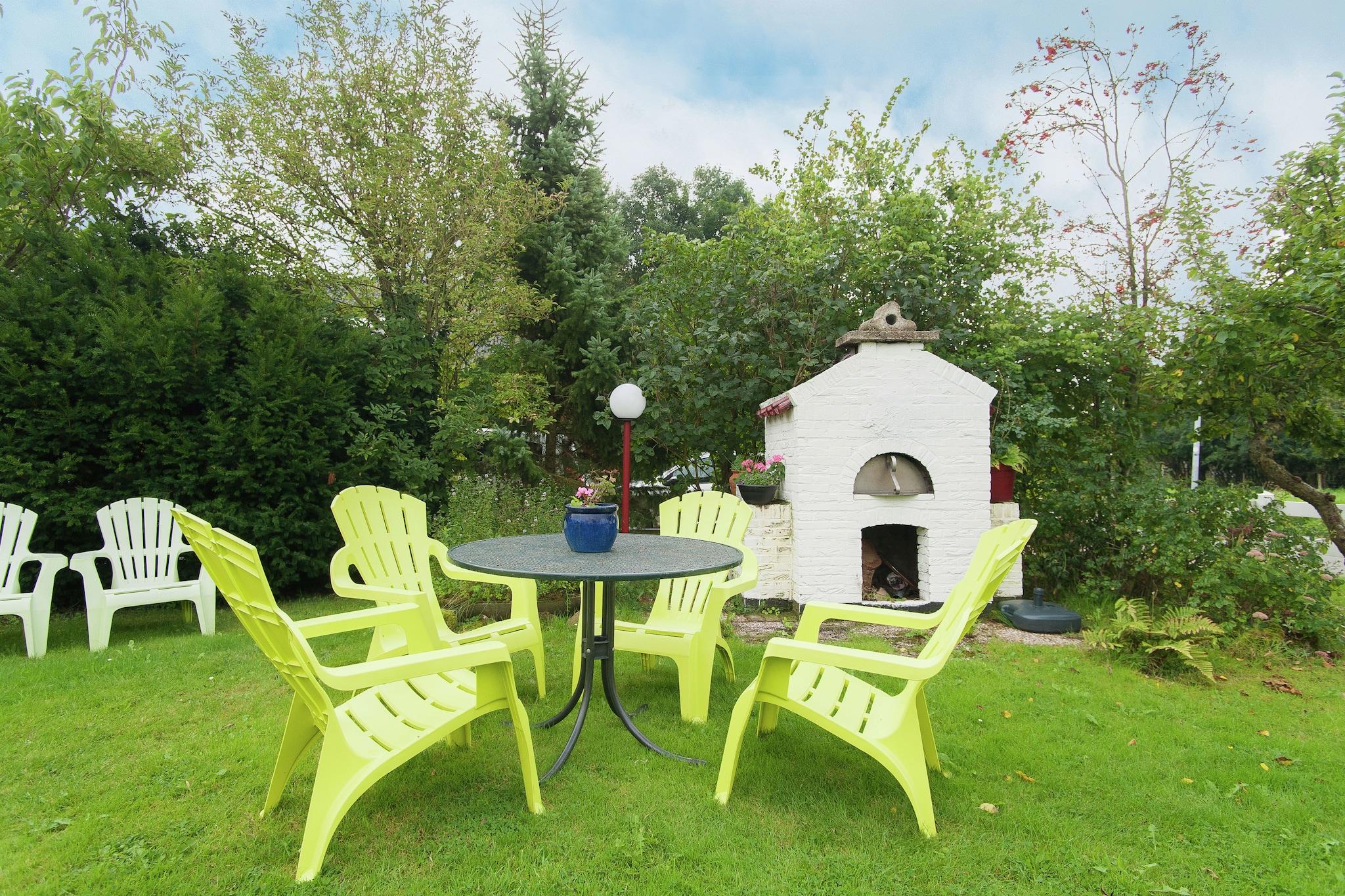 Stueetage: (sofastue(Fjernsyn, pejs), Køkken(spisebord(2 personer), komfur(gas), kaffemaskine, ovn(grill-ovn), opvaskemaskine , fryser, barnestol), stue / spisestue(spisebord(6 personer)), soveværelse(2x enkeltseng), soveværelse(2x enkeltseng), soveværelse(enkeltseng, enkeltseng), badeværelse(badekar, bruser(enhed)), toilet) tørretumbler, tremmeseng, vaskemaskine, patio, varme(central), terrasse(50 m2), have, havemøbler, parkering, trampolin