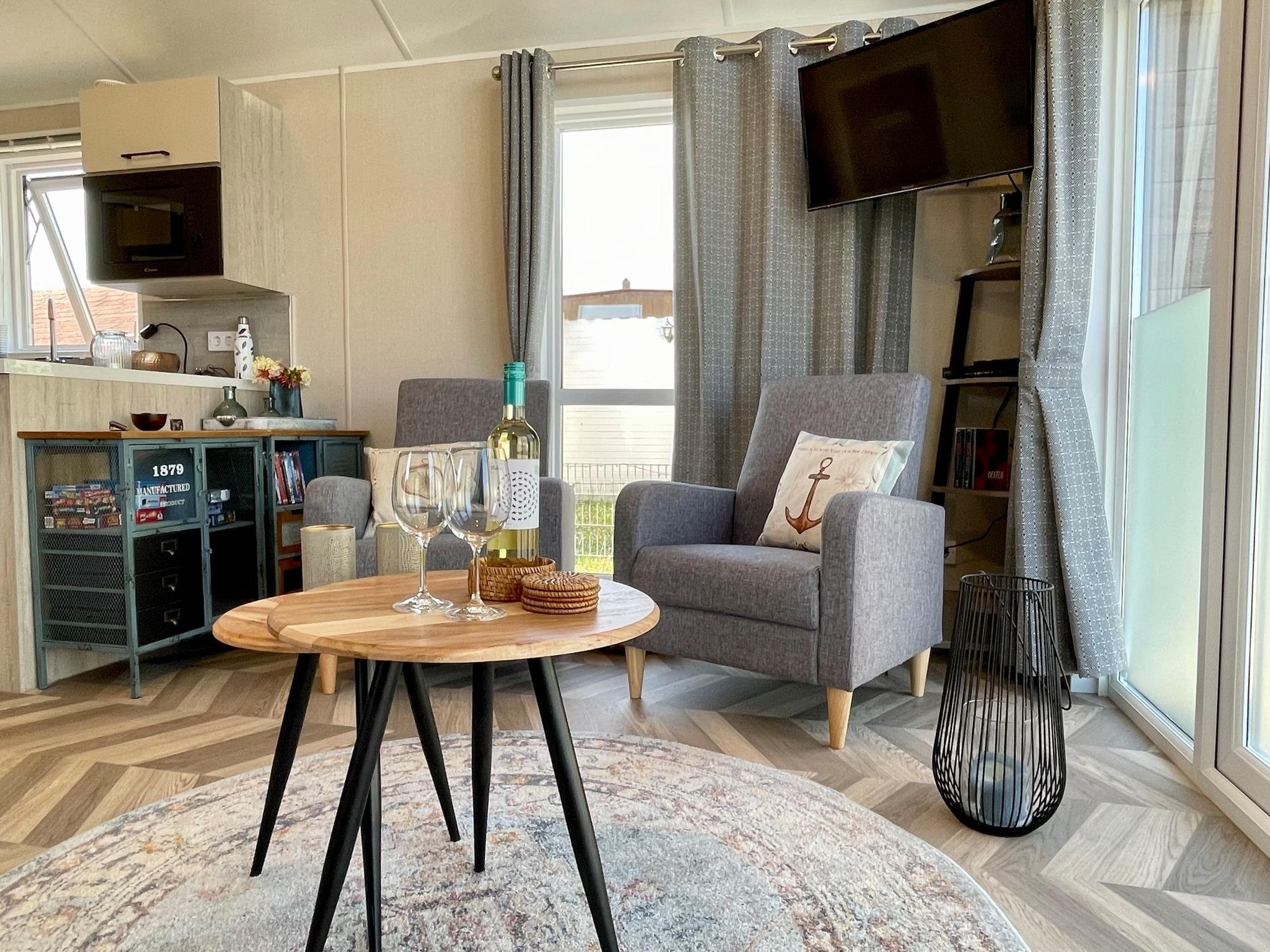 Im Wohnzimmer sorgen Smart-TV, Bluray-Player und eine kleine Auswahl an Spielen, Büchern und Filmen für Unterhaltung – auch an regnerischen Tagen. Dank eigenem WLAN-Anschluss bleibt man auf Wunsch mit der Welt verbunden.