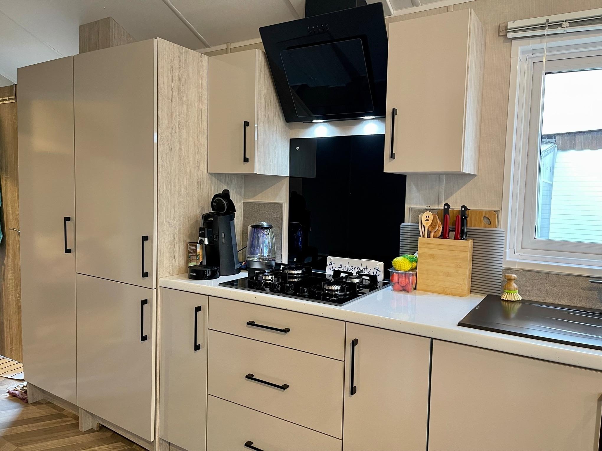 Die Küche ist bestens ausgestattet – ob für das schnelle Frühstück oder das liebevoll zubereitete Abendessen: Gasherd, Kühl-Gefrierkombination, Senseo-Maschine, Toaster, Wasserkocher und Mikrowelle mit Grill stehen bereit. Geschirr, Besteck und Gläser sind natürlich ebenfalls vorhanden.