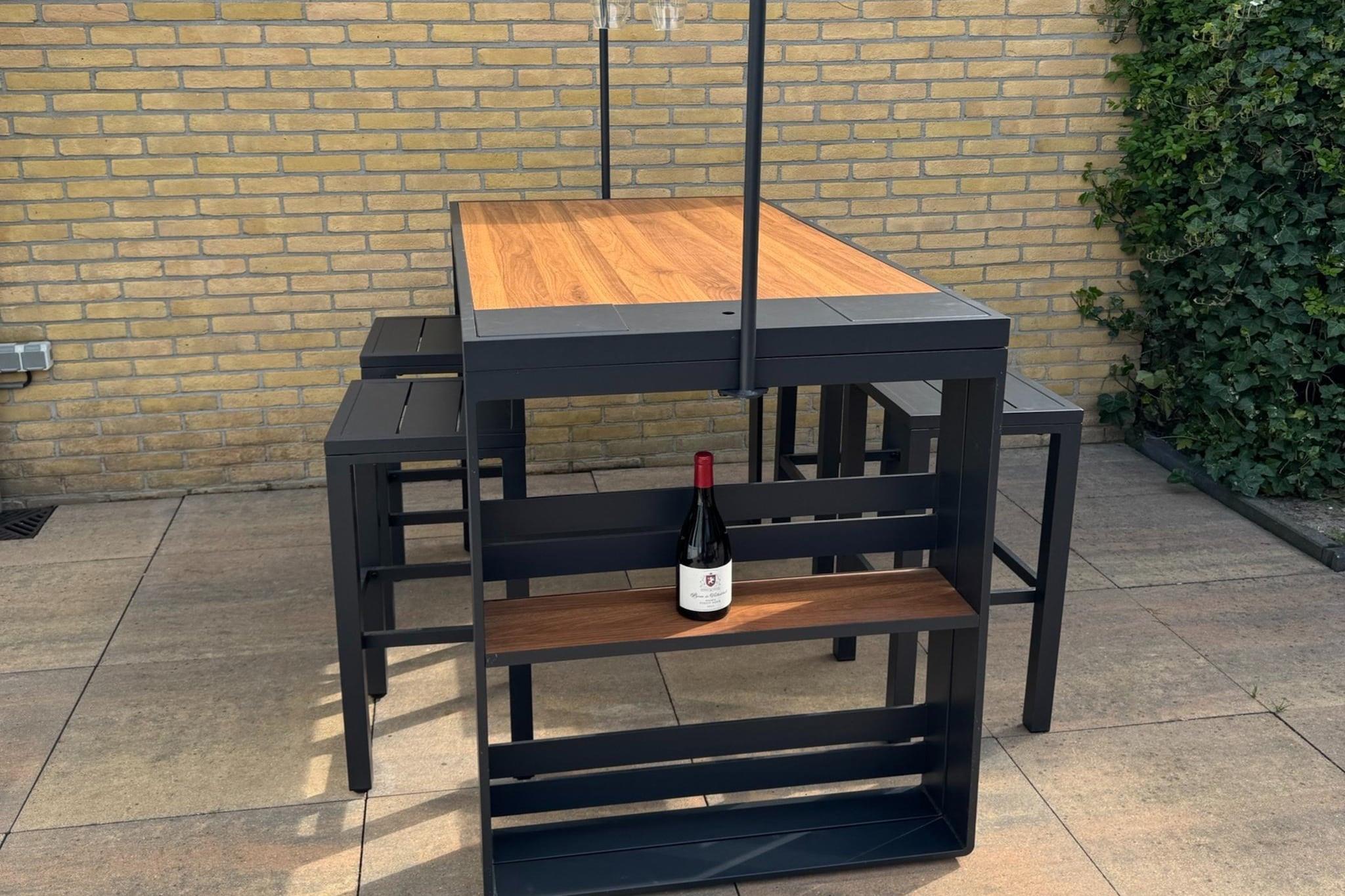 Stueetage: (åbent køkken(kogeplade(Komfur med fire kogeplader, gas), elkedel, brødrister, emhætte, kaffemaskine(kaffetragt, kaffepude), ovn, mikrobølgeovn, køle-fryseskab, (), ()), stue / spisestue(Fjernsyn(fladskærm), spisebord, sofahjørne, radio), soveværelse(dobbeltseng), soveværelse(dobbeltseng), badeværelse(bruser, håndvask, toilet)) Internetadgang, kakkelovn(gas), klimaanlæg, terrasse, have, havemøbler, parkering, liggestole, Parasol, Ladestation til el-biler