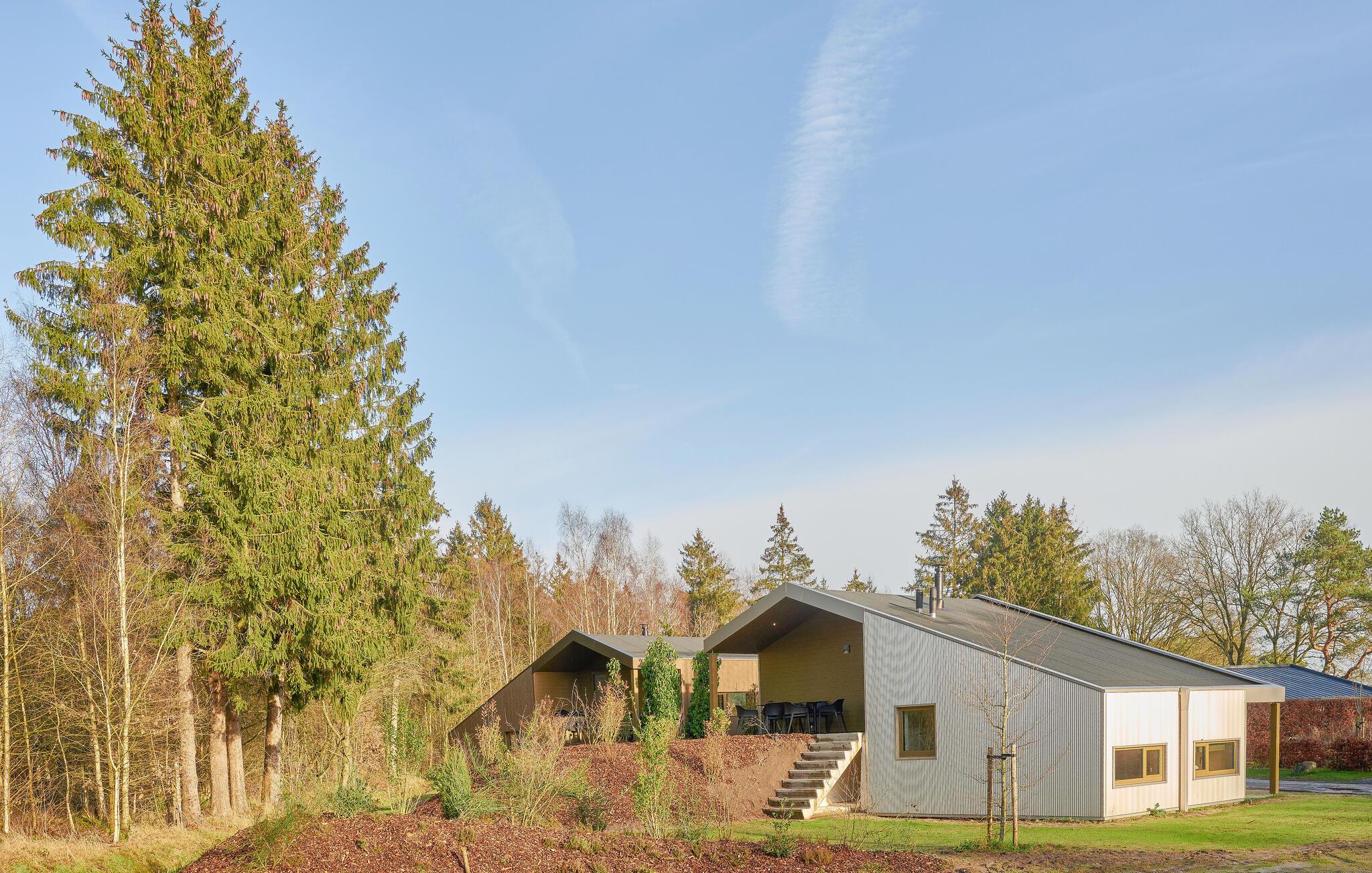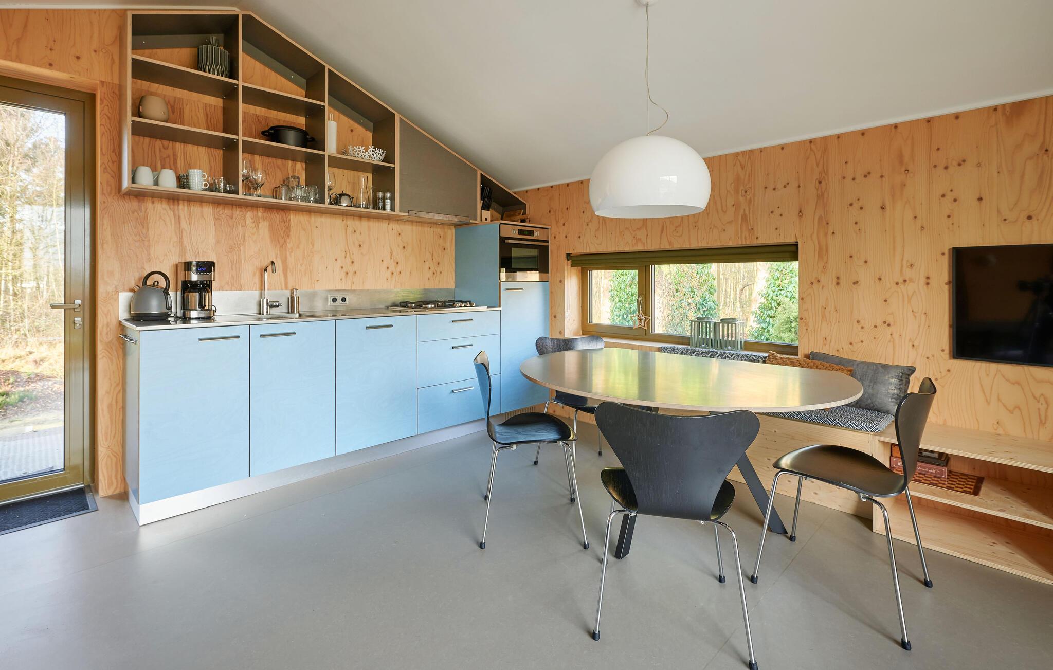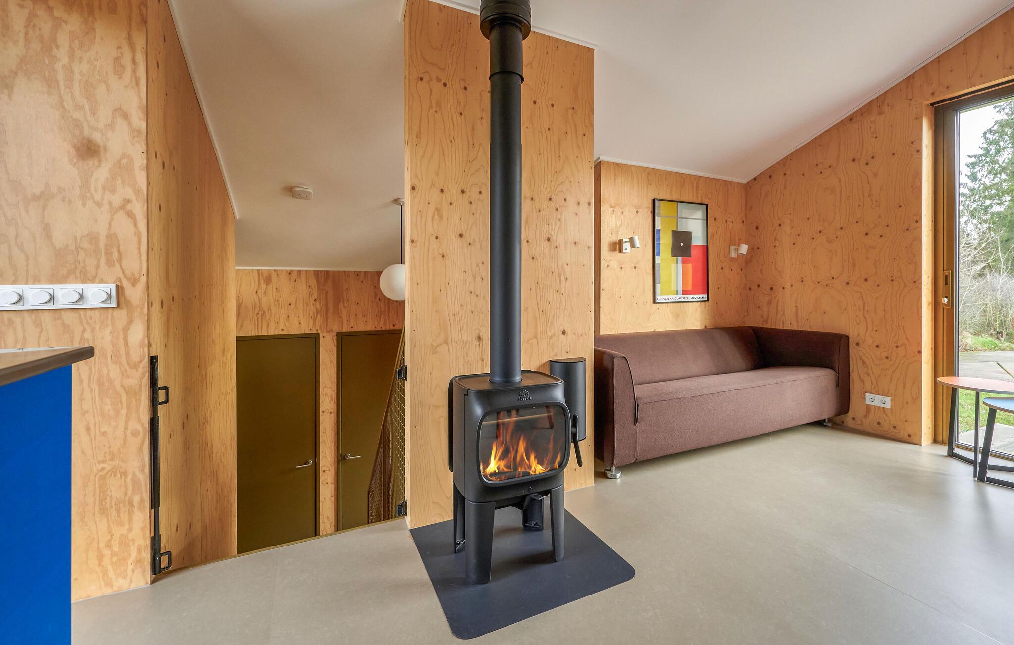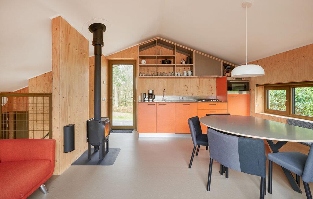 Velkommen til dette indbydende og moderne tre-etagers hjem. Det arkitektonisk legende design byder på en unik rumlig oplevelse og er omhyggeligt indrettet i en moderne og minimalistisk stil. Her kan I undslippe hverdagens stress og jag og slappe helt af i smuk natur. Det farverige, fuldt udstyrede køkken lægger op til at tilberede lækre måltider. Saml jer om det særlige spisebord, slap af i sofaen med en god film eller nyd varmen fra brændeovnen om aftenen. Fra stuen har man en smuk udsigt over skoven og naturreservatet Terhorsterzand med sine heder, skove og hede.