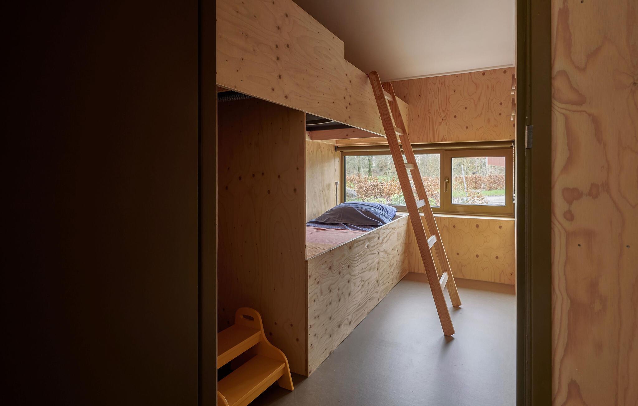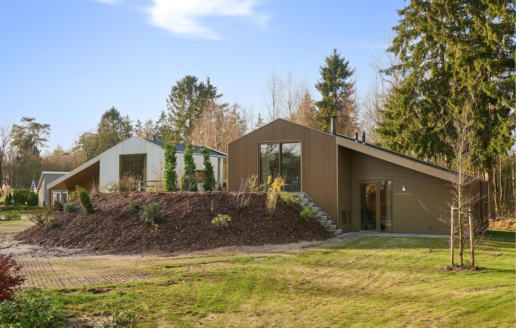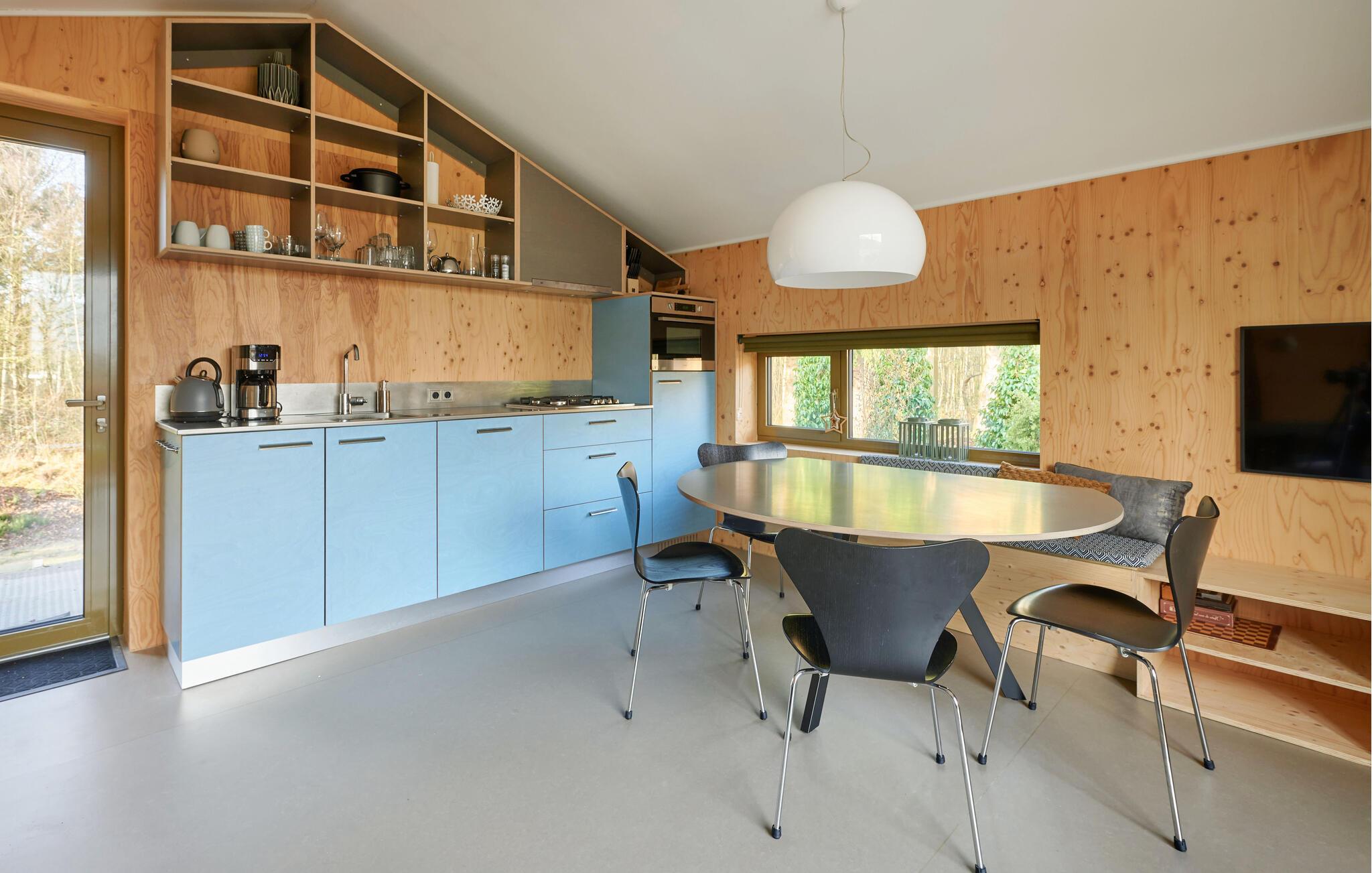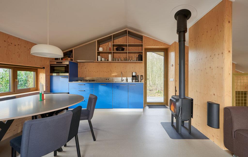 Velkommen til dette indbydende og moderne tre-etagers hjem. Det arkitektonisk legende design byder på en unik rumlig oplevelse og er omhyggeligt indrettet i en moderne og minimalistisk stil. Her kan I undslippe hverdagens stress og jag og slappe helt af i smuk natur. Det farverige, fuldt udstyrede køkken lægger op til at tilberede lækre måltider. Saml jer om det særlige spisebord, slap af i sofaen med en god film eller nyd varmen fra brændeovnen om aftenen. Fra stuen har man en smuk udsigt over skoven og naturreservatet Terhorsterzand med sine heder, skove og hede.