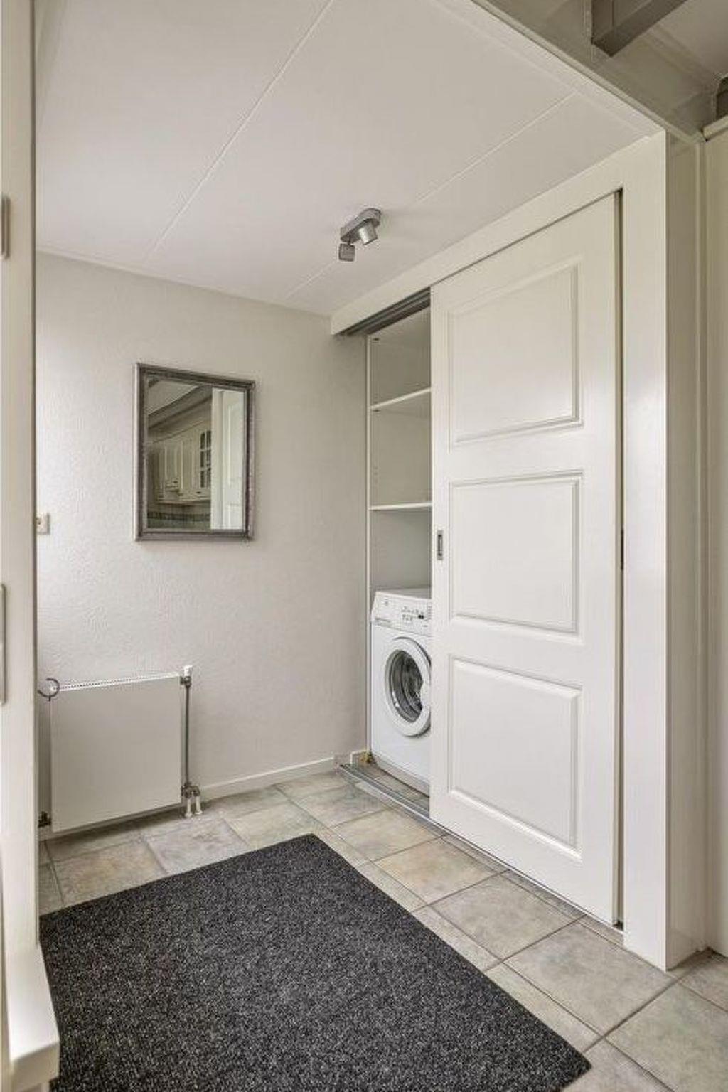 Next to the kitchen, there is an intermediate hall with space for coats and shoes and access to the bathroom. The bathroom is fully tiled and has a walk-in shower, thermostatic tap, hanging toilet, design radiator and a nice vanity unit.