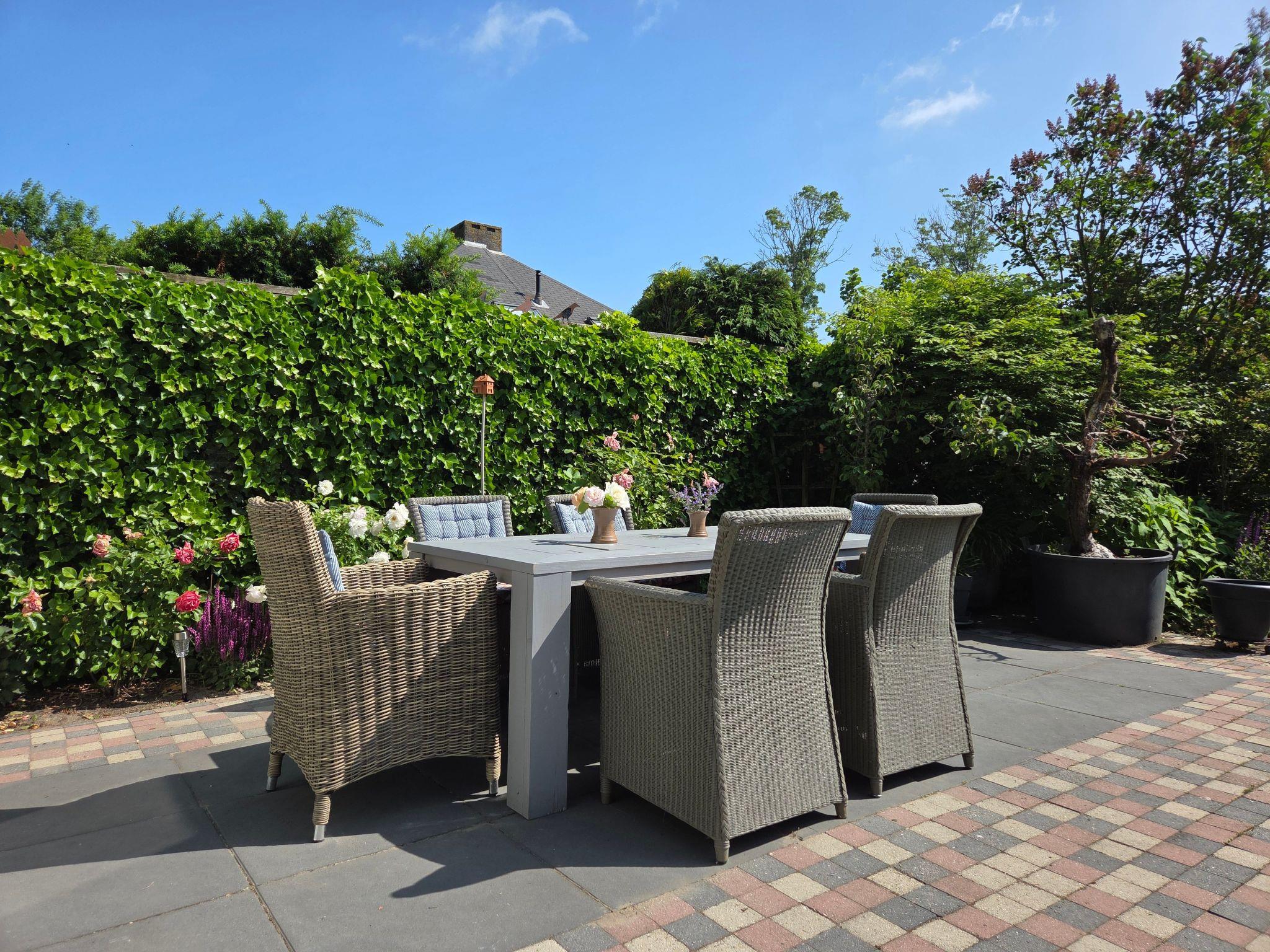 The sunny garden has a paved terrace, ornamental garden and a luxury stone shed with double doors. This is ideal for storing bicycles, diving equipment, etc. The shed can be left locked and is equipped with light and electricity. There is also patio furniture to enjoy the sun. For those who prefer some shade, there is also an awning.
