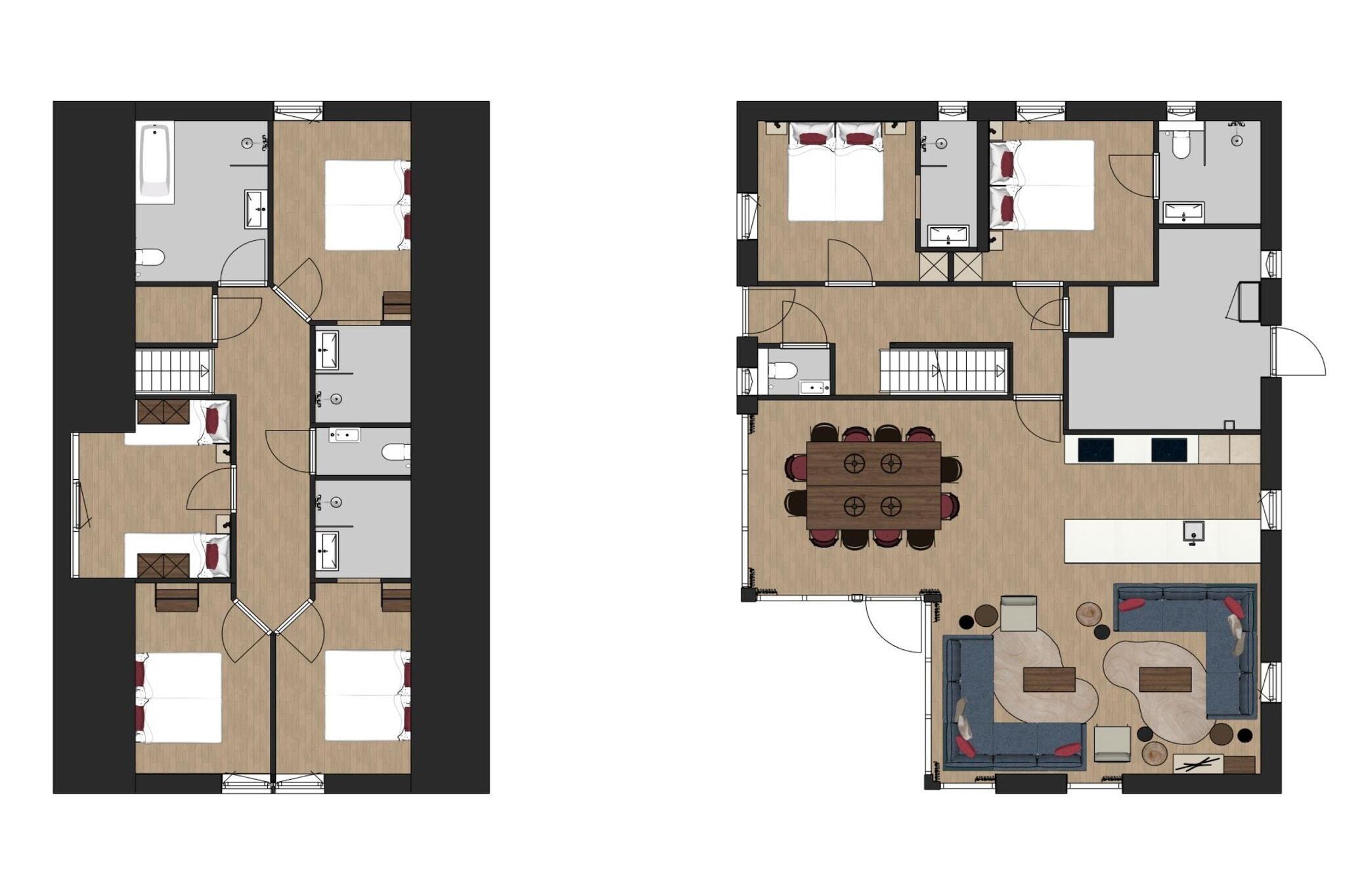 Stueetage: (åbent køkken(kogeplade(induktion), elkedel, brødrister, espressomaskine, combi-mikroovn, opvaskemaskine , køle-fryseskab, Stavblender, , ), stue / spisestue(Fjernsyn(Smart-TV), spisebord, sofahjørne), Soveværelse med badeværelse(enkeltseng, enkeltseng, badekar eller bruser, håndvask, toilet), Soveværelse med badeværelse(enkeltseng, enkeltseng, badekar eller bruser, håndvask, toilet), toilet(toilet)) På 1. etage: (soveværelse(dobbeltseng), soveværelse(dobbeltseng), Soveværelse med badeværelse(enkeltseng, enkeltseng, badekar eller bruser, håndvask), Soveværelse med badeværelse(enkeltseng, enkeltseng, badekar eller bruser, håndvask), badeværelse(badekar med bruser, bruser, håndvask, toilet), toilet(toilet)) udekøkken, varme(gulvvarme), terrasse, have, havemøbler, grill, parkering, Parasol, barnestol, havepejs