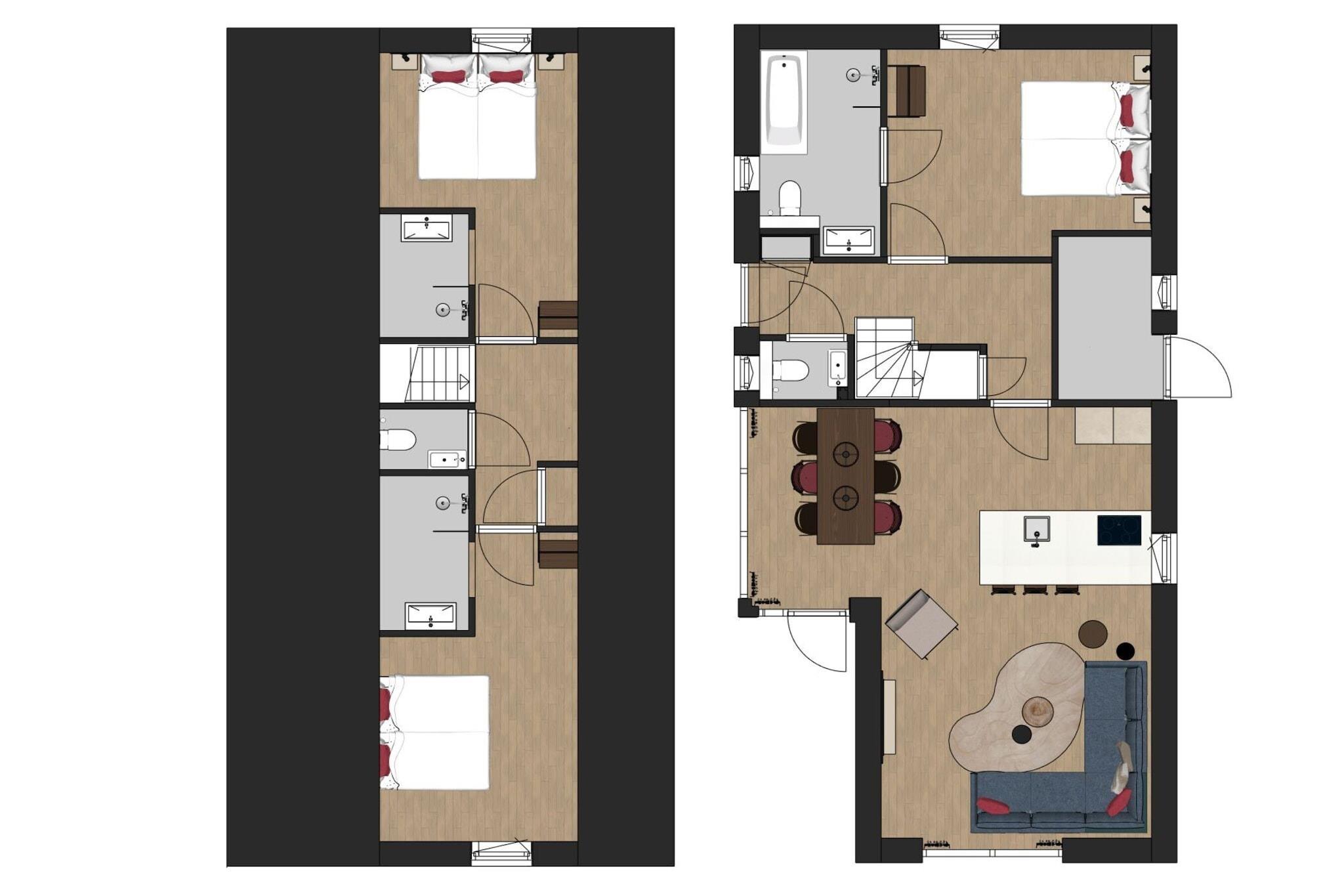 Stueetage: (Køkken(kogeplade(induktion), elkedel, brødrister, espressomaskine, combi-mikroovn, opvaskemaskine , køle-fryseskab, Stavblender, , ), stue / spisestue(Fjernsyn(Smart-TV), spisebord, sofahjørne), Soveværelse med badeværelse(enkeltseng, enkeltseng, badekar eller bruser, håndvask, toilet), Soveværelse med badeværelse(enkeltseng, enkeltseng, badekar eller bruser, håndvask), Soveværelse med badeværelse(enkeltseng, enkeltseng, bruser, håndvask), toilet(toilet)) hottub, sauna, varme(gulvvarme), terrasse, have, havemøbler, parkering, Parasol, barnestol