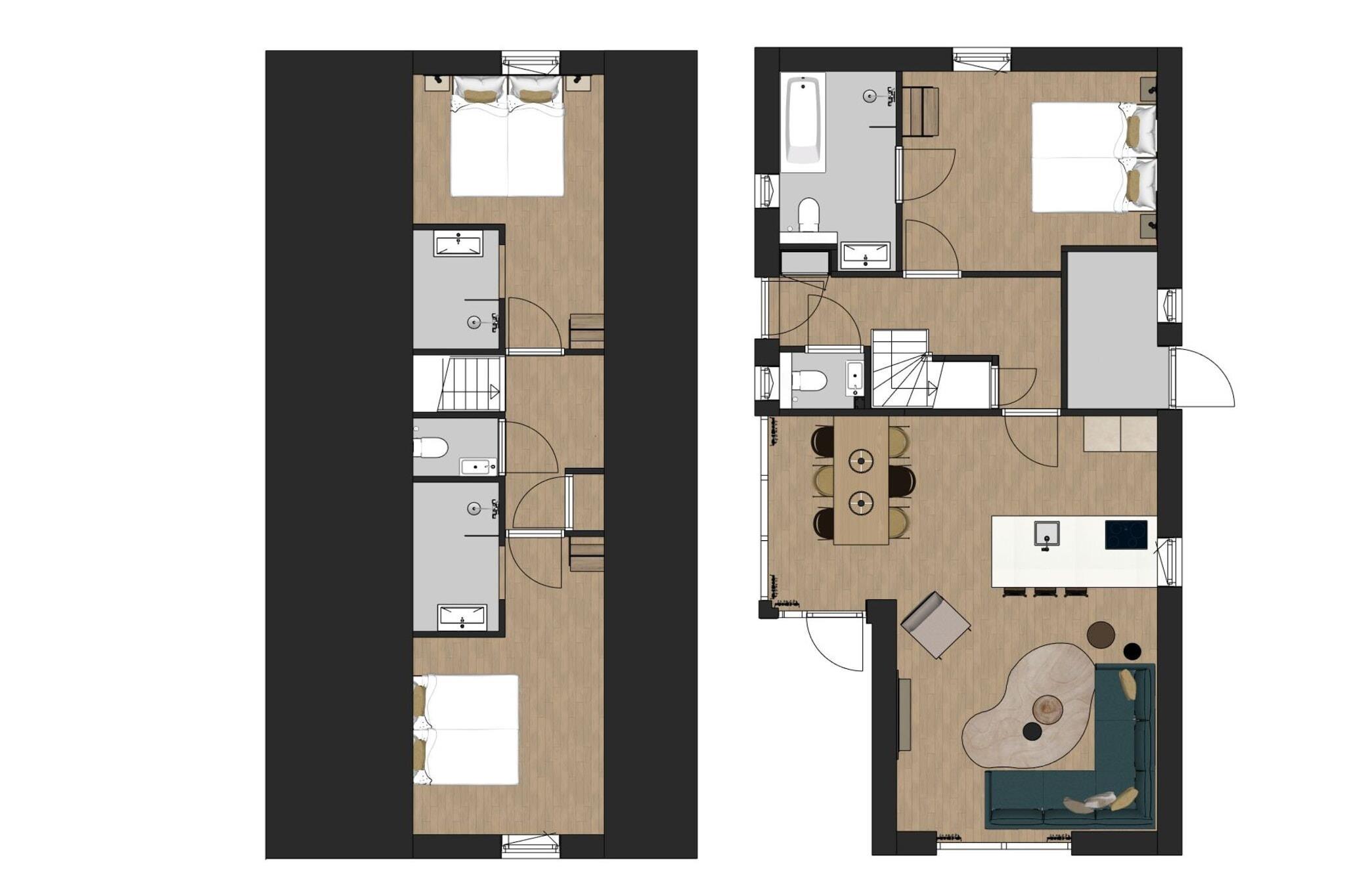 Luksuskomfort i fredelige omgivelser Velkommen til et stilfuldt, fritliggende feriehus på Dormio Resort De Hondsrug, designet til op til 6 gæster. Beliggende på et roligt sted i udkanten af feriestedet, tilbyder det uhindret udsigt over bækken og den omkringliggende natur. Med 3 soveværelser - hver med eget badeværelse - og ca. Med sine 107 m² er det det perfekte sted at slappe af i komfort. Den hyggelige stue har et smart-tv og en rummelig spiseplads, mens det moderne åbne køkken inkluderer en kogeø, kombiovn, opvaskemaskine, køleskab med fryser, Nespresso og en filterkaffemaskine. Slap af udendørs med privat sauna og spabad Fra stuen går du ud på din private terrasse, der er delvist overdækket og udstyret med havemøbler. Nyd en fredfyldt udsigt og ren afslapning i dit private udendørs wellness-område, komplet med en traditionel tøndesauna og et spabad. Uanset om du starter din morgen med et fredeligt bad eller afslutter dagen under stjernerne, er denne have skabt til at genoplade. Veludstyret til et ubekymret ophold Et soveværelse med eget badeværelse (med badekar og bruser) ligger i stueetagen - ideelt for tilgængelighed. Ovenpå har yderligere to soveværelser hver eget badeværelse med bruseniche. Der er også separate toiletter på begge etager. Yderligere faciliteter inkluderer gratis WiFi, gulvvarme, to private parkeringspladser og en sikker cykelopbevaring med et ladepunkt til elcykler.