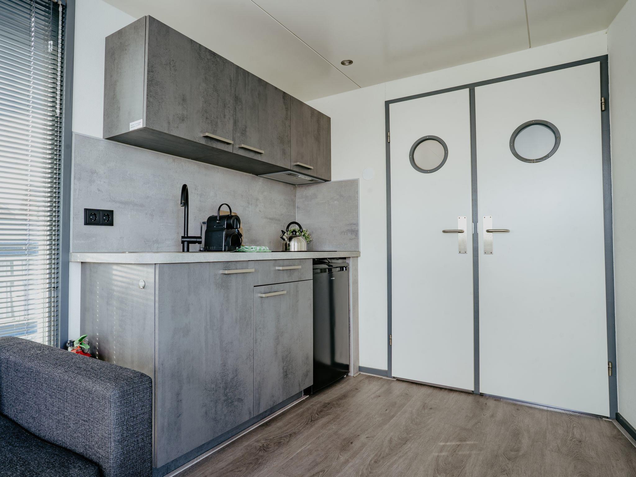 "Havenlodge", 3-room house 26 m2. Comfortable furnishings: living/dining room with dining table and flat screen. Exit to the terrace. 1 double bedroom with 2 beds. Exit to the terrace. 1 double bedroom with 1 x 2 bunk beds. Small, open kitchen (4 induction hot plates, electric coffee machine). Shower/WC. Underfloor heating. Terrace. Terrace furniture. Panoramic view of the lake. Facilities: Internet (WiFi, free). Please note: non-smoking house. Maximum 2 pets/ dogs allowed. Smoke alarm. This is a houseboat.