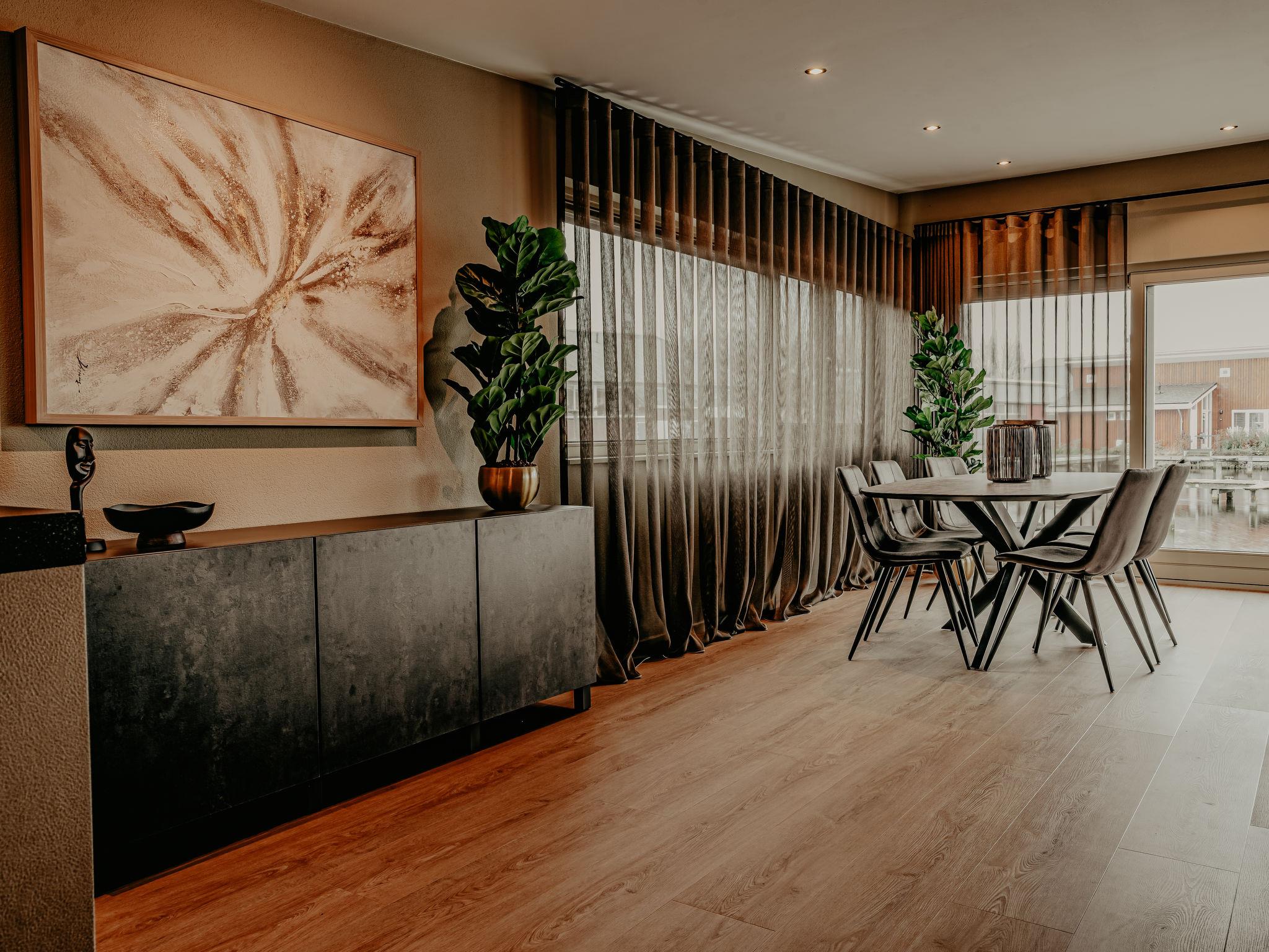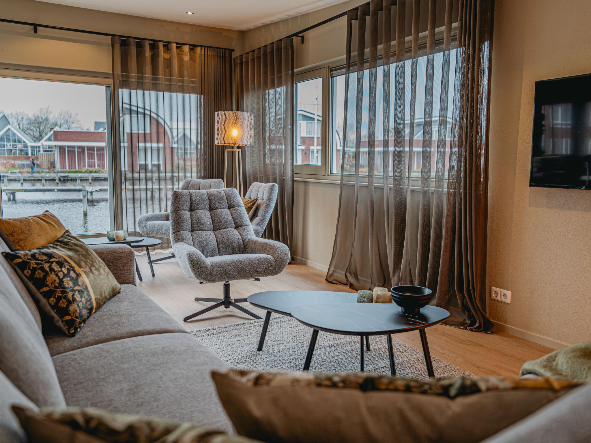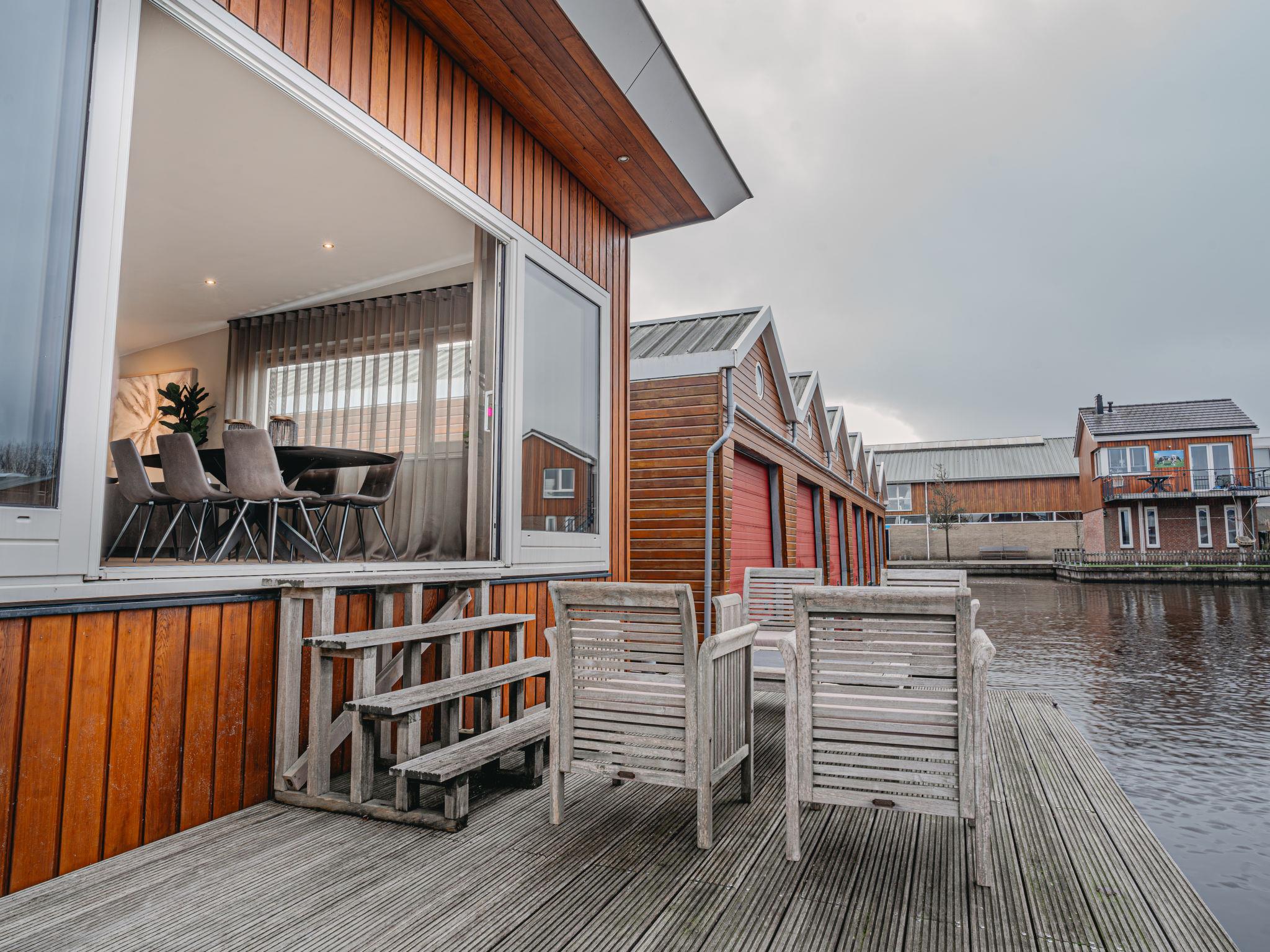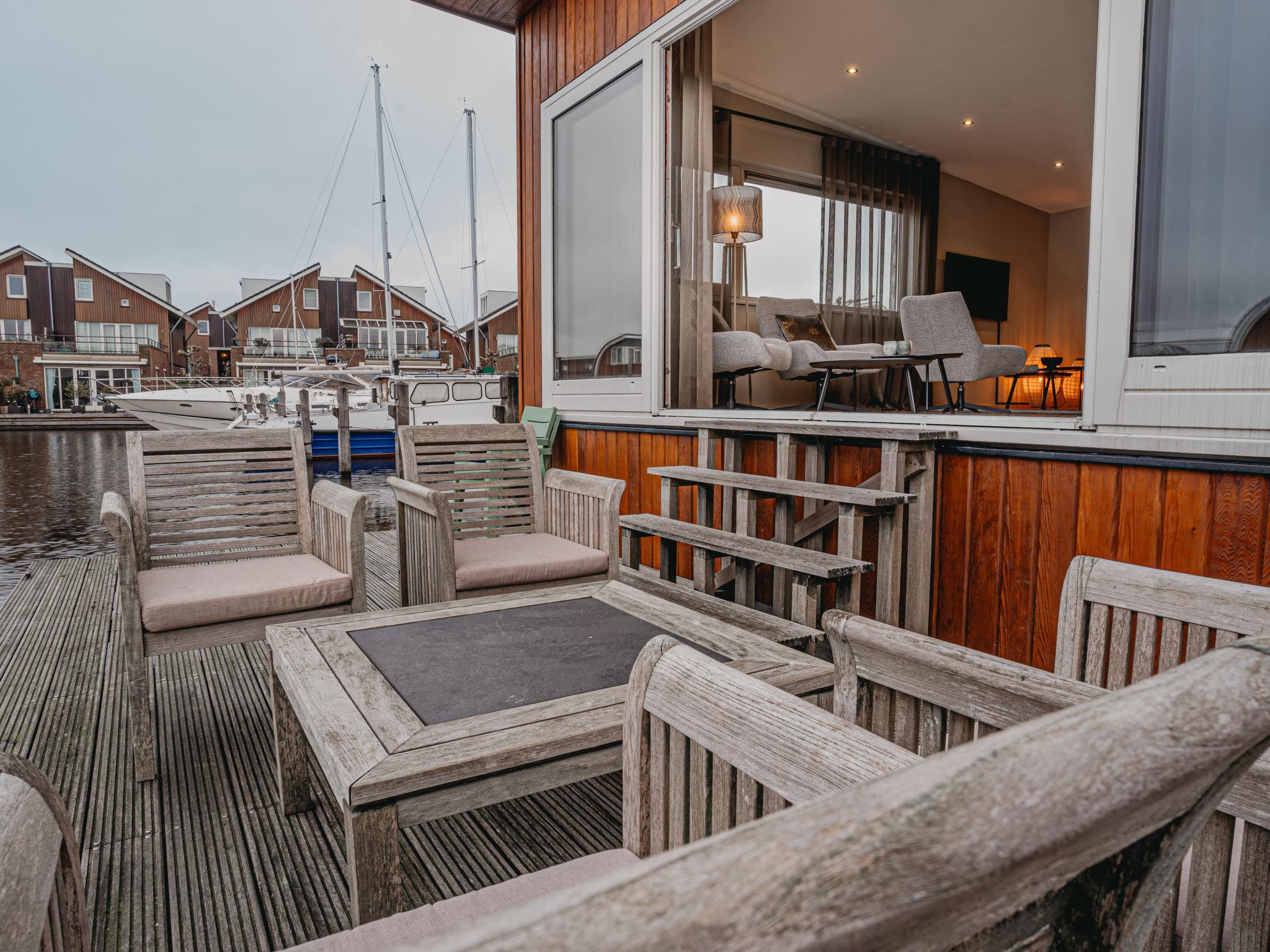 "De Woude", 4-room house 110 m2 on 2 levels. Practical furnishings: entrance hall with separate WC. Living/dining room with dining table, TV, radio, CD-player and DVD. Exit to the terrace. Large, open kitchen (4 hot plates, dishwasher, kettle, electric coffee machine, combination microwave). Heating. On the lower ground floor: 3 rooms, each room with 2 beds. Shower/WC. 2 terraces. Terrace furniture. Facilities: washing machine, dryer. Internet (WiFi, free). Please note: non-smoking house. Smoke alarm. This is a houseboat.
