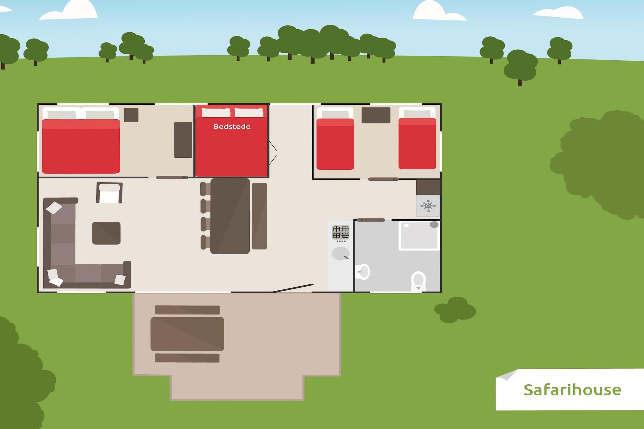 Stueetage: (entre(dobbeltalkove), Stue(Fjernsyn(fladskærm), kakkelovn), åbent køkken(elkedel, komfur(Komfur med fire kogeplader), kaffemaskine(kaffetragt), combi-mikroovn, opvaskemaskine , køle-fryseskab), soveværelse(2x enkeltseng), soveværelse(2x køjeseng), badeværelse(bruser, håndvask, toilet)) veranda, terrasse(overdækket), havemøbler, swimmingpool(deles med andre gæster), hængekøje, loungemøbler