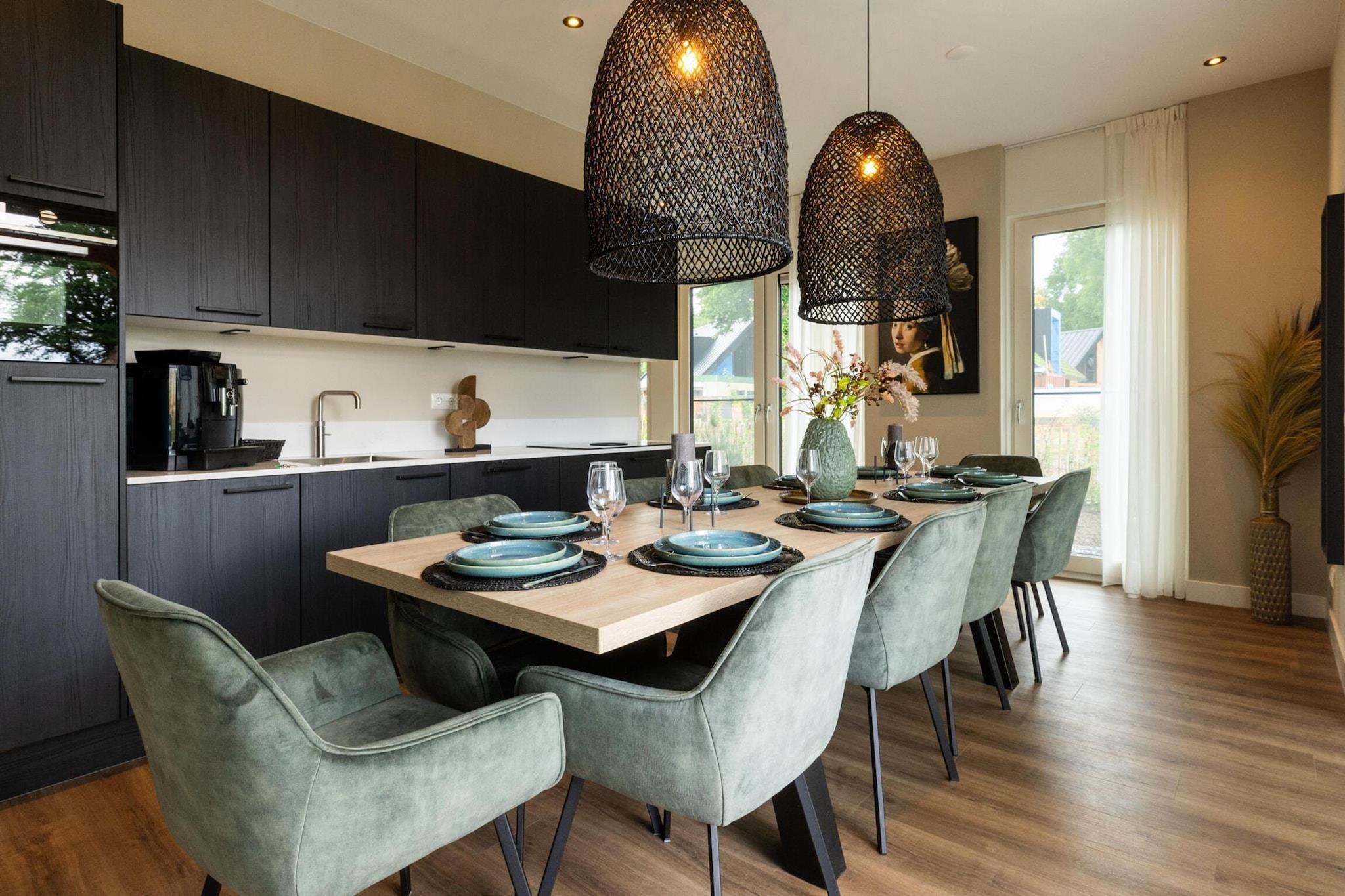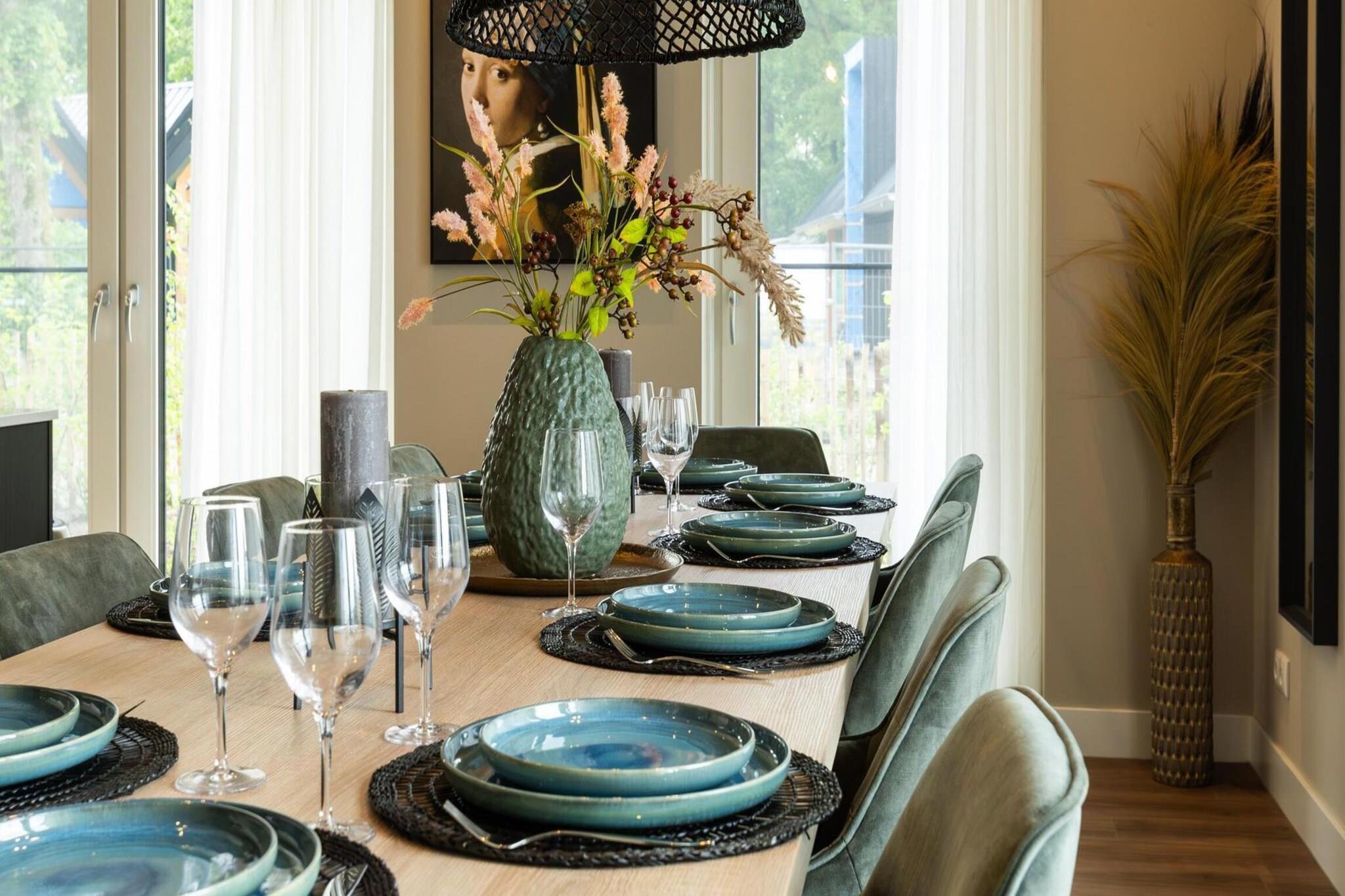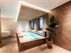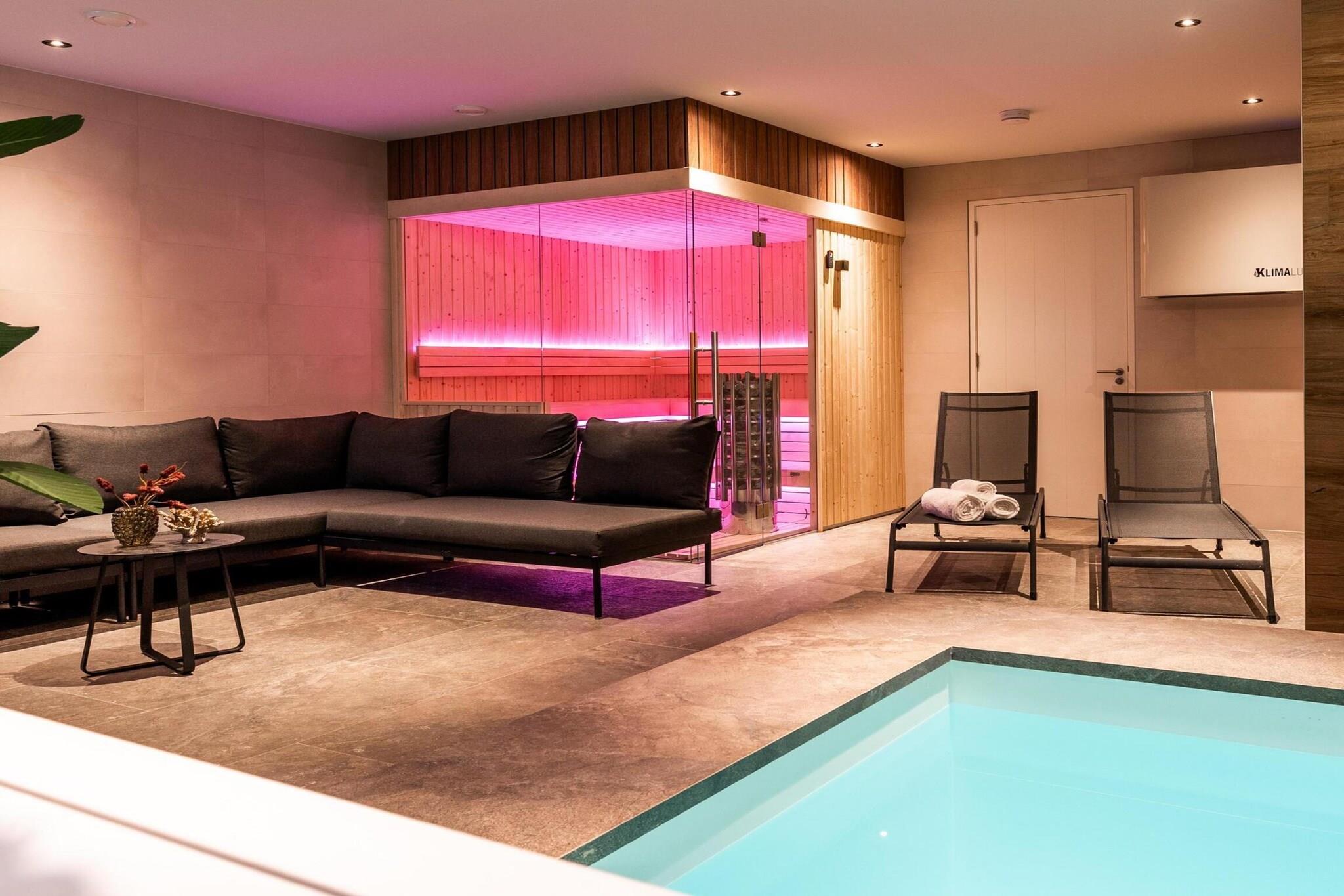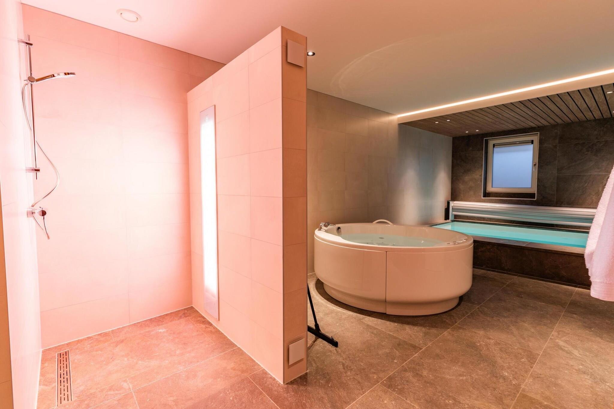 Stueetage: (Stue(sofahjørne), spisestue(spisebord), åbent køkken(komfur, kaffemaskine, ovn, mikrobølgeovn, opvaskemaskine , køle-fryseskab), Soveværelse med badeværelse(dobbeltseng, bruser, håndvask, toilet), Soveværelse med badeværelse(dobbeltseng, bruser, håndvask, toilet)) På 1. etage: (Soveværelse med badeværelse(dobbeltseng, bruser, håndvask, toilet), Soveværelse med badeværelse(dobbeltseng, bruser, håndvask, toilet), Soveværelse med badeværelse(køjeseng eller 2 enkeltsenge, køjeseng eller 2 enkeltsenge, bruser, håndvask, toilet)) Kælderetage: (hottub, bruser, toilet, solstole, private indoor pool)
