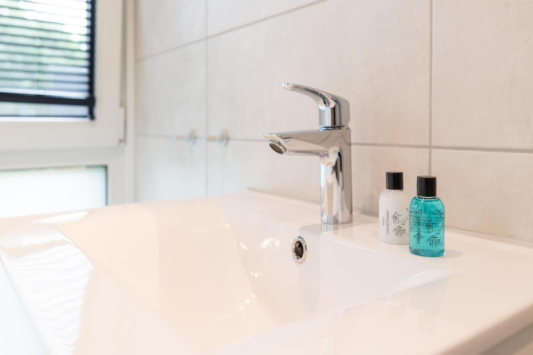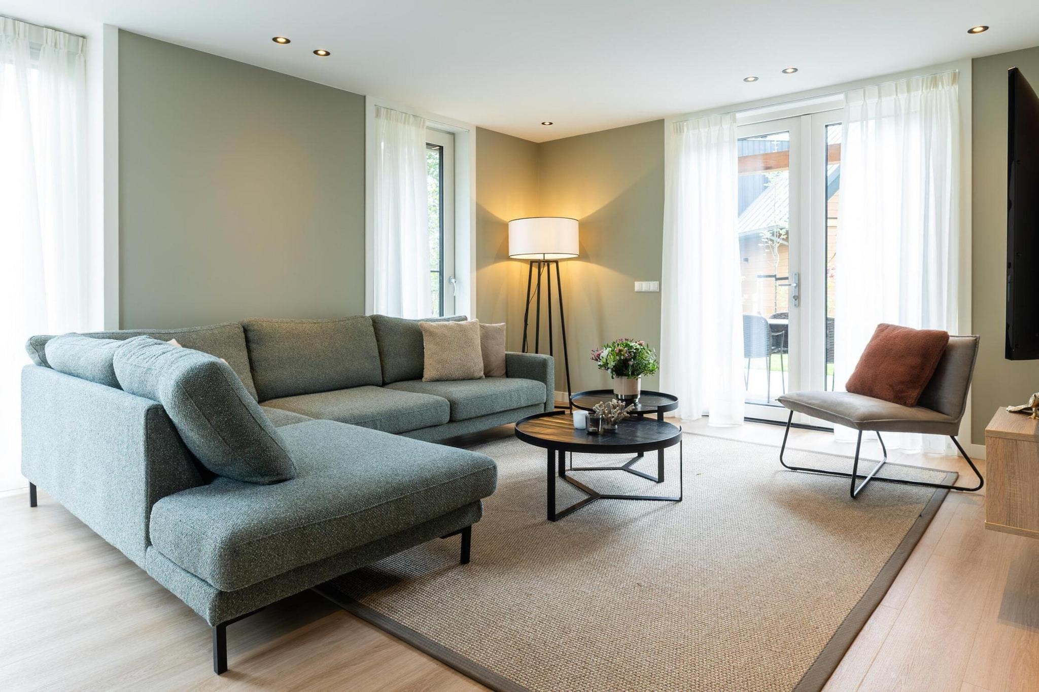 Stueetage: (åbent køkken(komfur, kaffemaskine, combi-mikroovn, opvaskemaskine , køle-fryseskab), stue / spisestue(spisebord, sofahjørne), Soveværelse med badeværelse(dobbeltseng, bruser, håndvask, toilet), toilet(toilet)) På 1. etage: (Soveværelse med badeværelse(dobbeltseng, bruser, håndvask, toilet), Soveværelse med badeværelse(dobbeltseng, bruser, håndvask, toilet)) terrasse, have, parkering