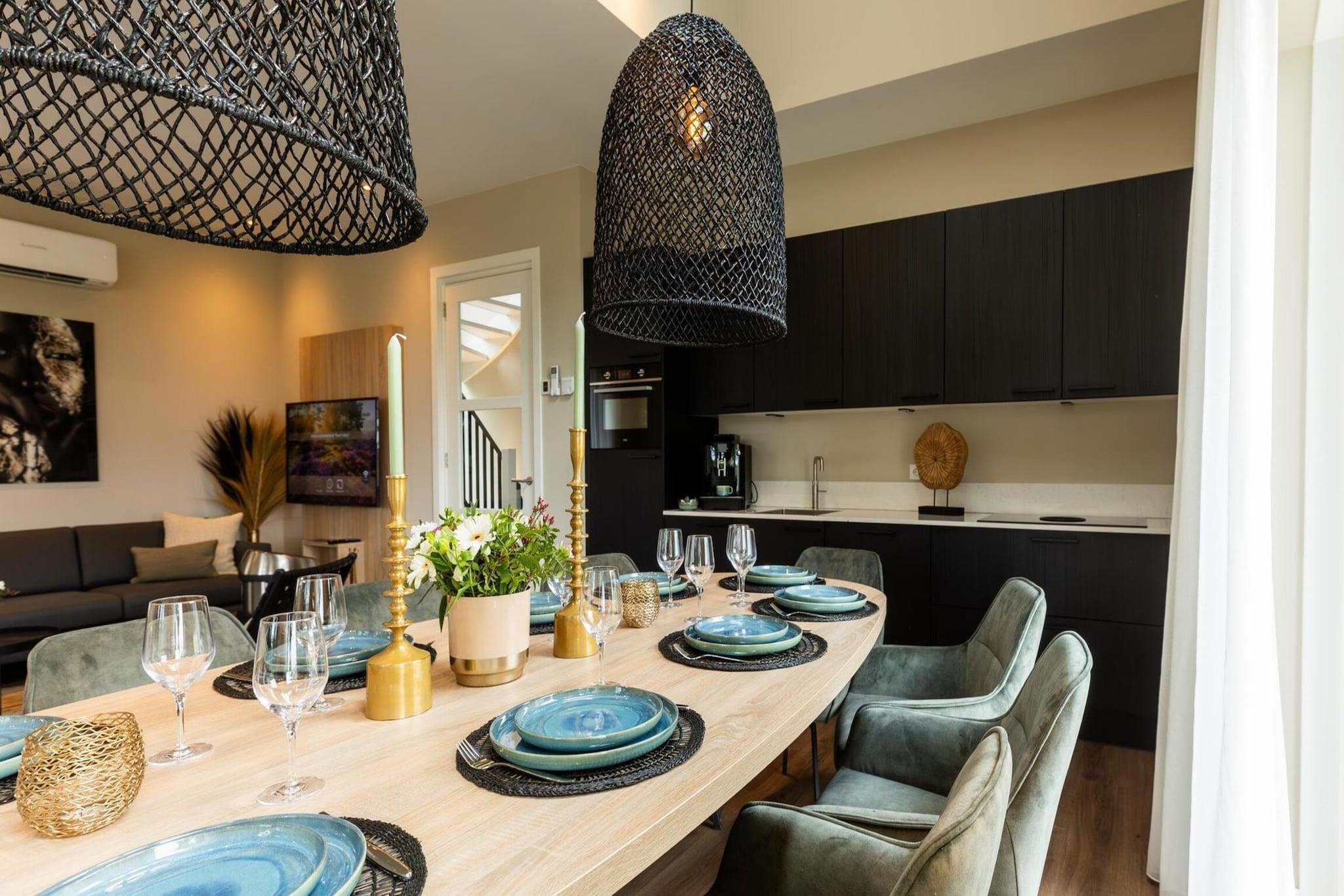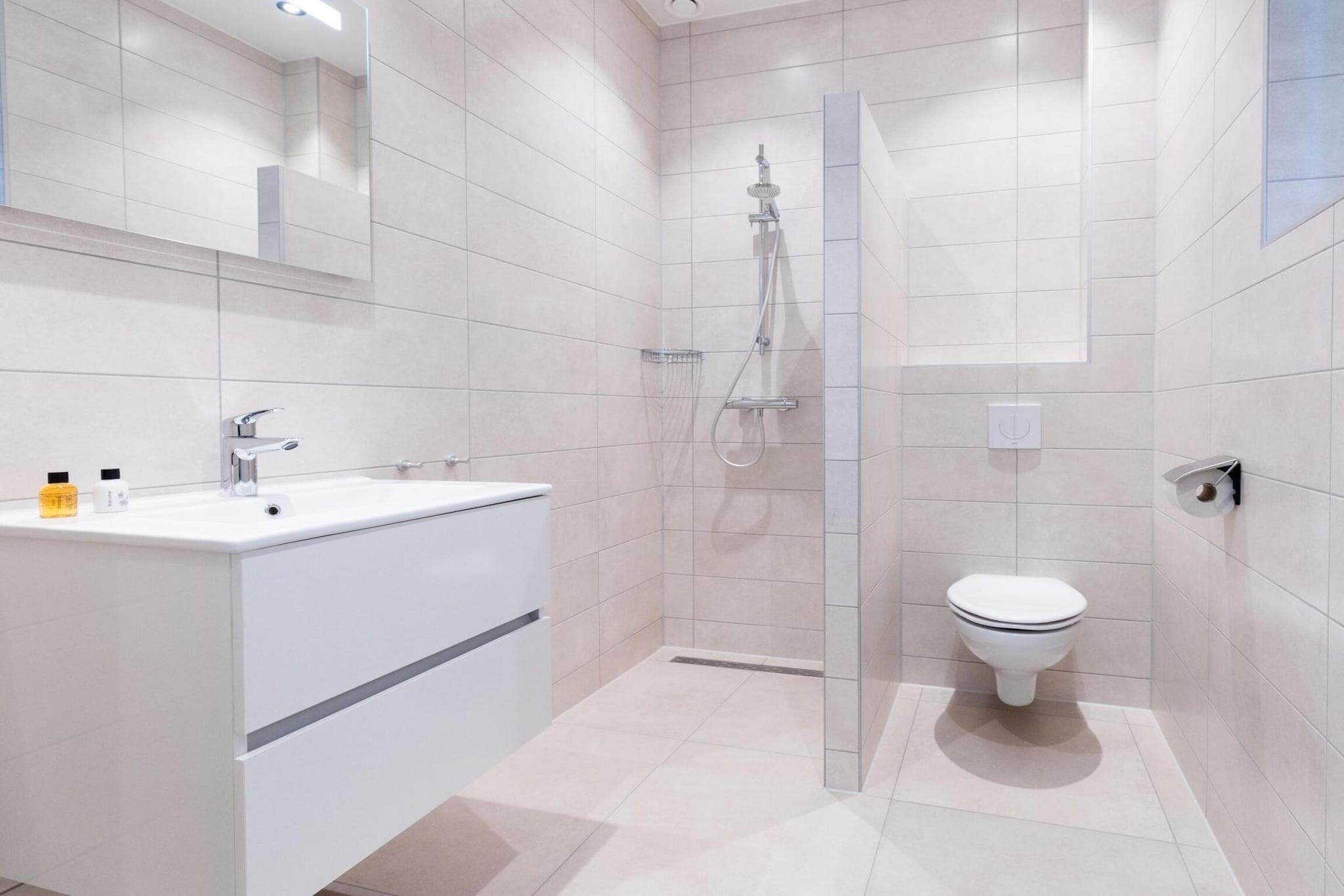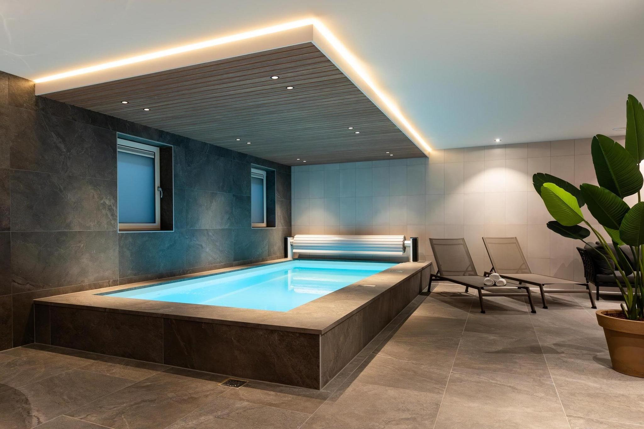 Stueetage: (Stue(sofahjørne), spisestue(spisebord), åbent køkken(komfur, kaffemaskine, ovn, mikrobølgeovn, opvaskemaskine , køle-fryseskab), Soveværelse med badeværelse(dobbeltseng, bruser, håndvask, toilet), Soveværelse med badeværelse(dobbeltseng, bruser, håndvask, toilet)) På 1. etage: (Soveværelse med badeværelse(dobbeltseng, bruser, håndvask, toilet), Soveværelse med badeværelse(dobbeltseng, bruser, håndvask, toilet), Soveværelse med badeværelse(køjeseng eller 2 enkeltsenge, køjeseng eller 2 enkeltsenge, bruser, håndvask, toilet)) Kælderetage: (hottub, bruser, toilet, solstole, private indoor pool)