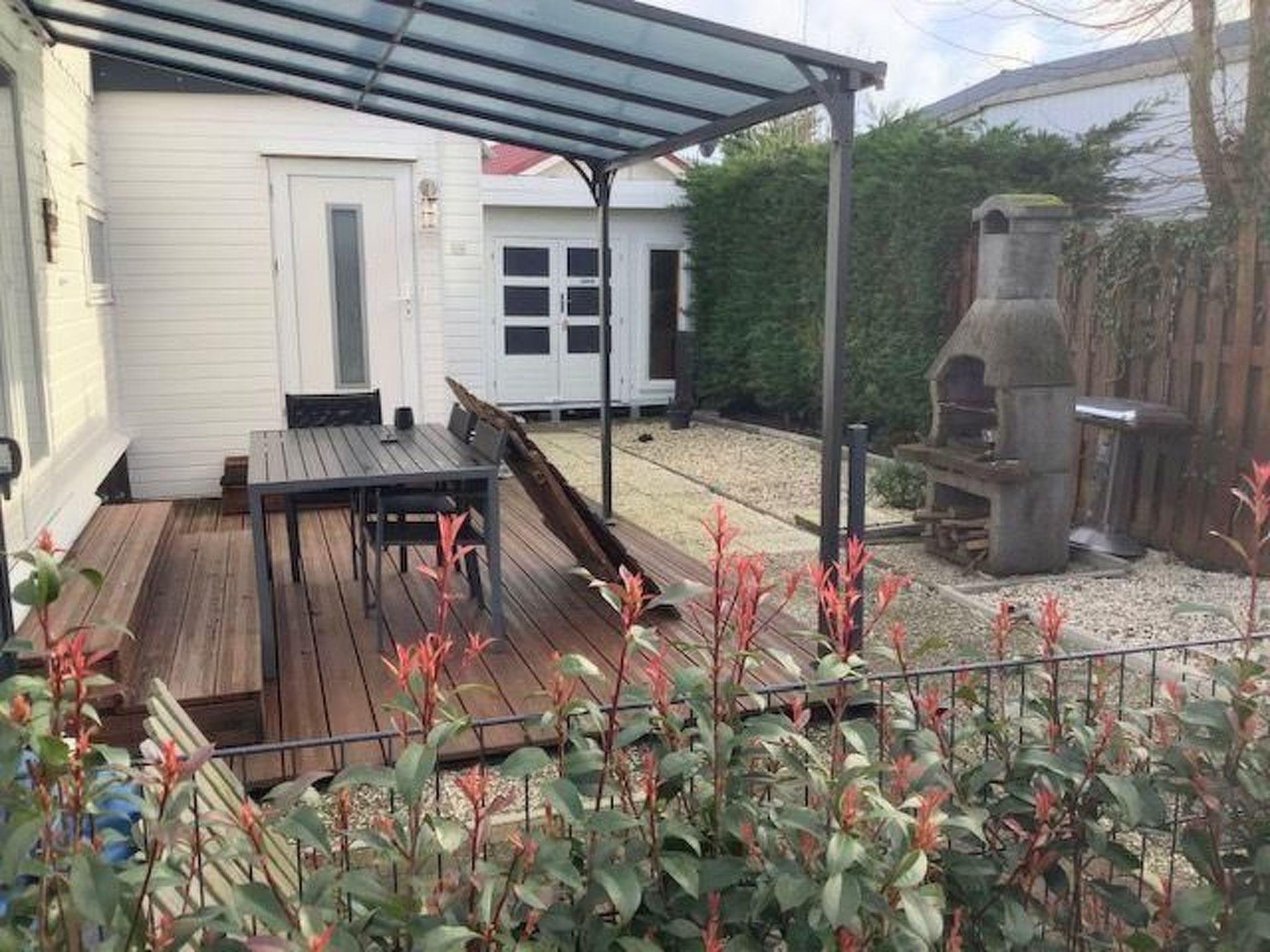 Table with 4 chairs, 2 sun loungers, parasol, small sandpit, parking space for bicycles