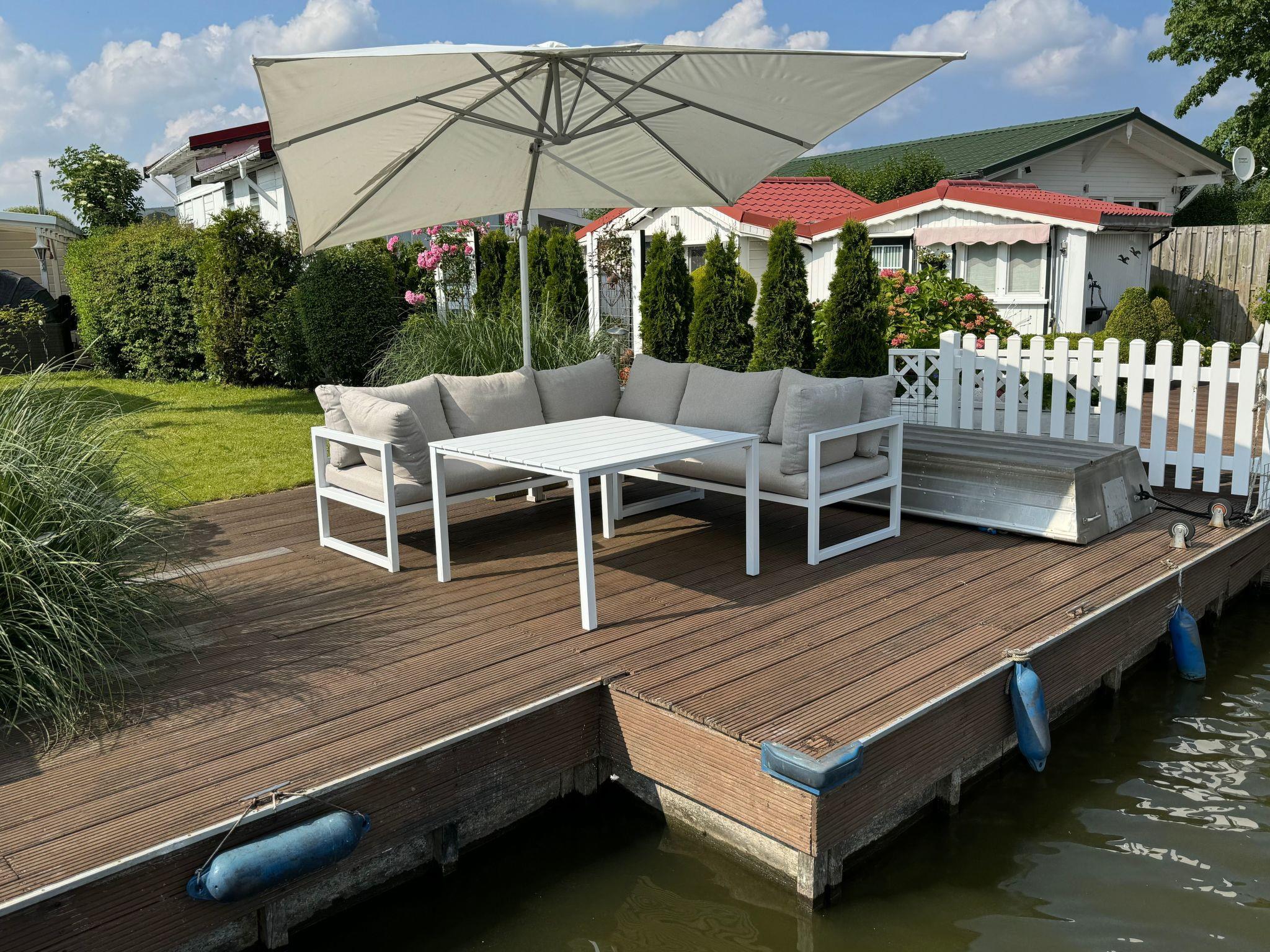 - Additional terrace with lounge furniture, coffee table and traffic light parasol on the jetty right by the water
