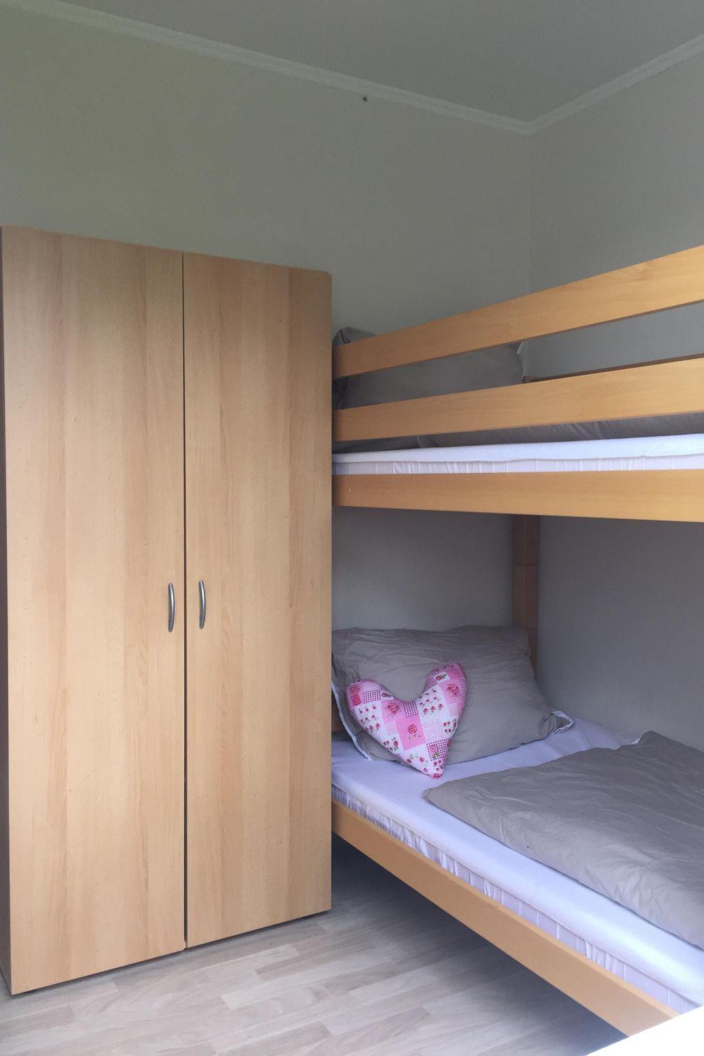 Bedroom 2 has a bunk bed, a wardrobe and a shelf with additional storage space. The sliding door leads to the sunny terrace, which invites you to relax with comfortable wicker furniture. There is a travel cot, high chair and plastic crockery for the little ones. The entire house has central heating. The house has a covered storage space for bicycles.