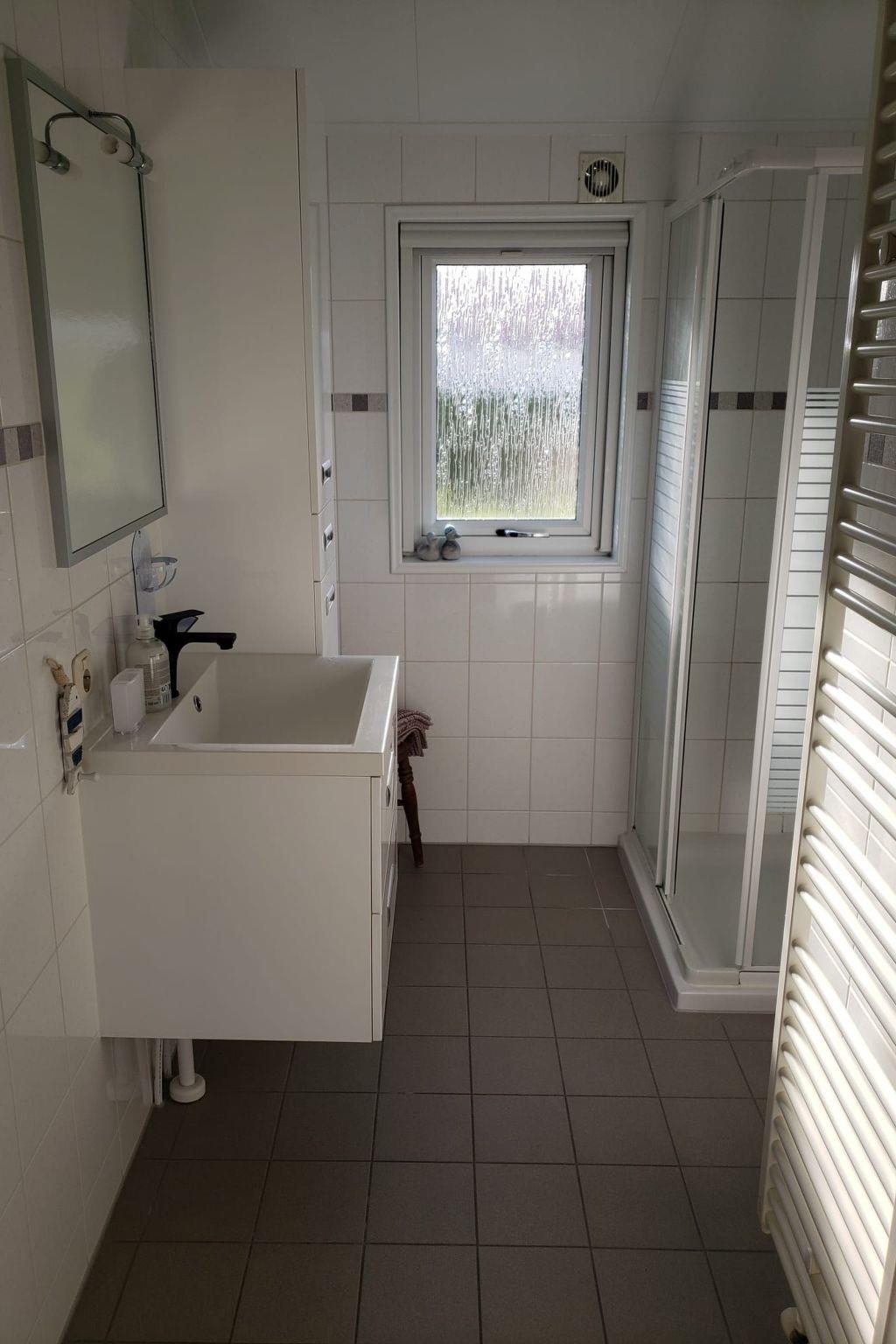Daylight bathroom with heated towel rail and large shower. Separate WC